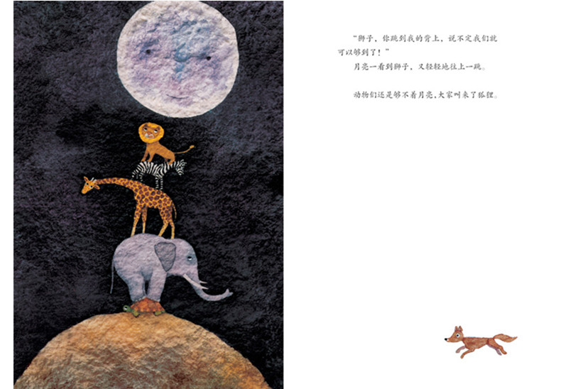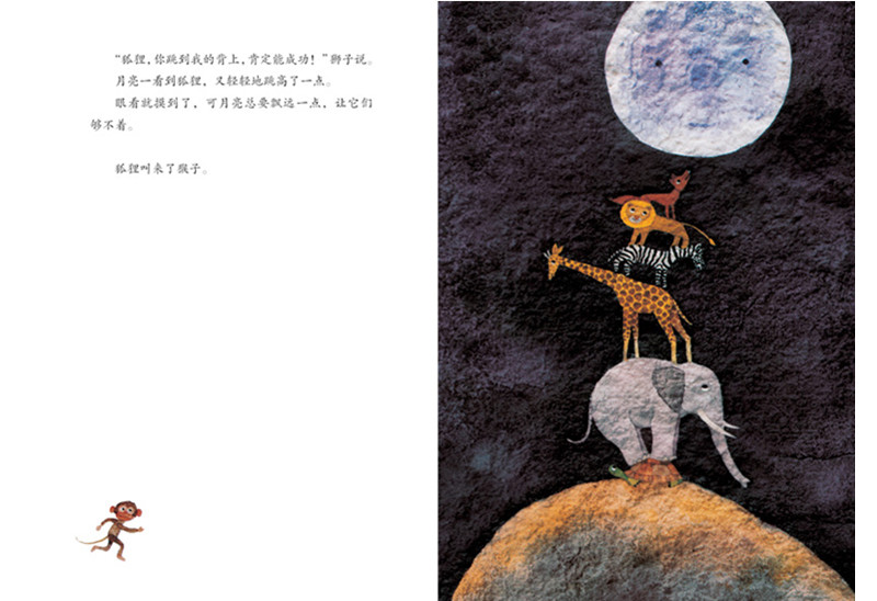 《月亮的味道》:月亮,是什么味道呢?真想尝一小口啊!夜里,动物们望着月亮,总是这么想。可是呢,不管怎么伸长了脖子,伸长了手,伸长了腿,也够不着月亮。有一天,一只小海龟决心去摸一摸月亮。可他够不着。海龟叫来了大象,大象叫来了长颈鹿,然后长颈鹿叫来了斑马,斑马叫来了狮子,狮子叫来了狐狸,狐狸叫来了猴子,猴子叫来了老鼠。月亮每次都伸高一点儿,让他们够不着。不过,这次月亮看着老鼠心想:“这么个小不点儿,肯定捉不到我的。”这回它没有动。想不到,“咔嚓!” 老鼠咬下一片月亮。它给动物们都分了一口月亮,大家都觉得,月亮和它们自己喜欢吃的东西是一样的味道。