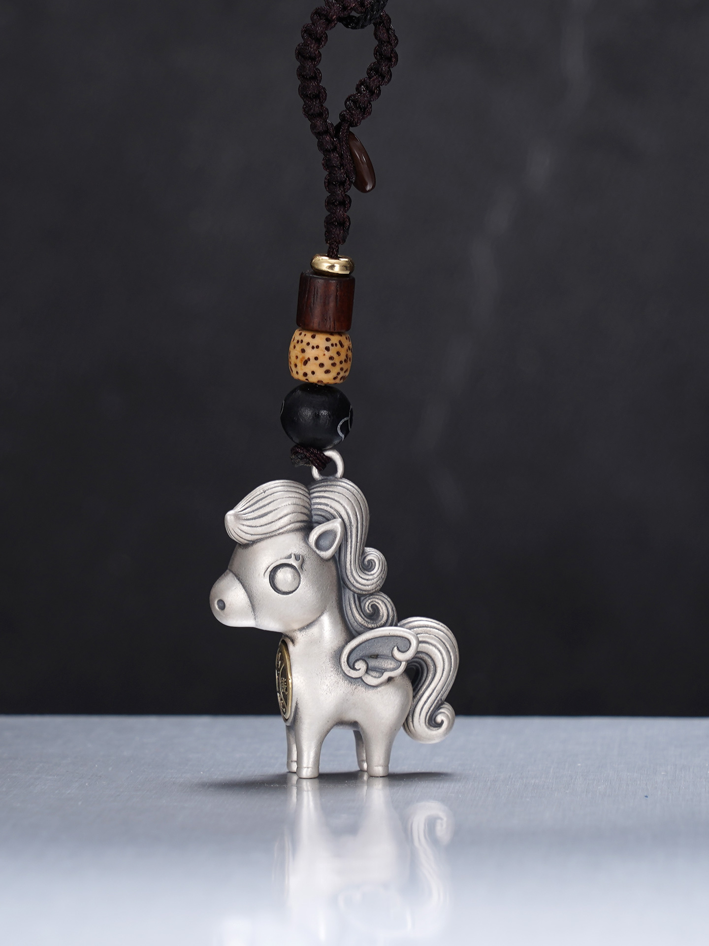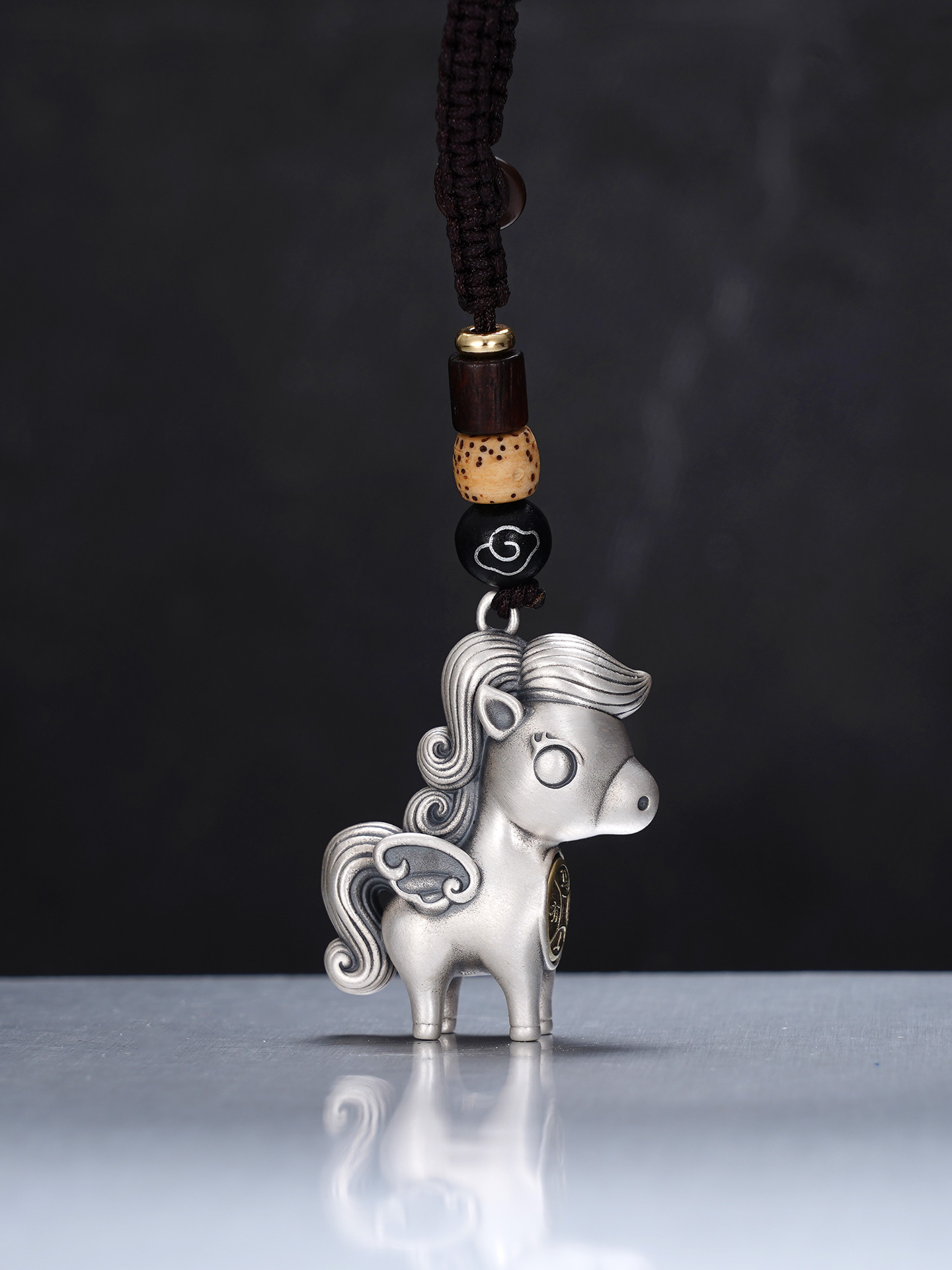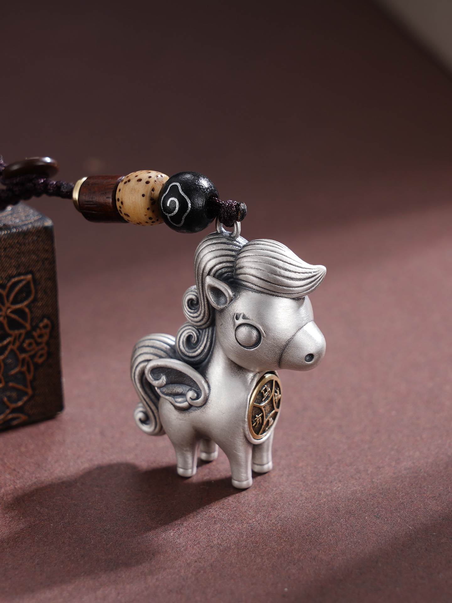 【寓意】:作品巧妙汲取“小马宝莉”灵动神韵,以纯银雕琢而成,铜钱镶嵌。寓意汲取小马宝莉自信勇敢、坚强独立的特质,助力佩戴者勇毅前行,福泽绵长。