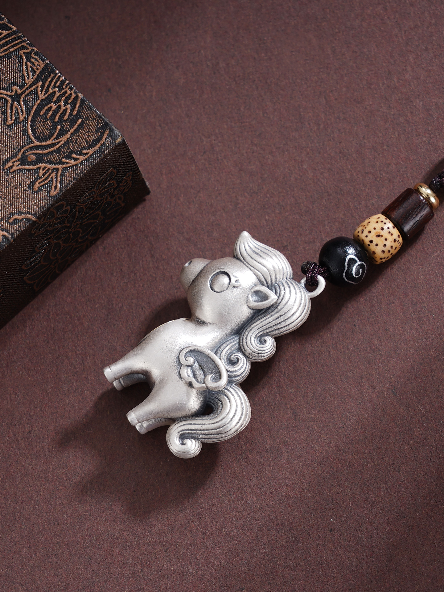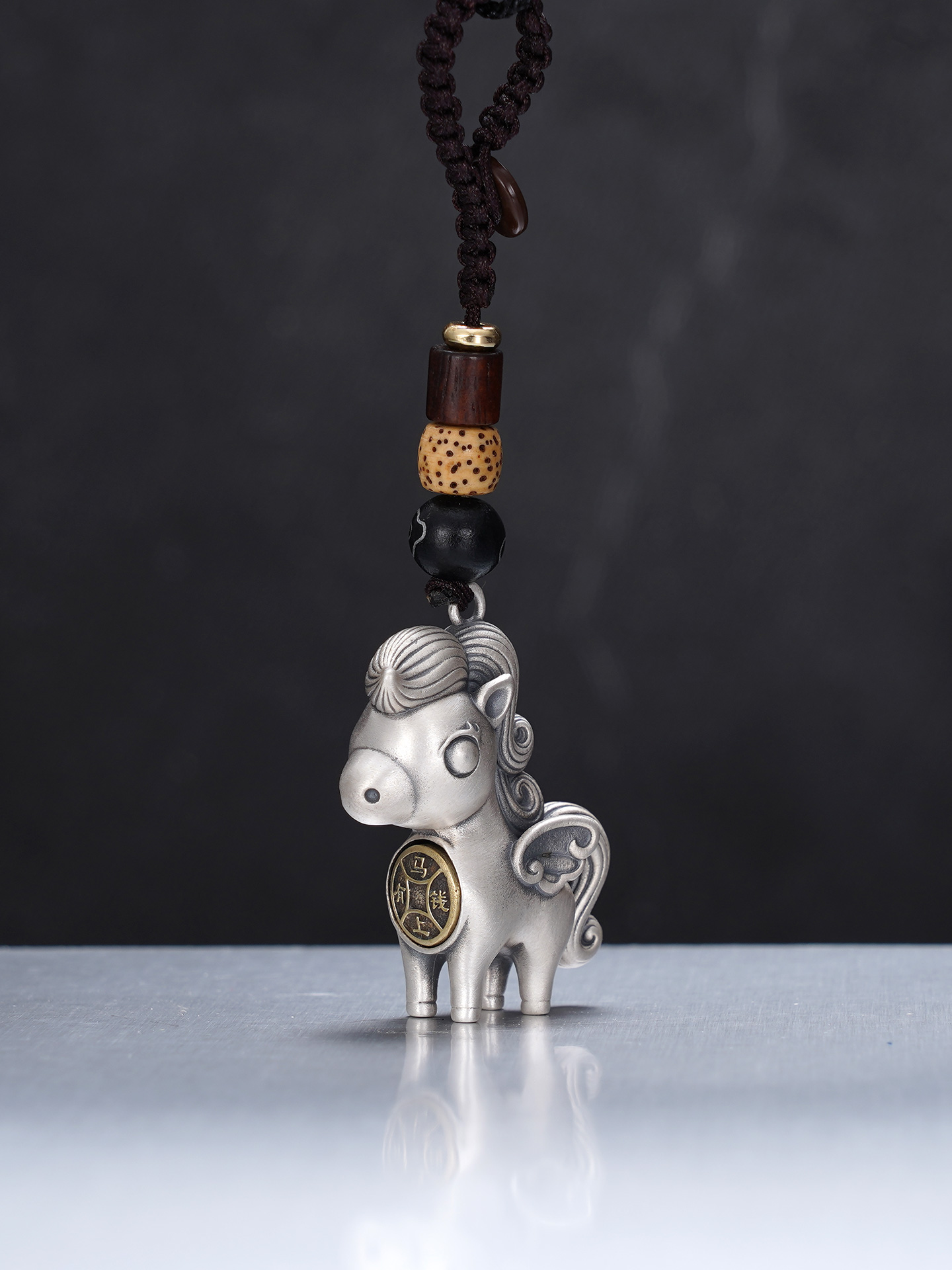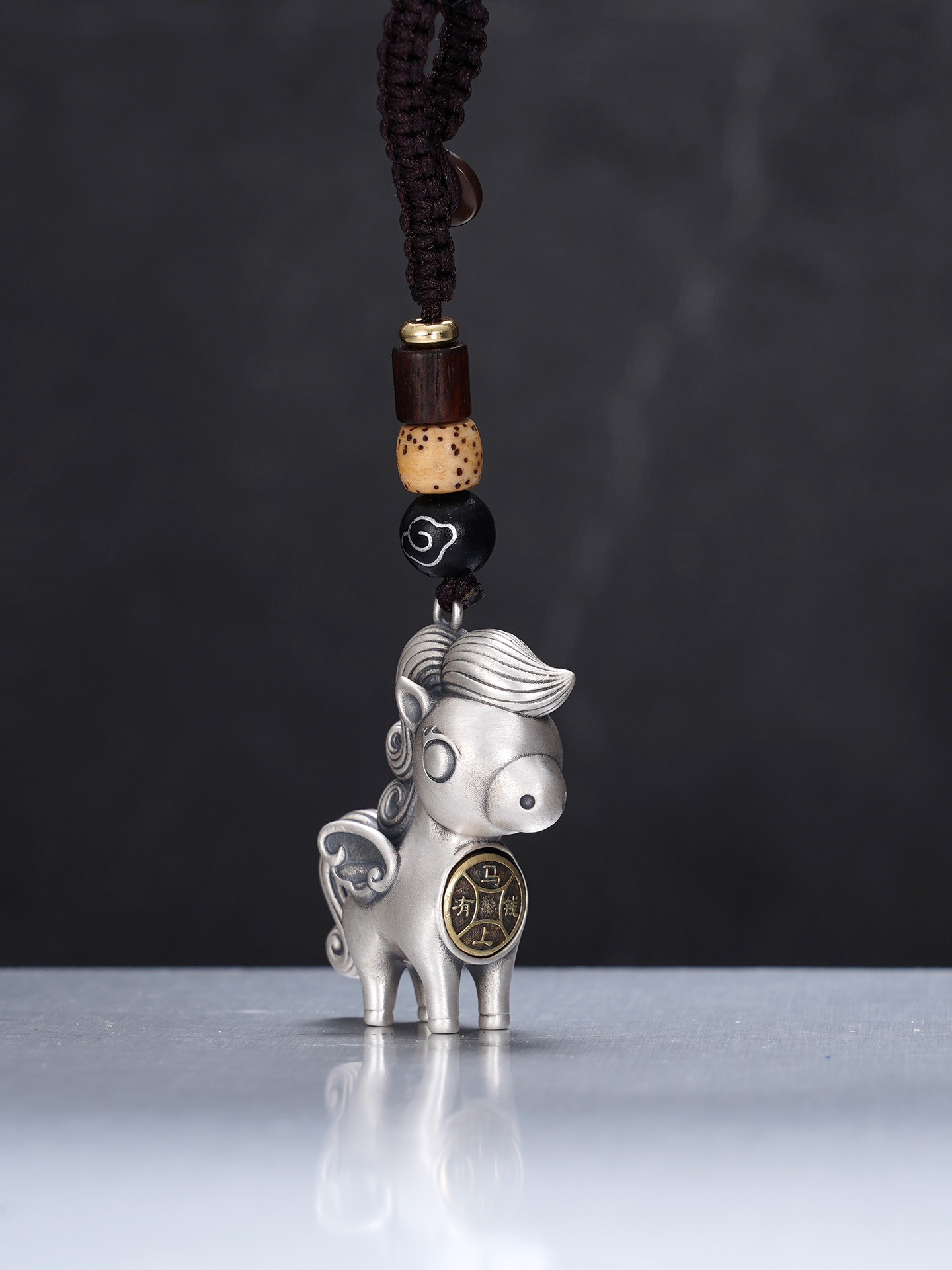 【寓意】:作品巧妙汲取“小马宝莉”灵动神韵,以纯银雕琢而成,铜钱镶嵌。寓意汲取小马宝莉自信勇敢、坚强独立的特质,助力佩戴者勇毅前行,福泽绵长。