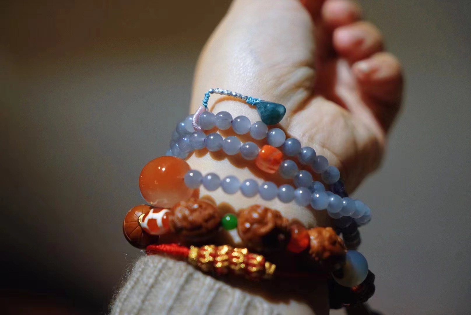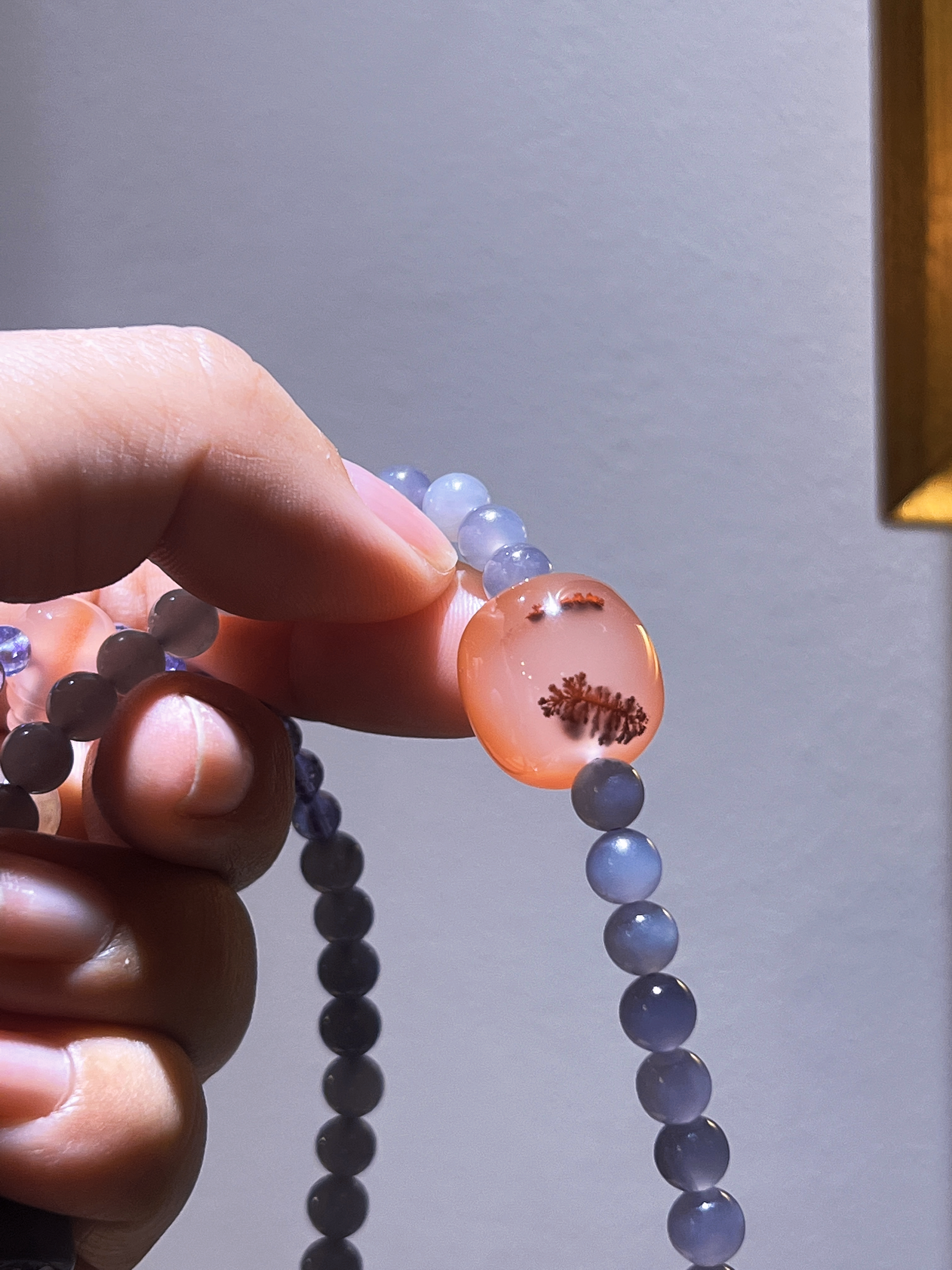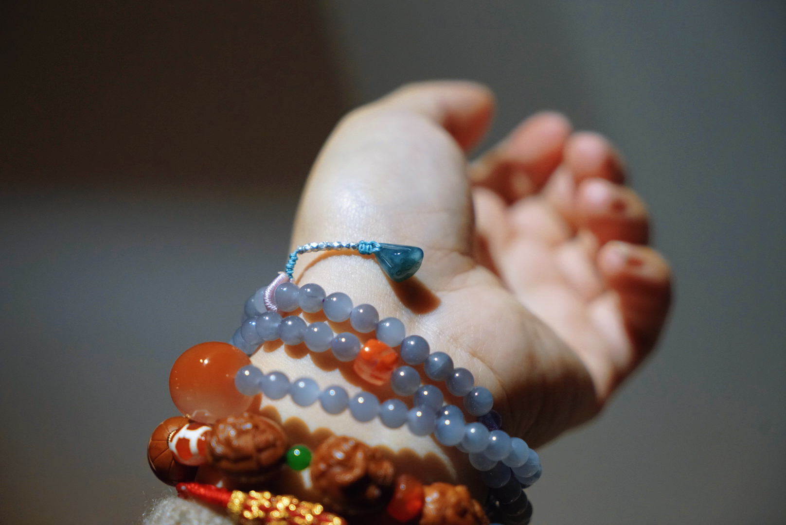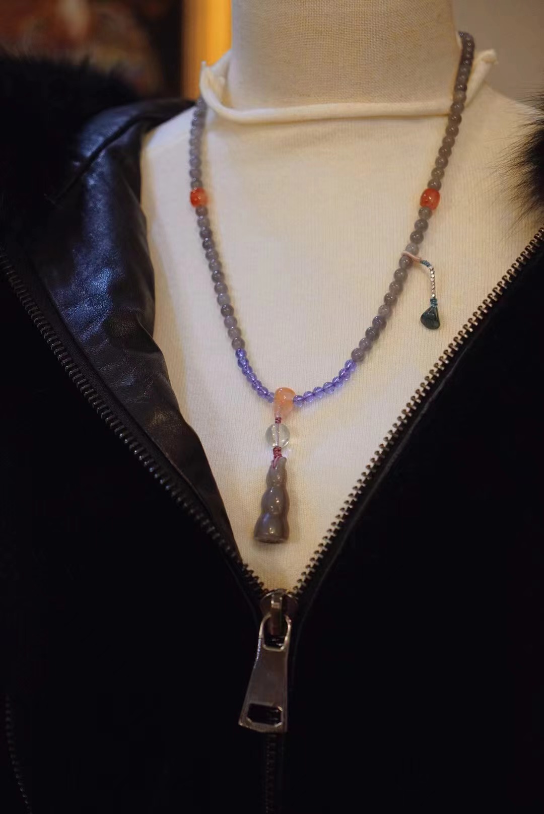 2024九紫离火运,人肯定是跟着运走,这条烟紫和田玉水头好颜色漂亮,搭配的南红也是万里挑一的大珠珠,双色意境感,一面是饱满的橘红,一面是梦幻般的意境~像是湖面上的莲叶~每一颗遇到都是缘分,每一颗都不一样。侧挂是蓝色碧玺莲蓬~