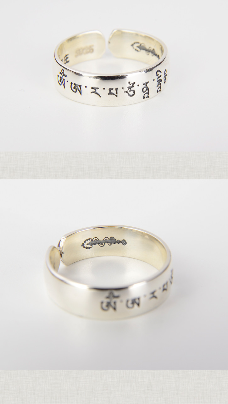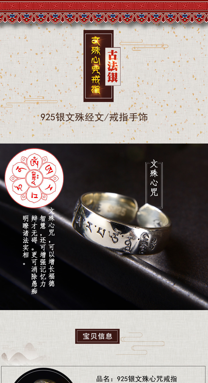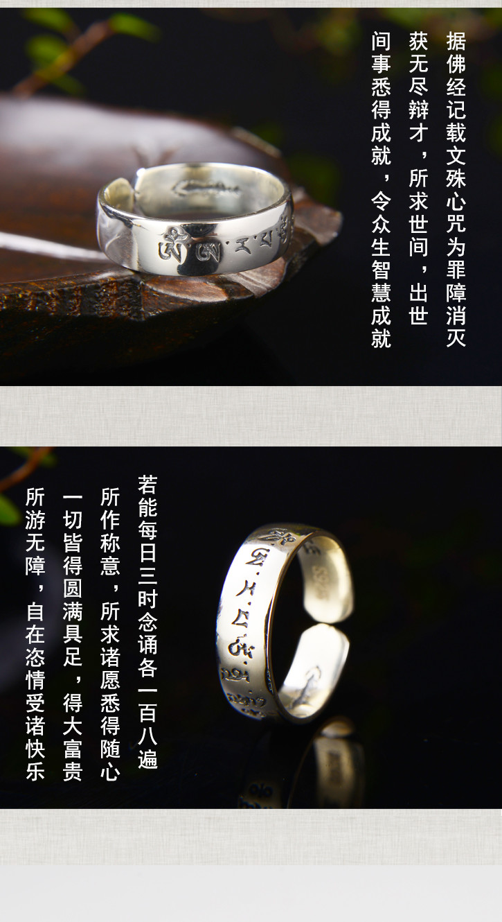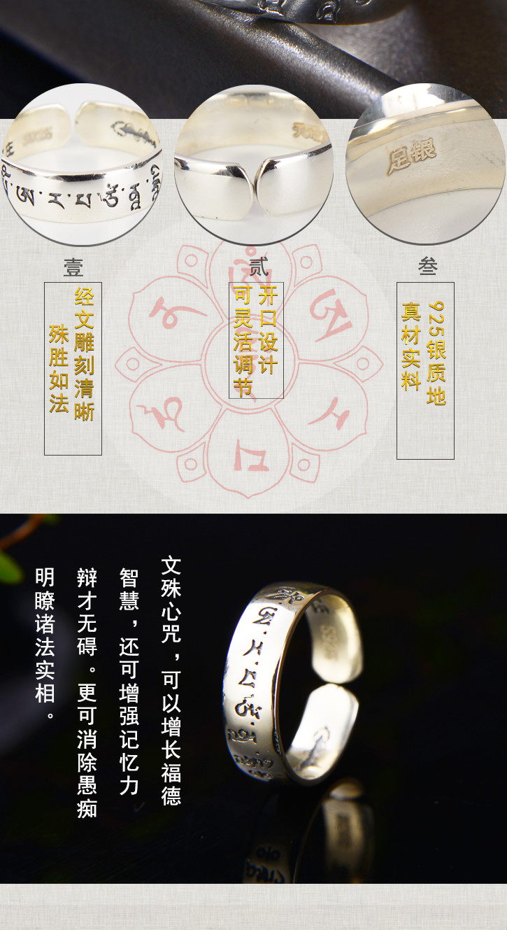 银古法银文殊心咒戒指纯银戒指文殊经文戒指男女款可调节