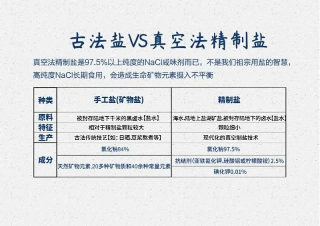 工业制盐的方式,也会使用同样的原材料,但是工业制盐为了满足量大价低,保证每一个人都吃得起盐。只提纯了氯化钠。其他的原材料里面富含丰富的微量元素一起被清理了。工业的制盐是排除法,只要什么,其他的都不要。这种盐也就是超市的咸味剂,具备调味功能。满足基本的调味需求。如果对健康有更高的要求。自然是选择非工业生产的传统制盐。咸入肾经,自然原料加上古法制盐才能对肾阳有滋养。否则就是加重肾脏负担。
