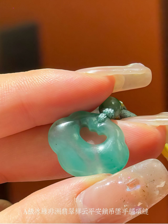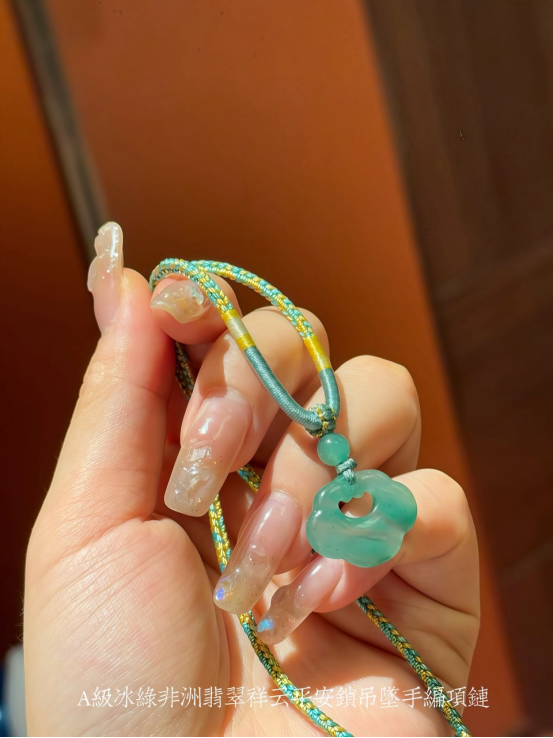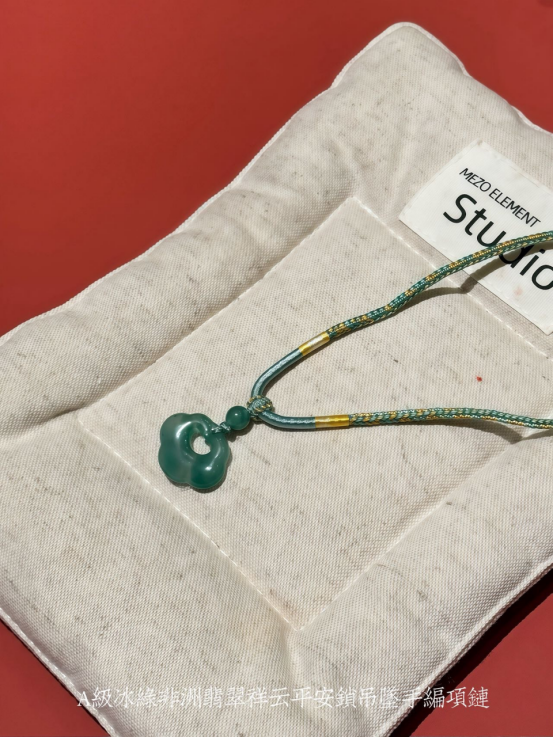 A级冰绿非洲翡翠祥云平安锁吊坠手编项链