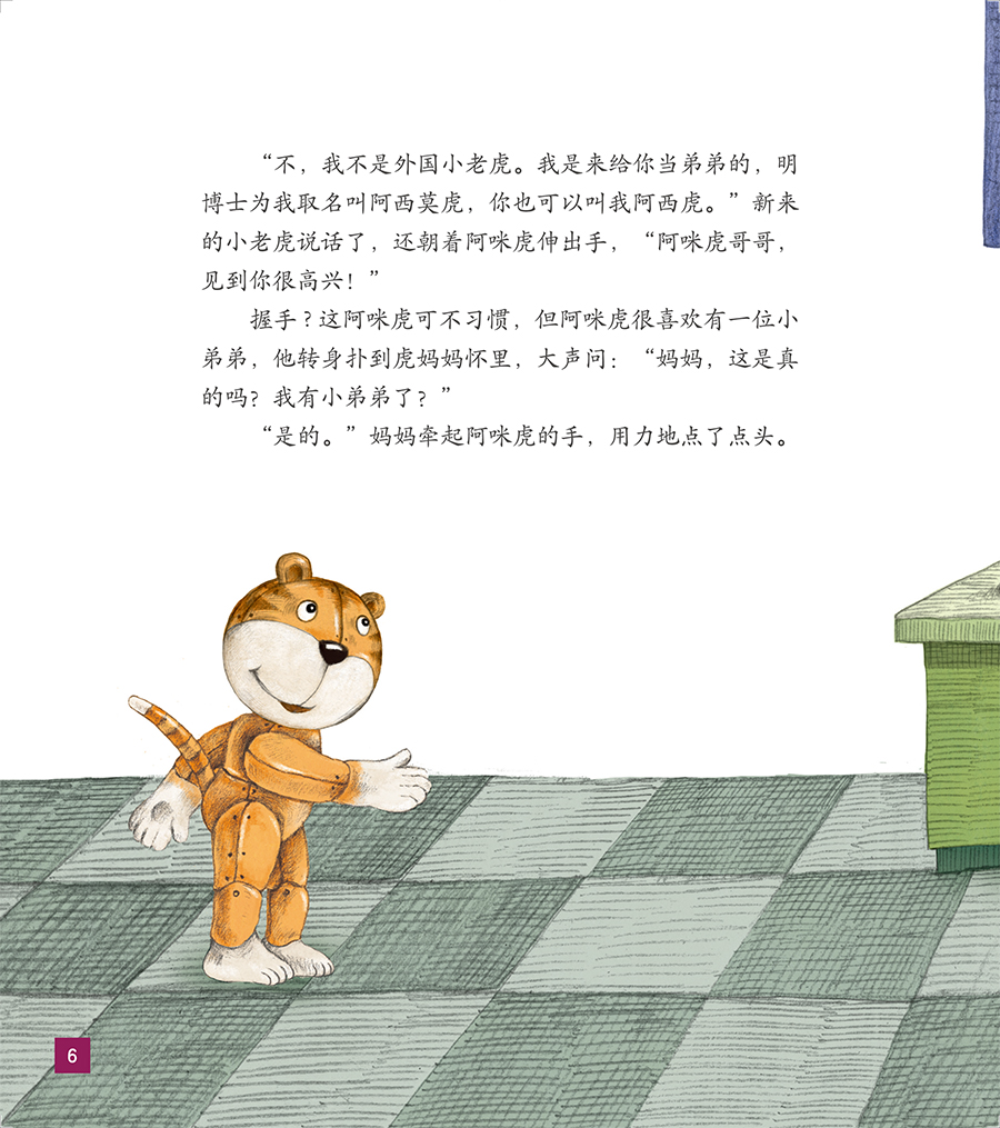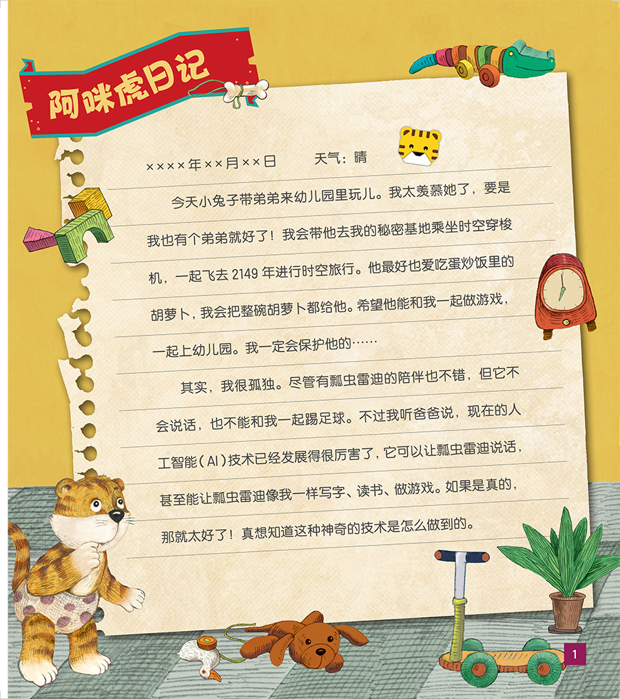 图书形式:图文并茂的绘本故事。以小朋友喜爱的小老虎为切入点,讲述阿西虎的由来及AI机器人的相关知识。故事幽默有趣,与孩子的生活息息相关。主人公阿咪虎和机器人弟弟阿西虎在生活中遇到了很多好玩儿的事,让孩子在故事中了解人工智能,对科学技术的发展产生兴趣,可供亲子阅读。