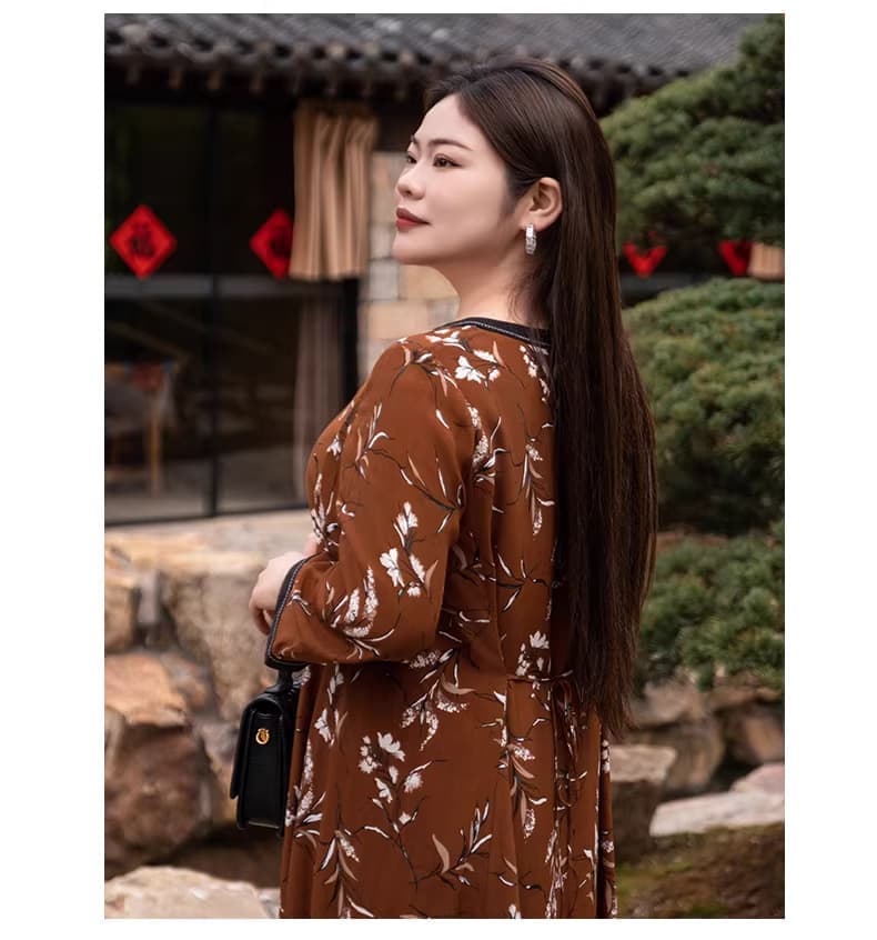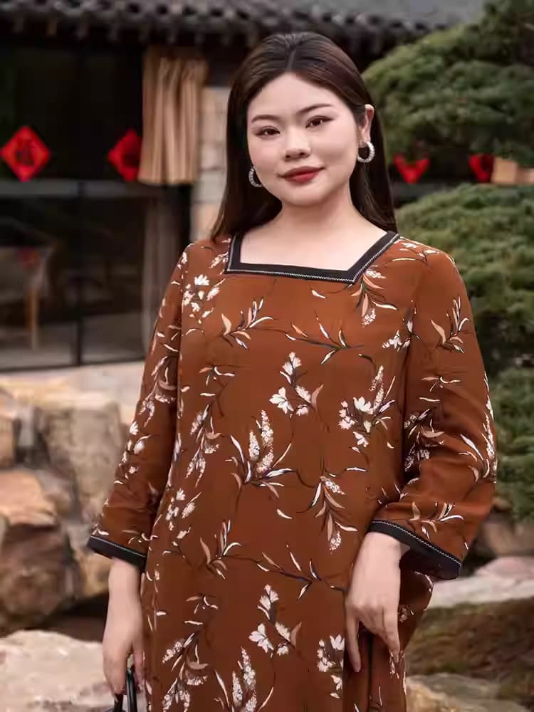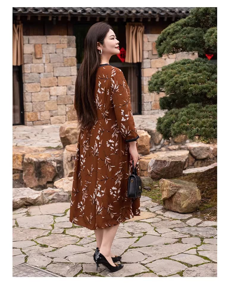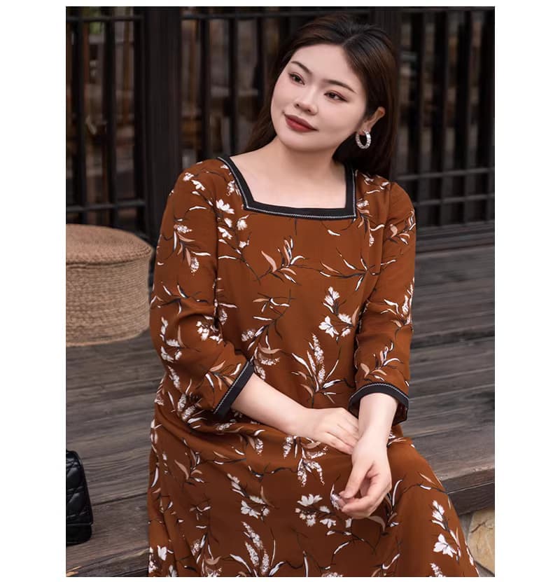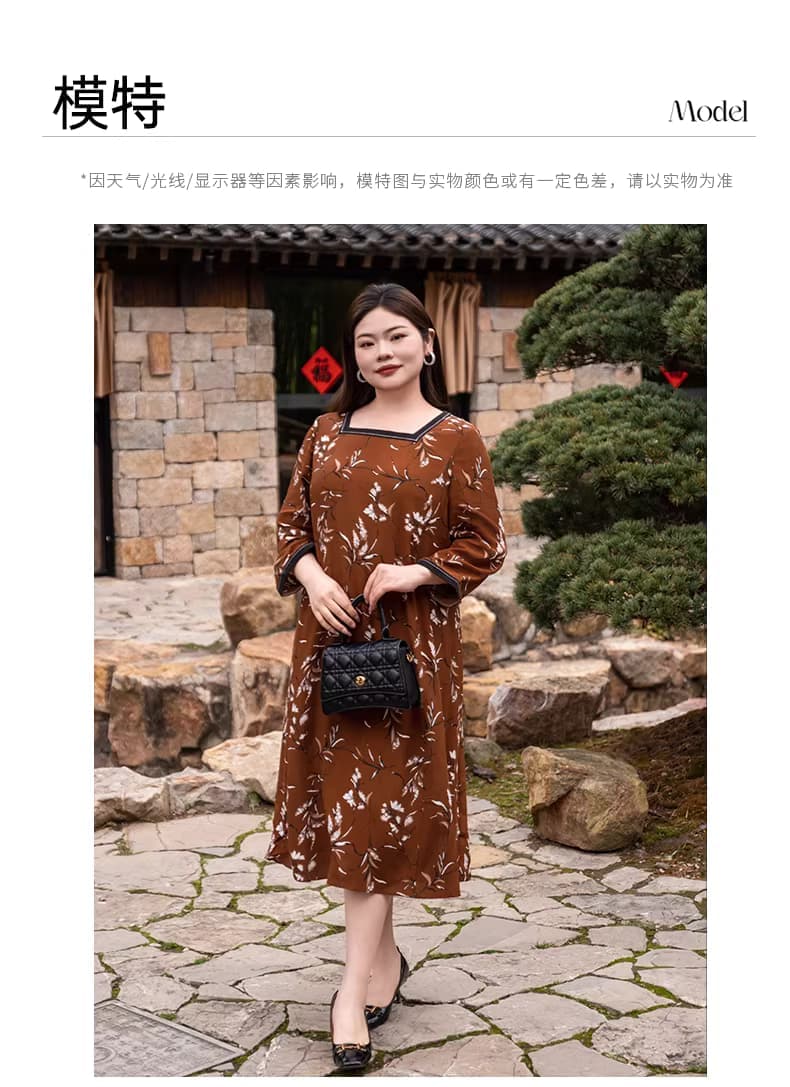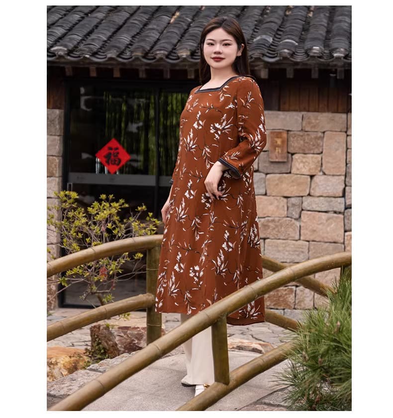 【群内福利】【方领中长裙】复古新中式方领中长裙,焦糖色人棉,印花既不张扬也能衬托肤色,同时自带显白滤镜