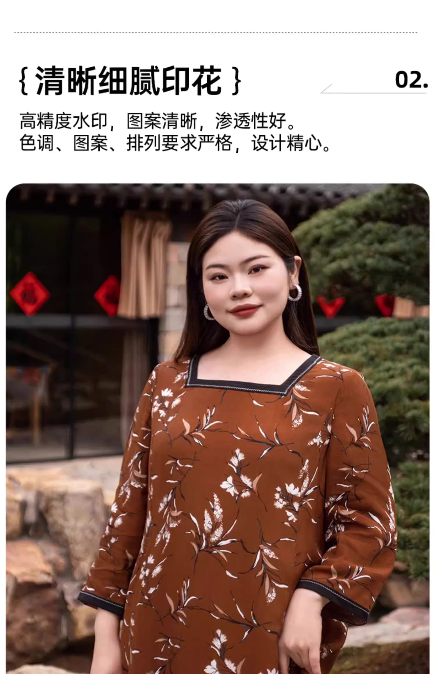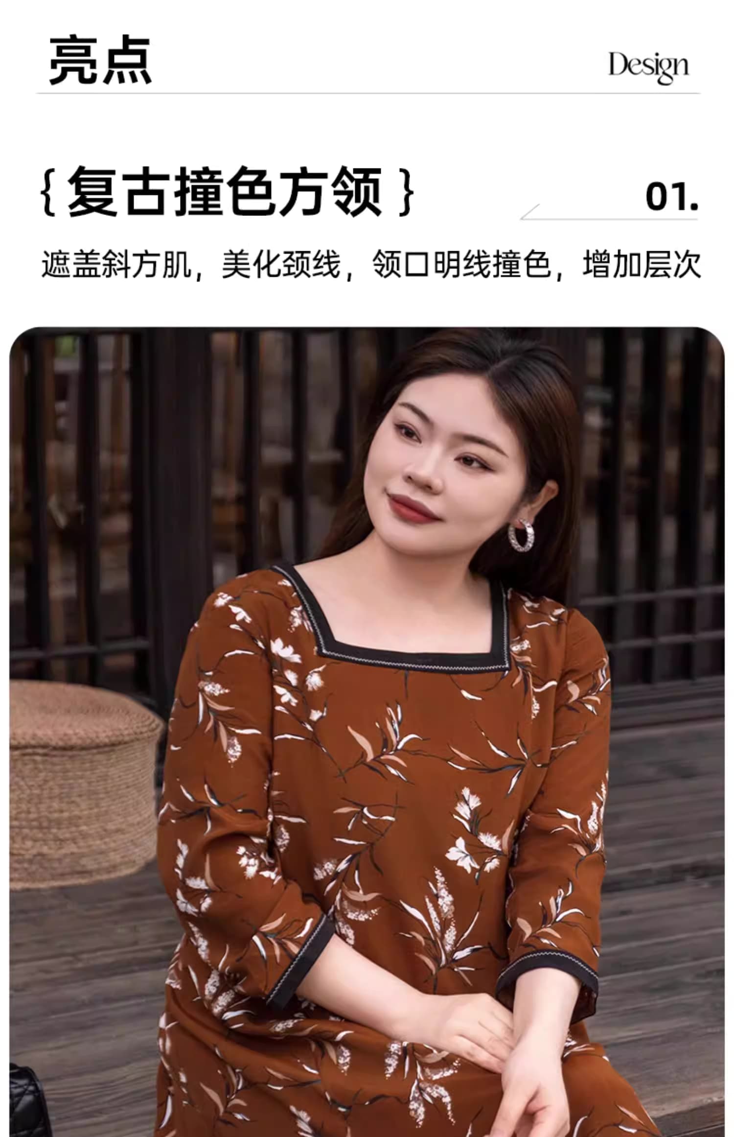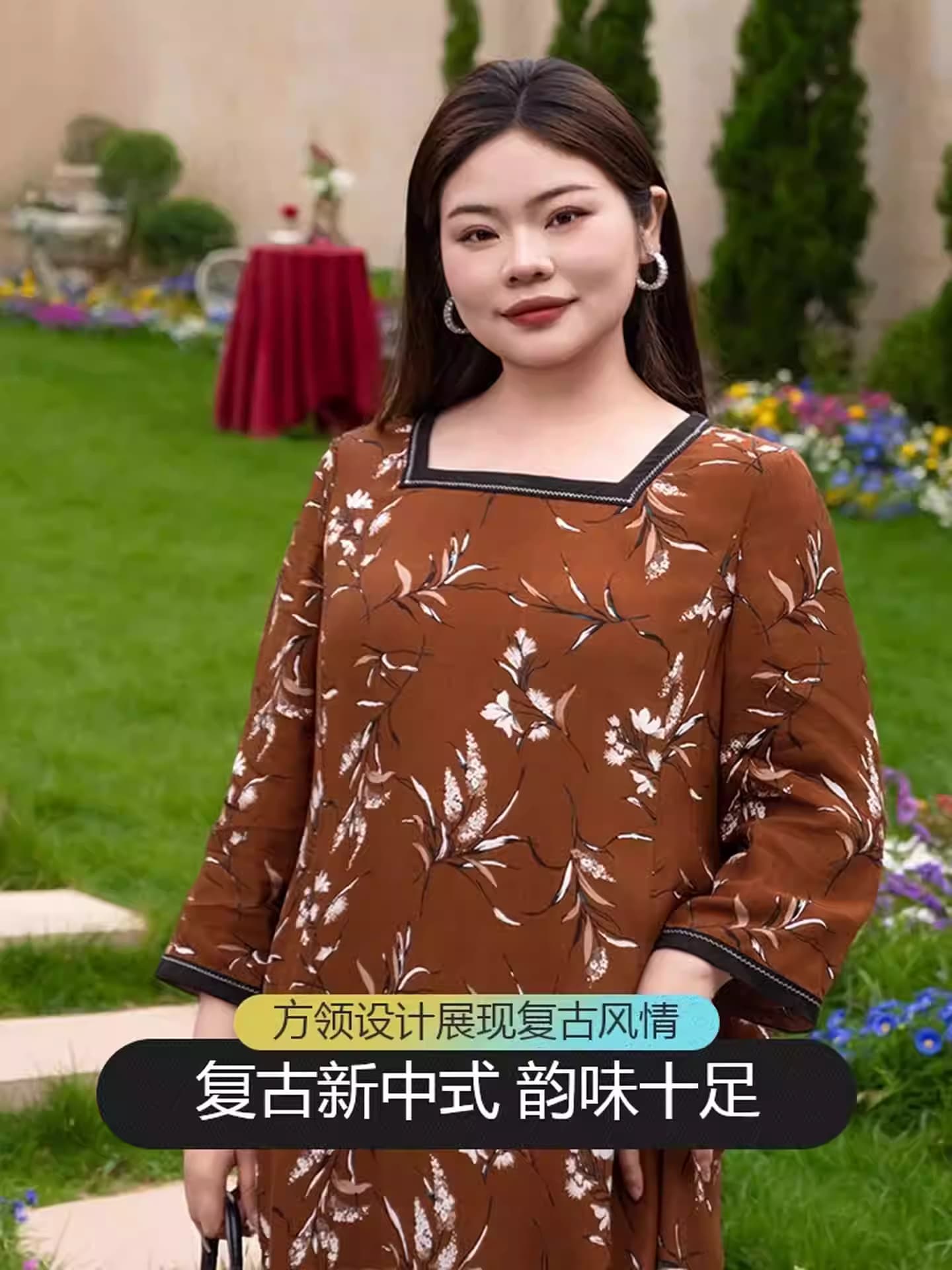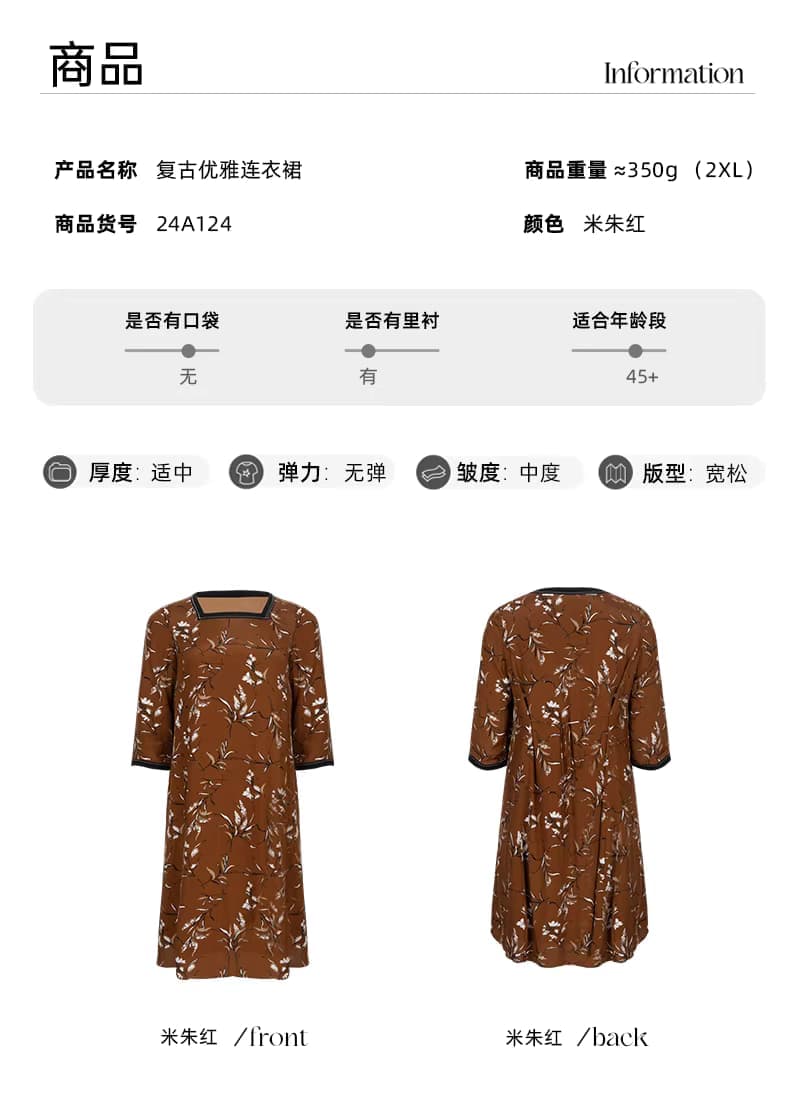 【群内福利】【方领中长裙】复古新中式方领中长裙,焦糖色人棉,印花既不张扬也能衬托肤色,同时自带显白滤镜
