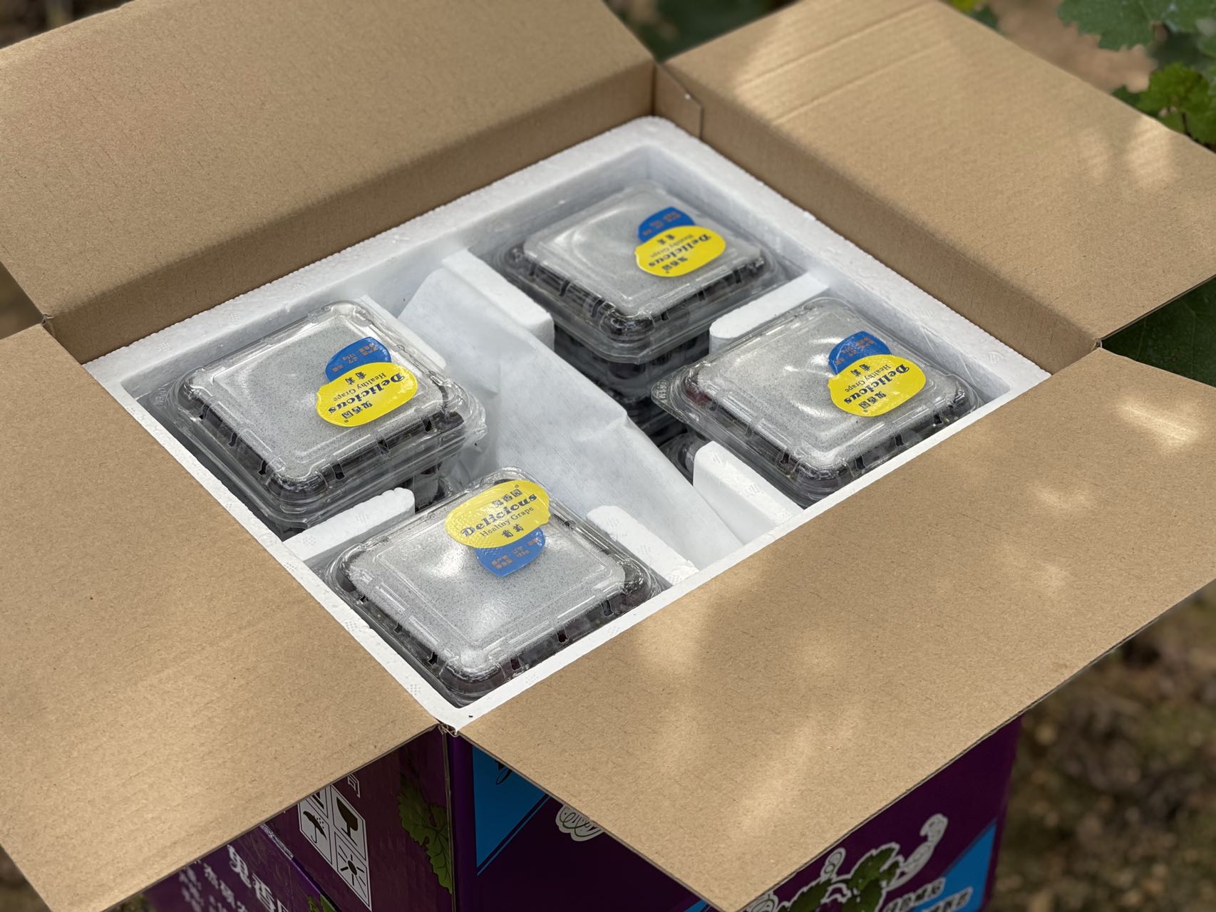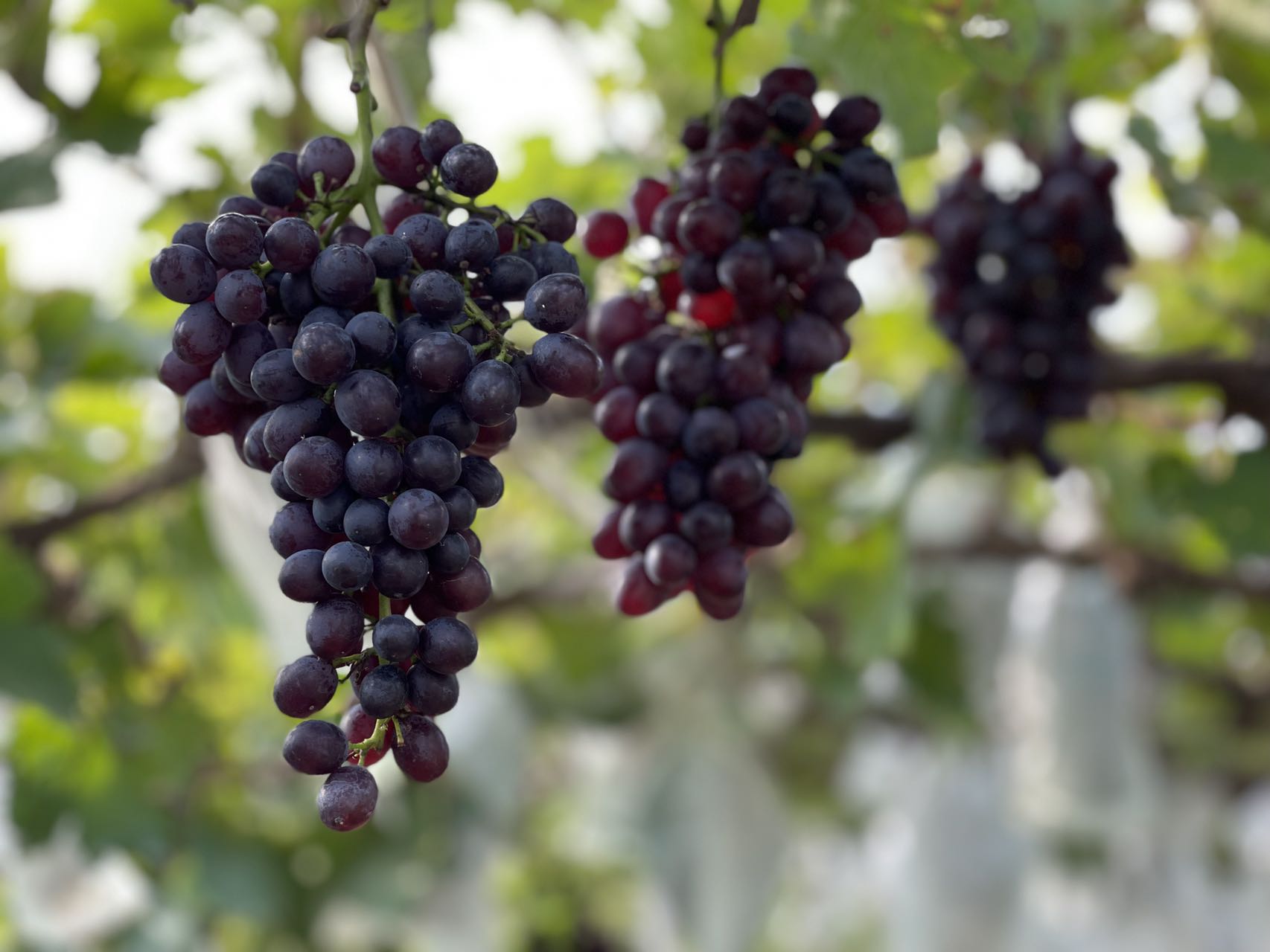 4、套袋种植:市场中流通的大部分玫瑰香葡萄都是非套袋种植的,非套袋种植的玫瑰香经过自然风吹雨淋,蚊虫污染,果皮会偏厚,带有涩涩的口感,而我们所有的果实开花坐果期后都会套袋种植,避免风吹雨淋,蚊虫污染,果实直至自然成熟为紫黑色或深红色,糖度度值达到21℃以上(超过市场流通的玫瑰香糖度4~5℃)才会提供给消费者,自然成熟套袋的玫瑰香葡萄果皮很薄,没有涩涩的口感,果肉紧实香甜,玫瑰香味纯正;