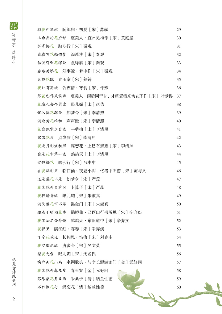 《绝美古诗绝美词:词中之花(楷书)》是时代文艺出版社联合有名书法家田雪松老师共同打造的一本国学硬笔书法习字字帖。作者精心编选带有“花”的优美词句,参考《唐宋词鉴赏辞典》《元明清词鉴赏辞典》《全宋词》等,力求内容真实准确,并由田雪松老师亲自书写汉字。内容丰富且深富意境,版式编排精美、新颖。田雪松老师温润灵秀的书法汉字与古诗中撷取的富有“花”之神韵的词句结合,让人看起来赏心悦目,学起来容易掌握,更能于深远意蕴中习练书法,真是妙不可言。