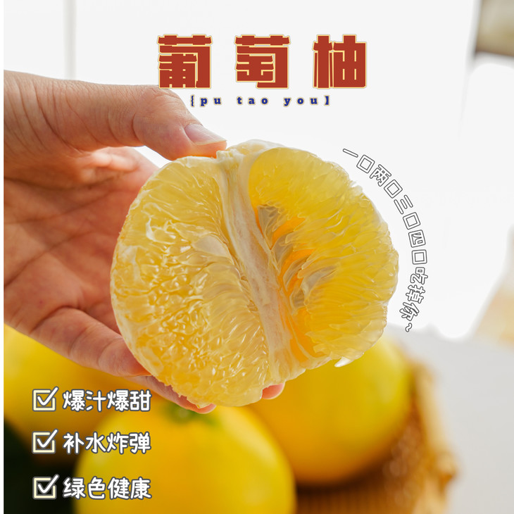 秋冬吃柚,赛过吃肉😺 换季易燥易上火、秋冬不爱喝水的一定要试试! 满满VC能量🍊补水首选‼️ 果皮超级薄,轻划一刀,满溢的汁水就飙一手🤩 超级好吃的“水炸弹”! 颠覆你对柚子的认识 清甜多汁,嫩过“豆腐西施” VC丰富还养颜轻脂,富含叶酸营养丰富 果肉细嫩无渣,一捏下去全是汁水 好吃又下火,让你吃出贵族般的享受 没吃过的一定要尝一尝!‼️ 和一般的柚子不同,葡萄柚个头娇小,和西柚差不多, 即使一个人,也能轻松吃掉两颗。