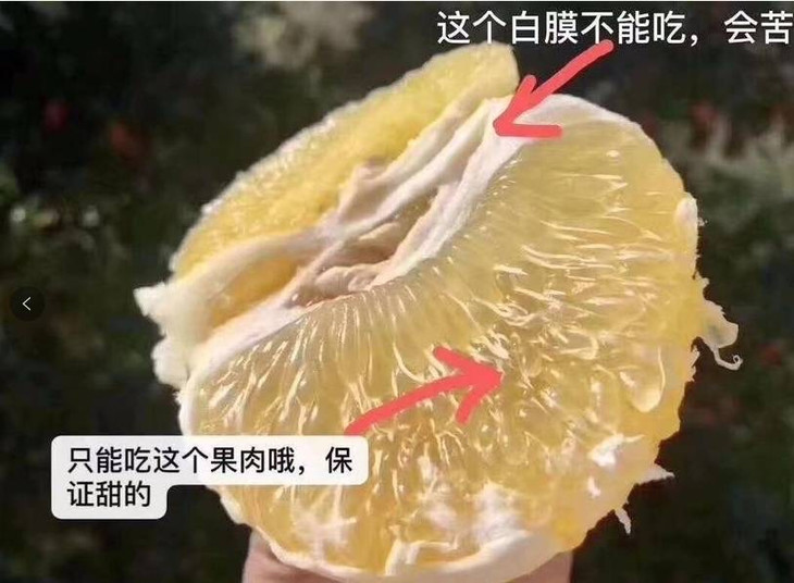 小贴士⚠️⚠️⚠️ 吃葡萄柚的时候一定要用剥的,(剥好记得洗手哦)吃的时候也要仔细点,皮剥干净吃,单纯吃果肉是甜的,带皮(白膜)吃会苦的哦! 科普:为什么有人说葡萄柚又涩又麻;那是因为顾客吃到那层白色膜,还有手上染到皮上的汁,没有及时洗干净;【切记不要吃到膜,把肉撕下来吃味道最好,因为膜是苦的】