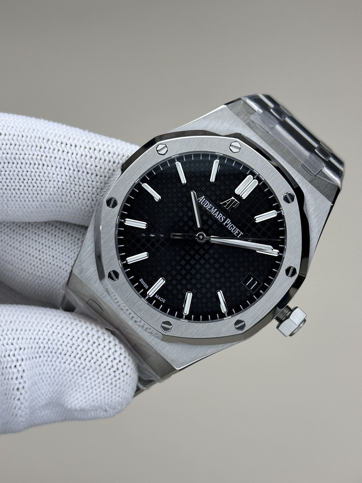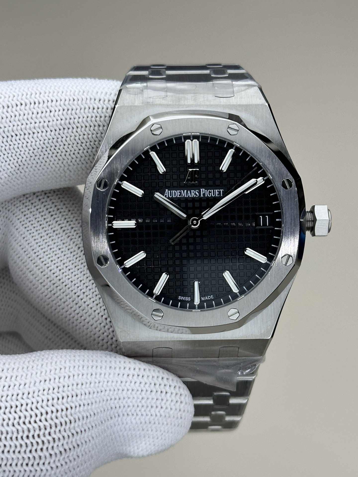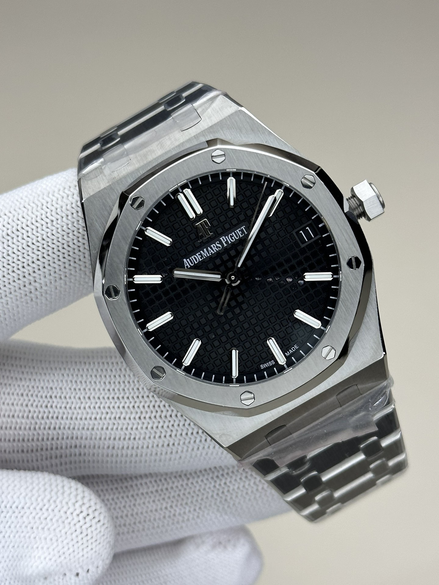 ZF爱bi皇家橡树15500系列 采用9015机芯改爱彼CAL.4302一体机!尺寸为41X10.4毫米与正品一致!男士腕表,精钢表带,自动机械机芯,透底。
