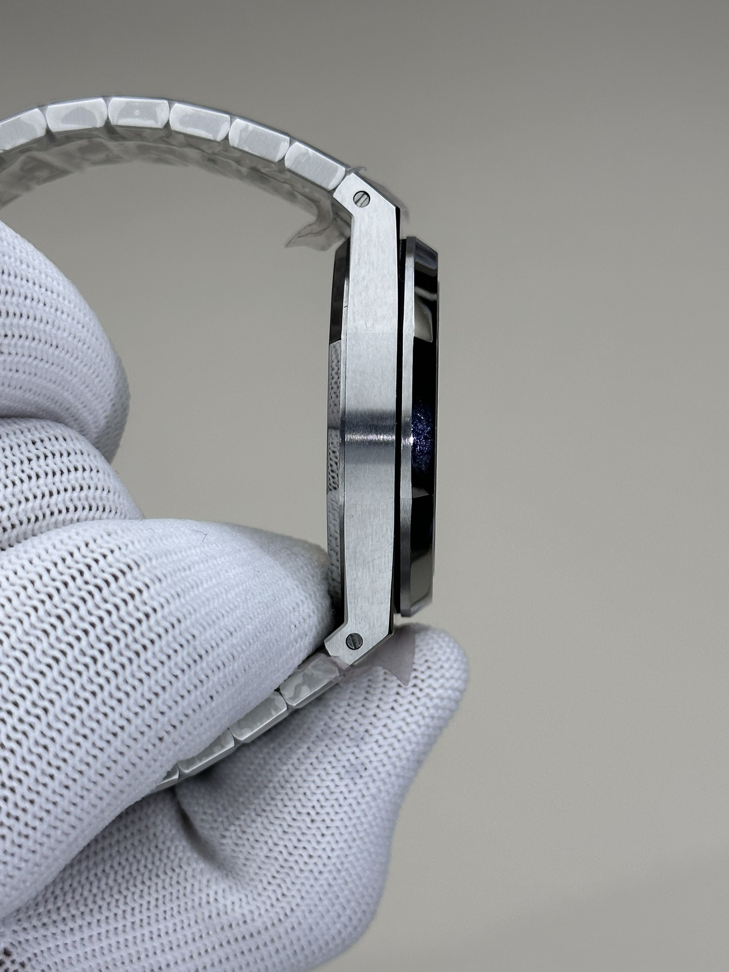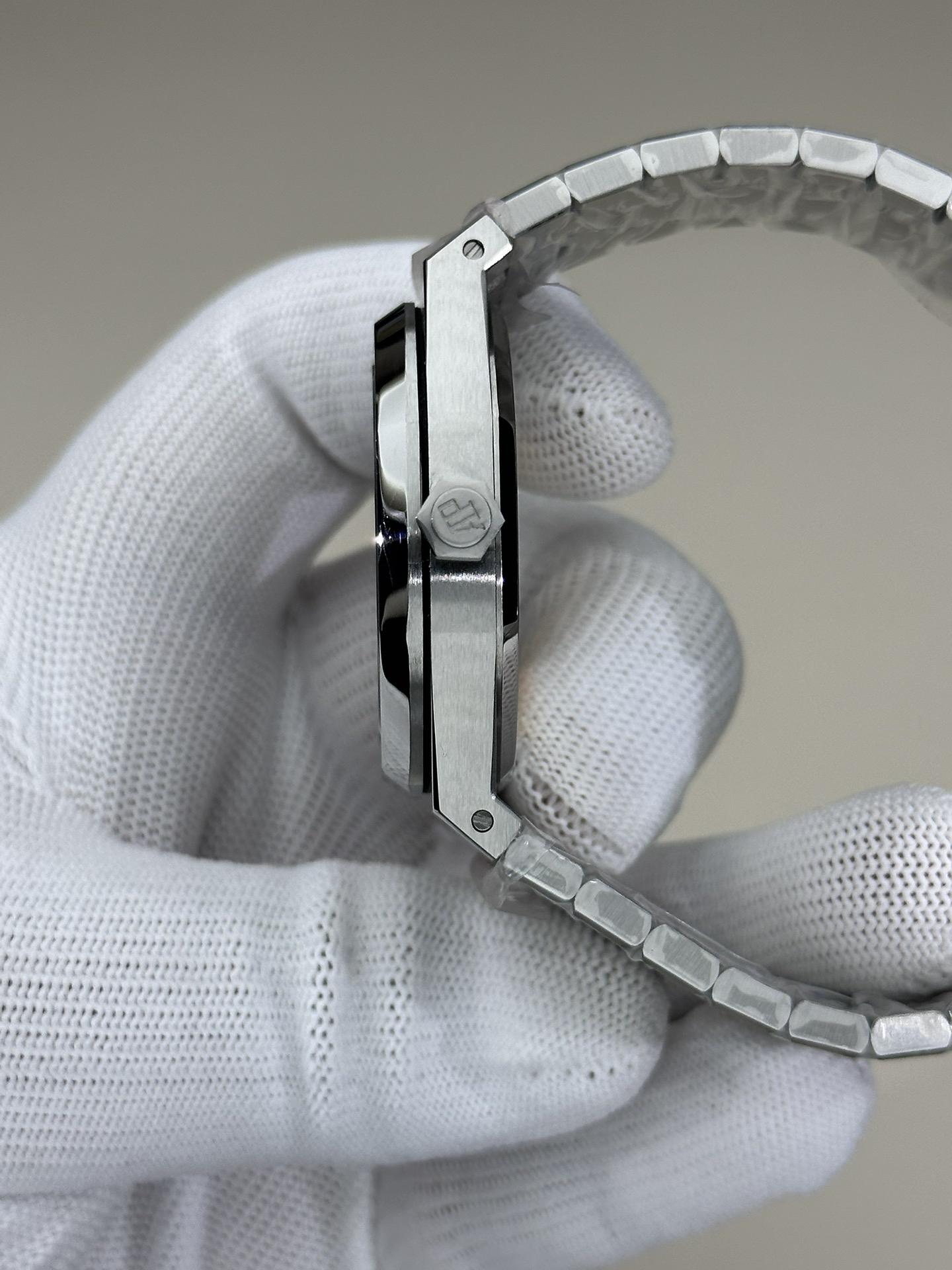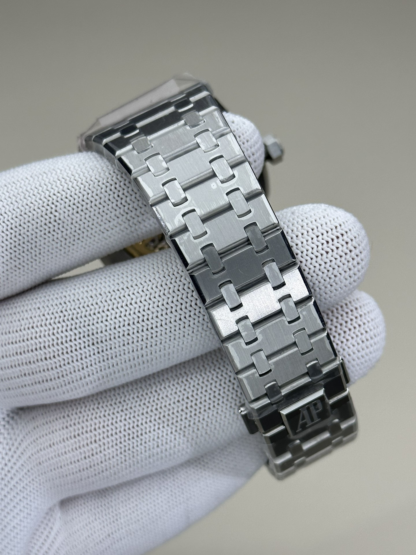 3.钢带的做工无可挑剔,比市面上任何钢带表做工均要更上一层楼,钢带头粒和表头衔接的"缓冲带"的松紧程度与正品一模一样。