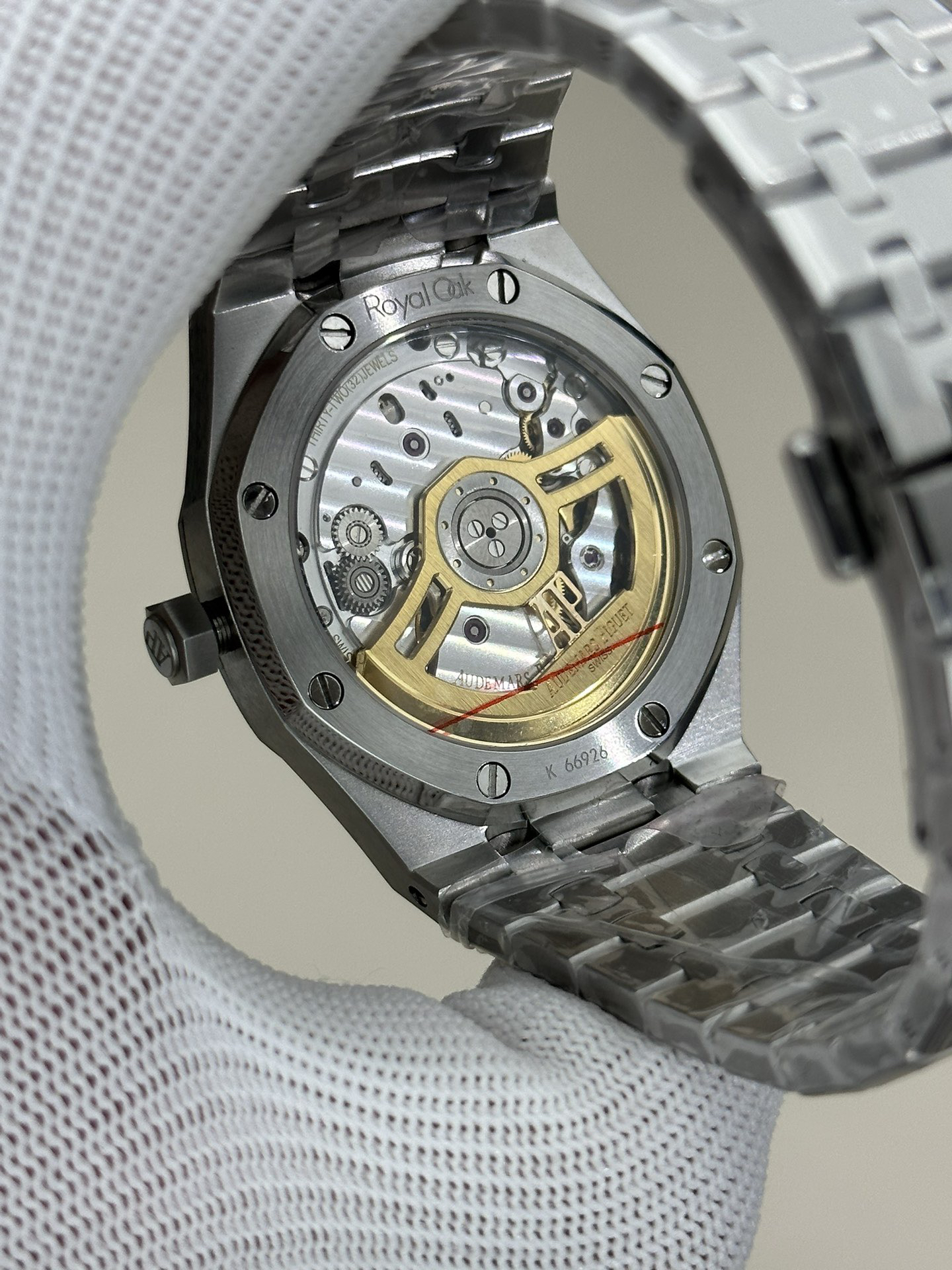 4.自动陀的与原装致敬,是市面唯一做到颜色于原装一致的版本(市面一般版本均偏红)其上的ap族徽雕刻独一无二。