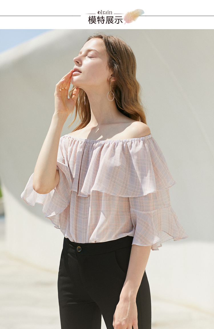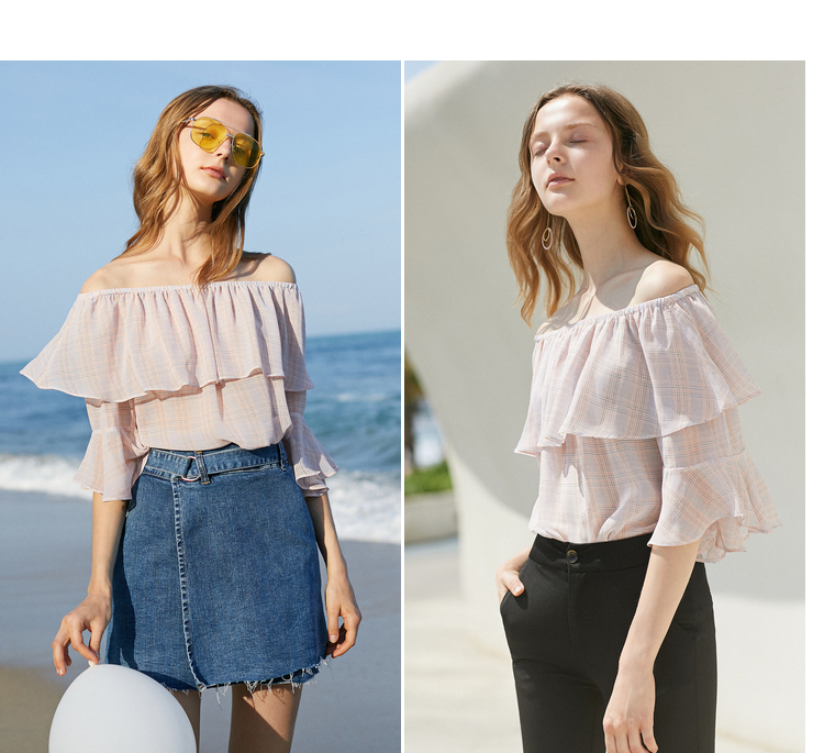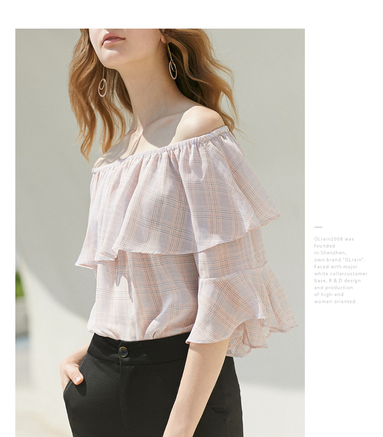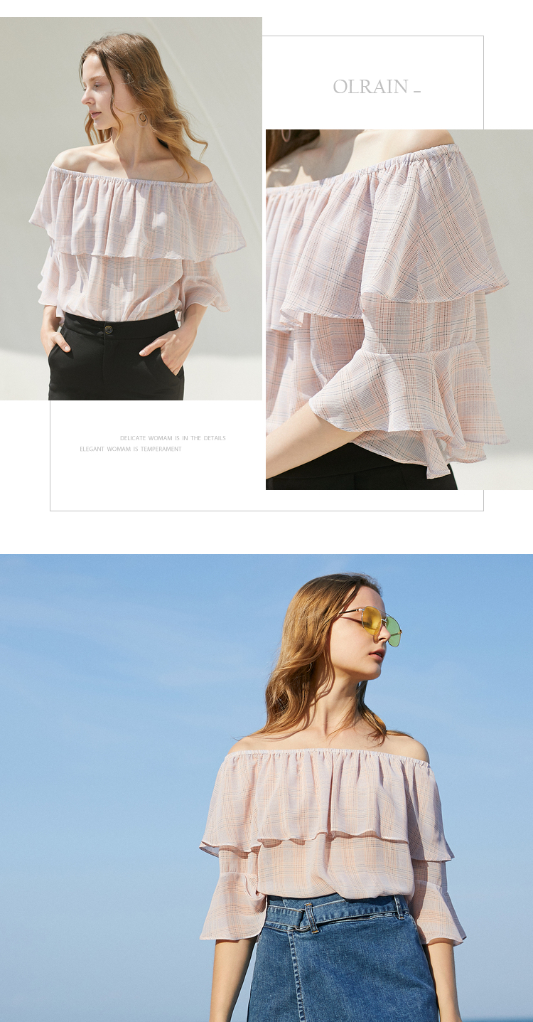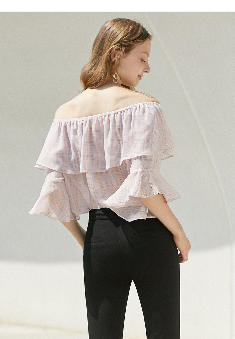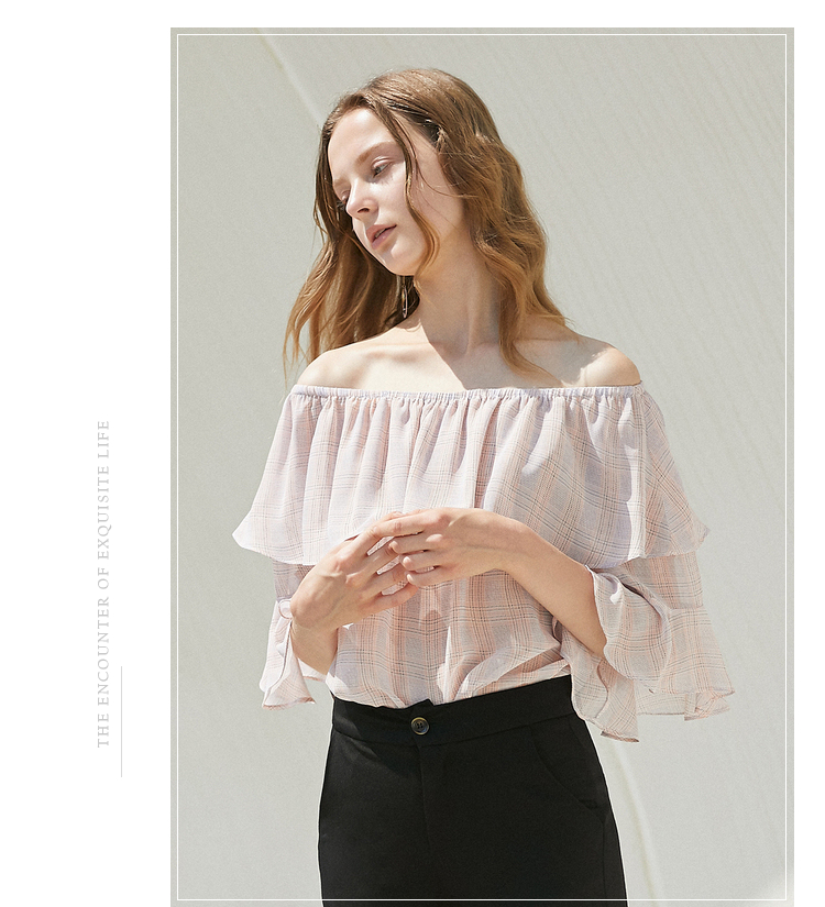 2018夏装一字领露肩小衫女格子喇叭袖雪纺衫女上衣