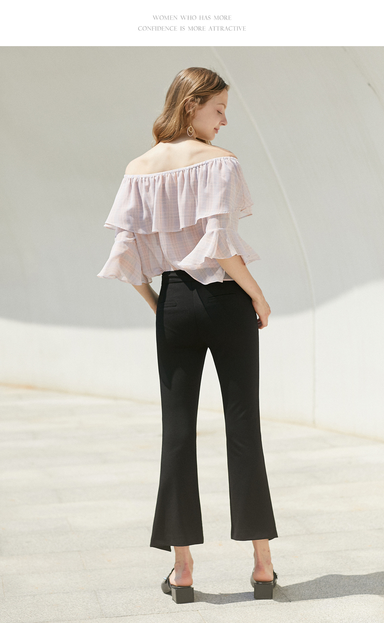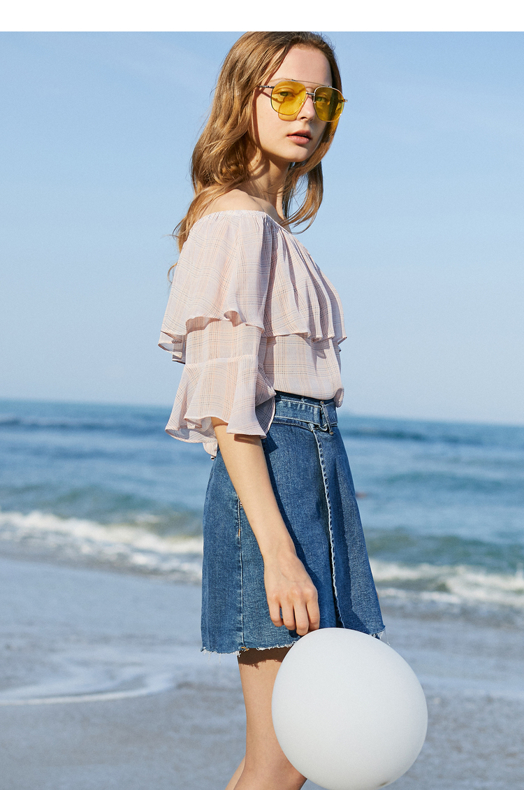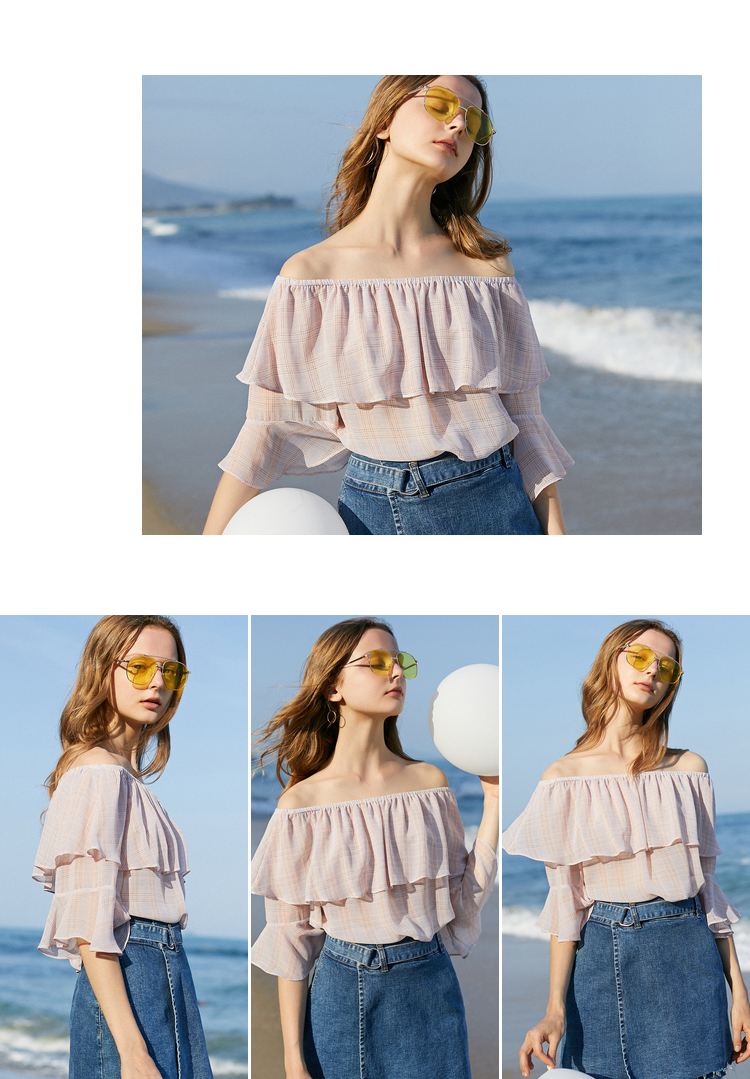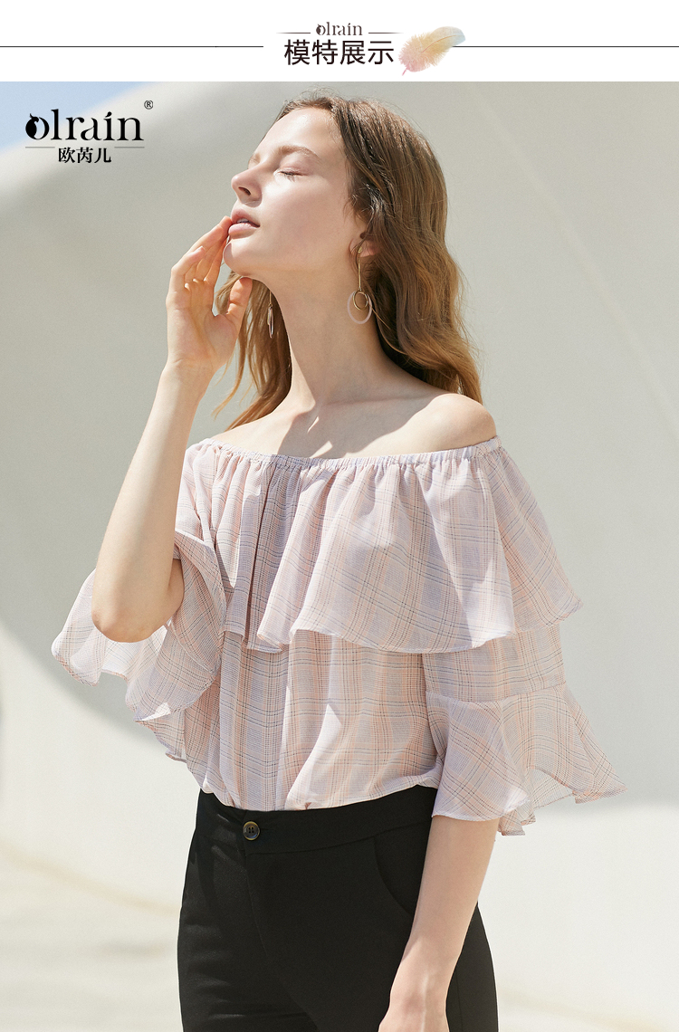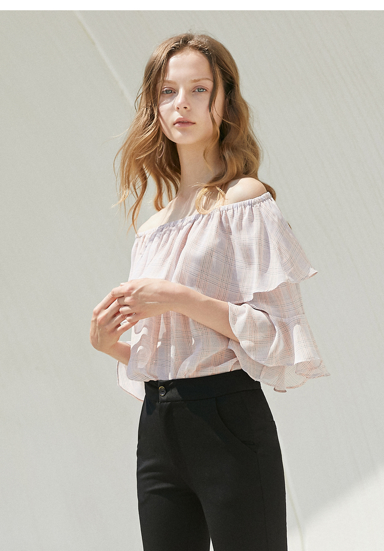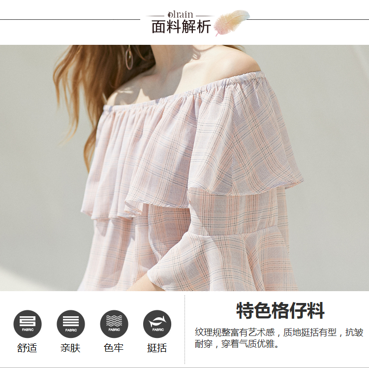 2018夏装一字领露肩小衫女格子喇叭袖雪纺衫女上衣