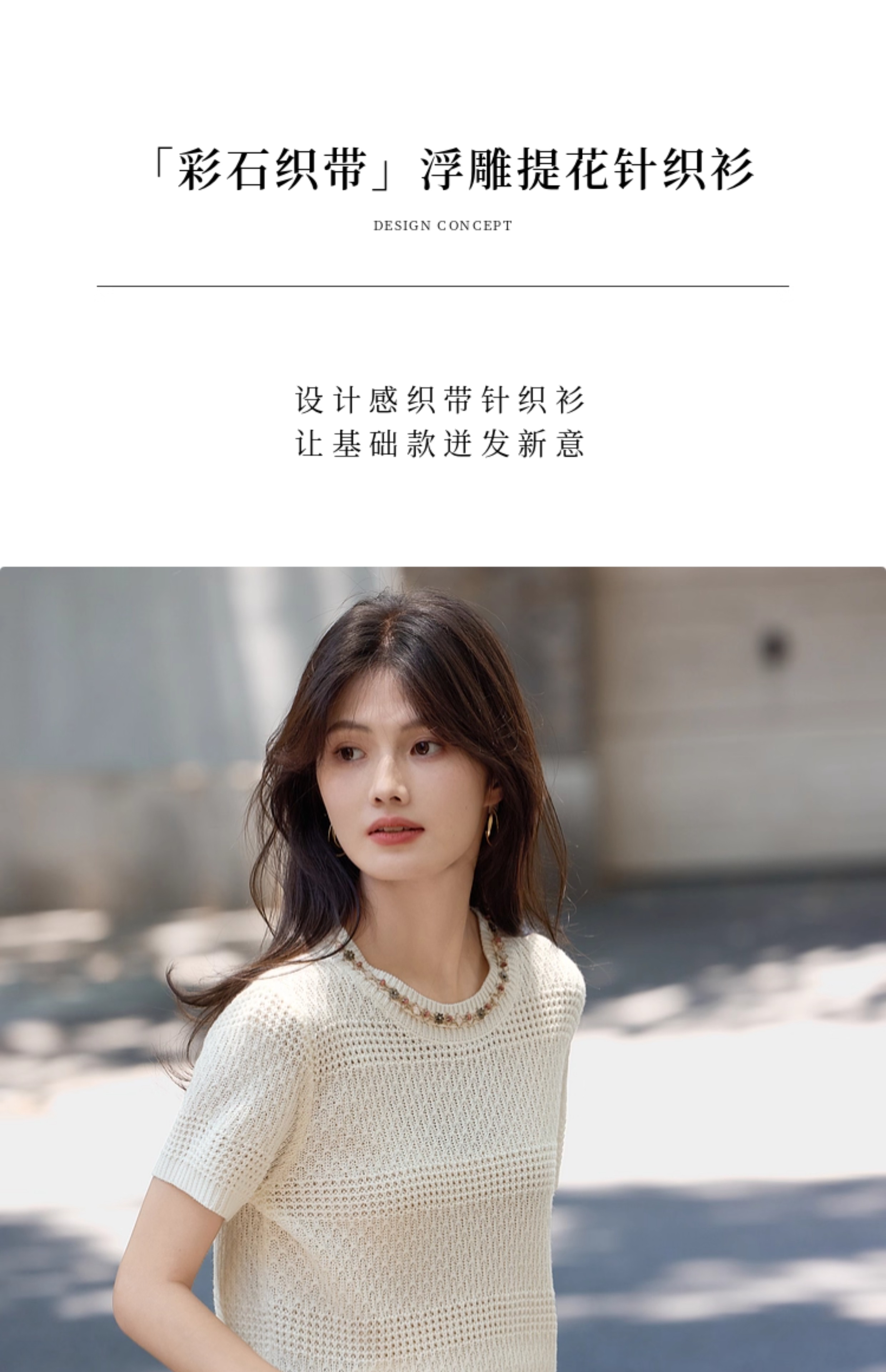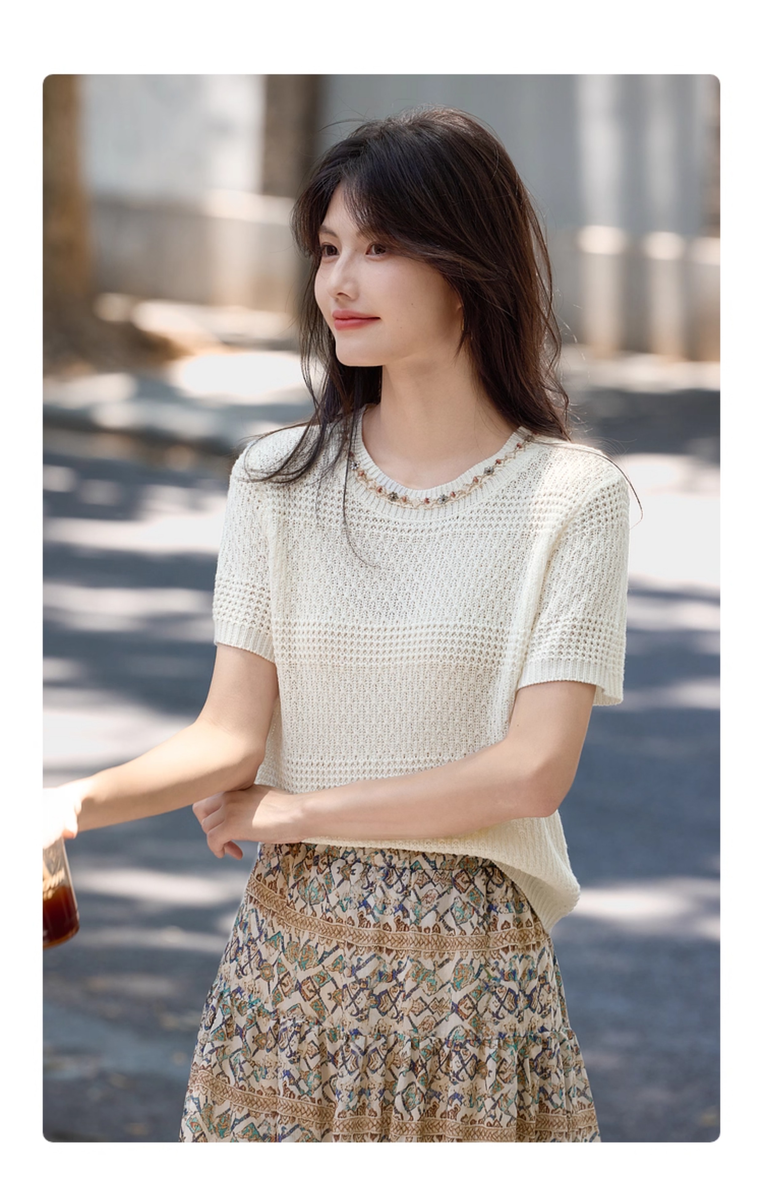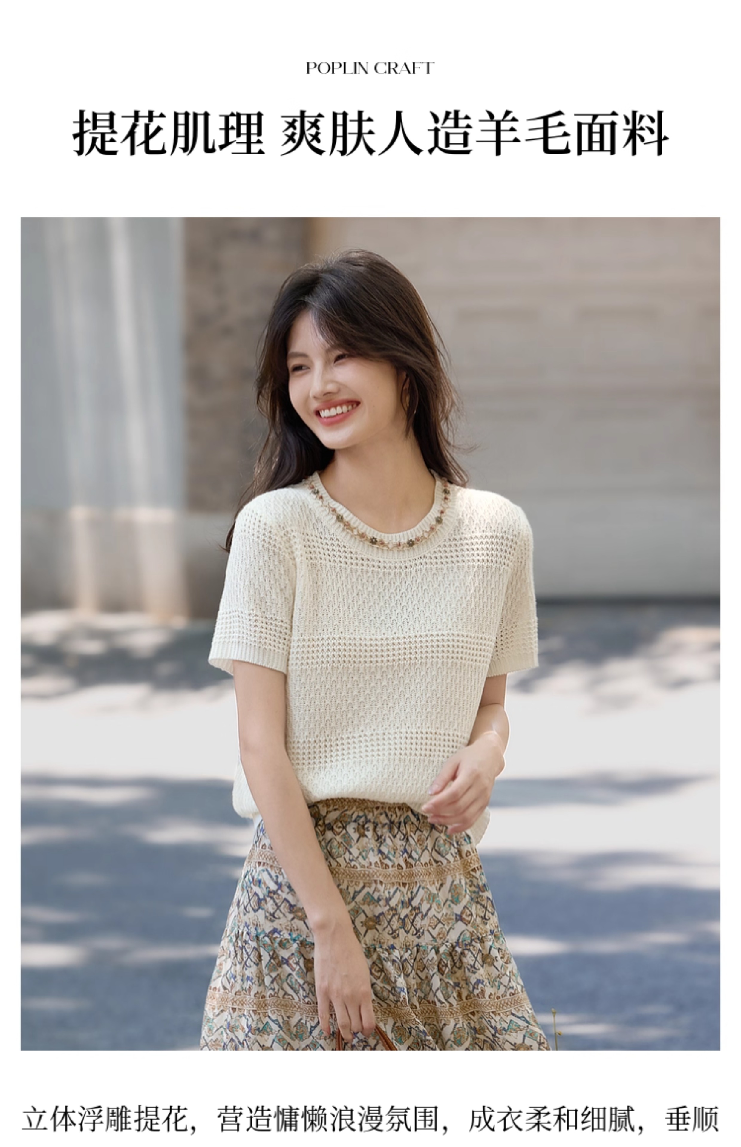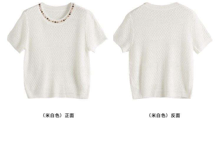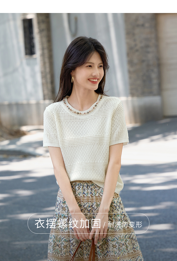 【08/06新品】熙世界波西米亚风镂空针织衫女短袖夏季钉珠织带圆领休闲独特上衣