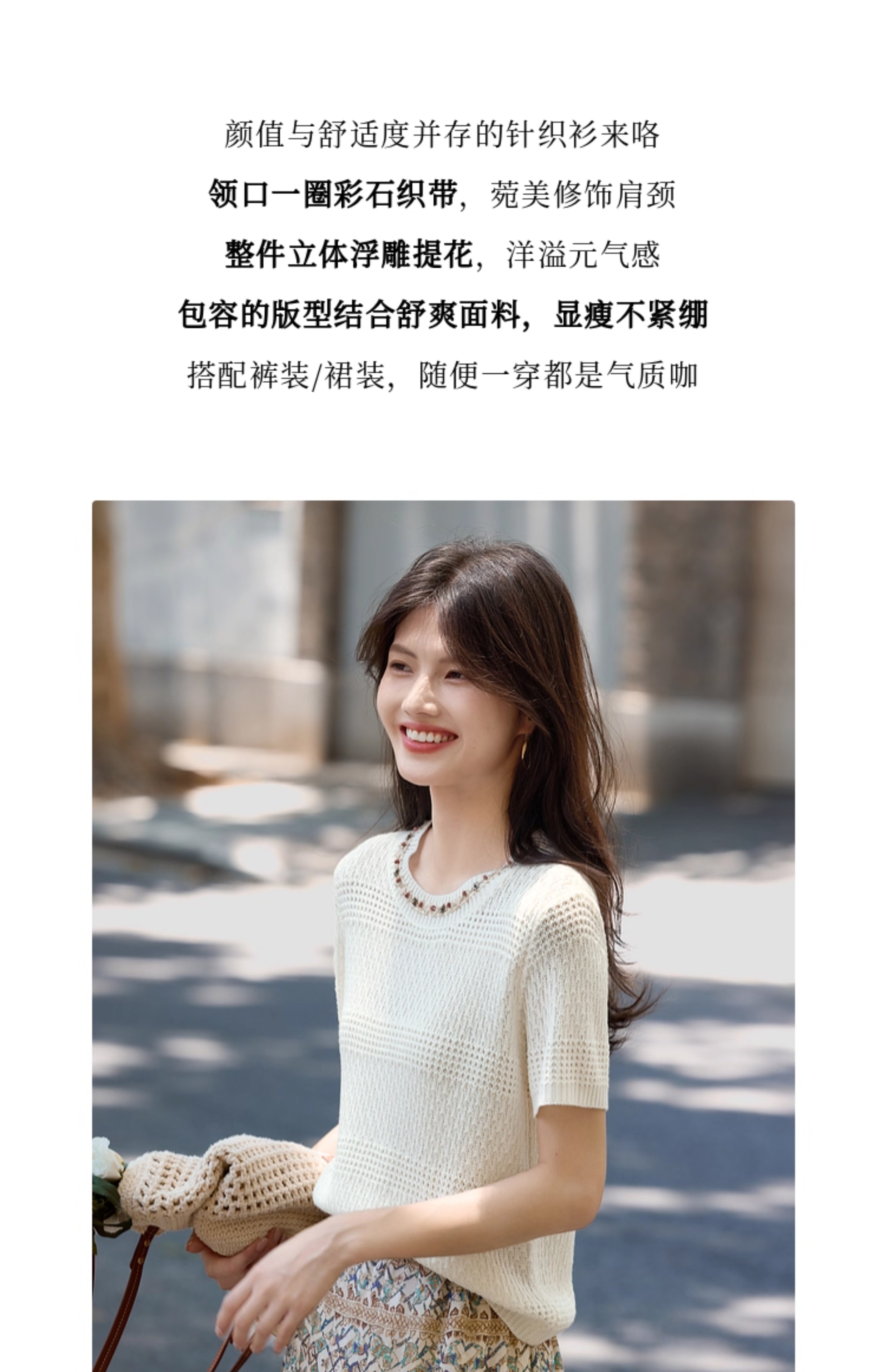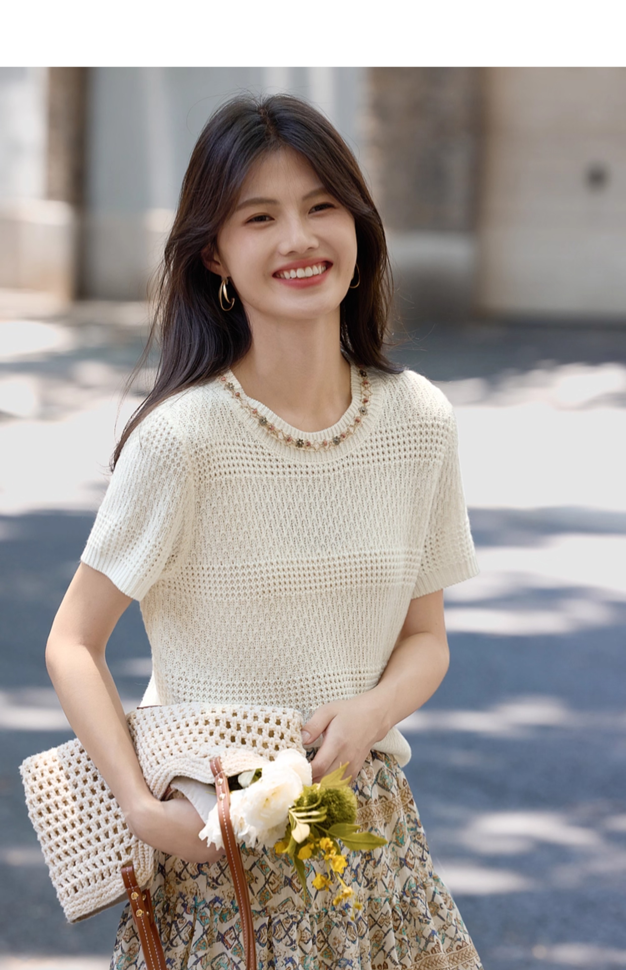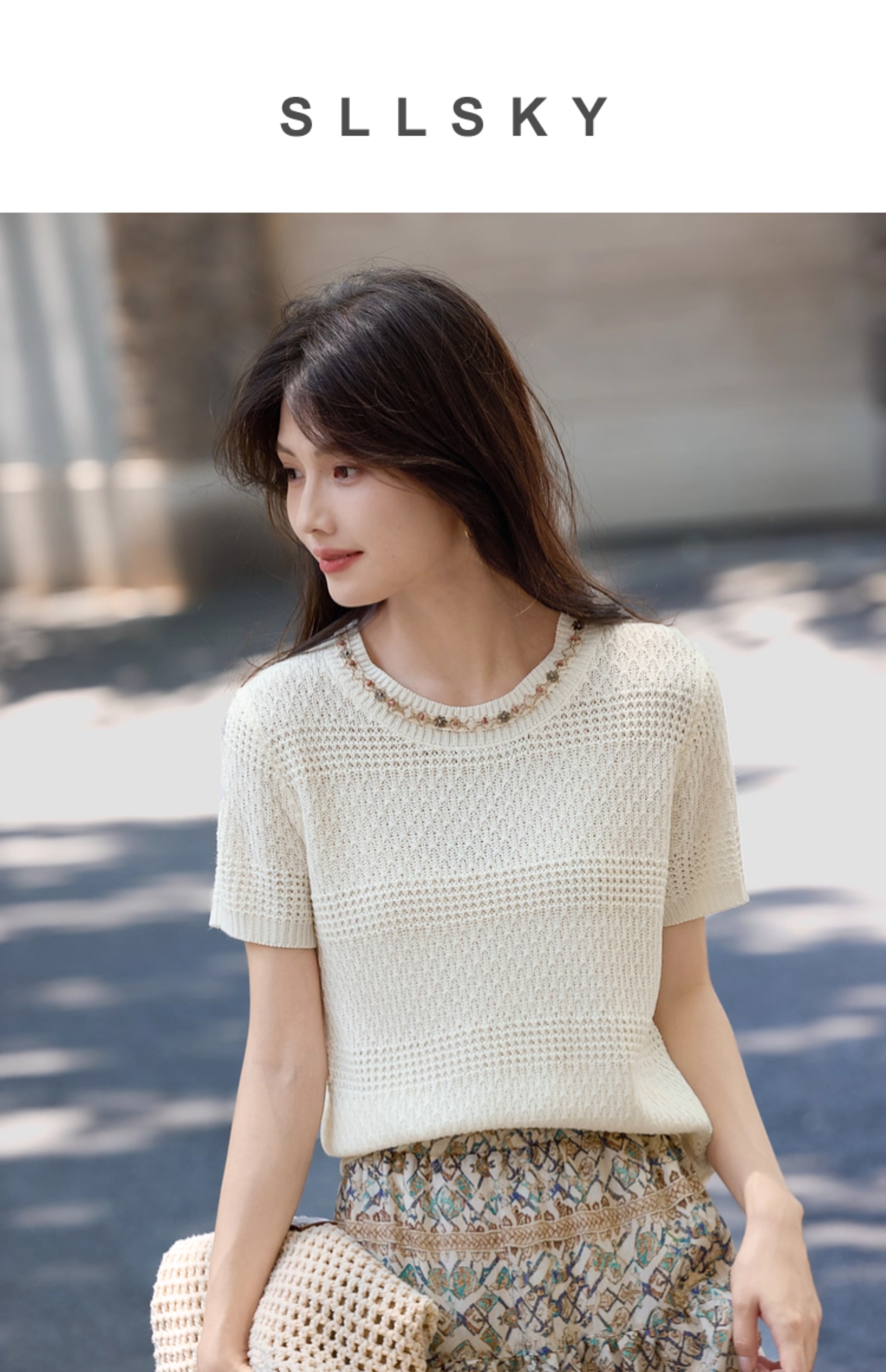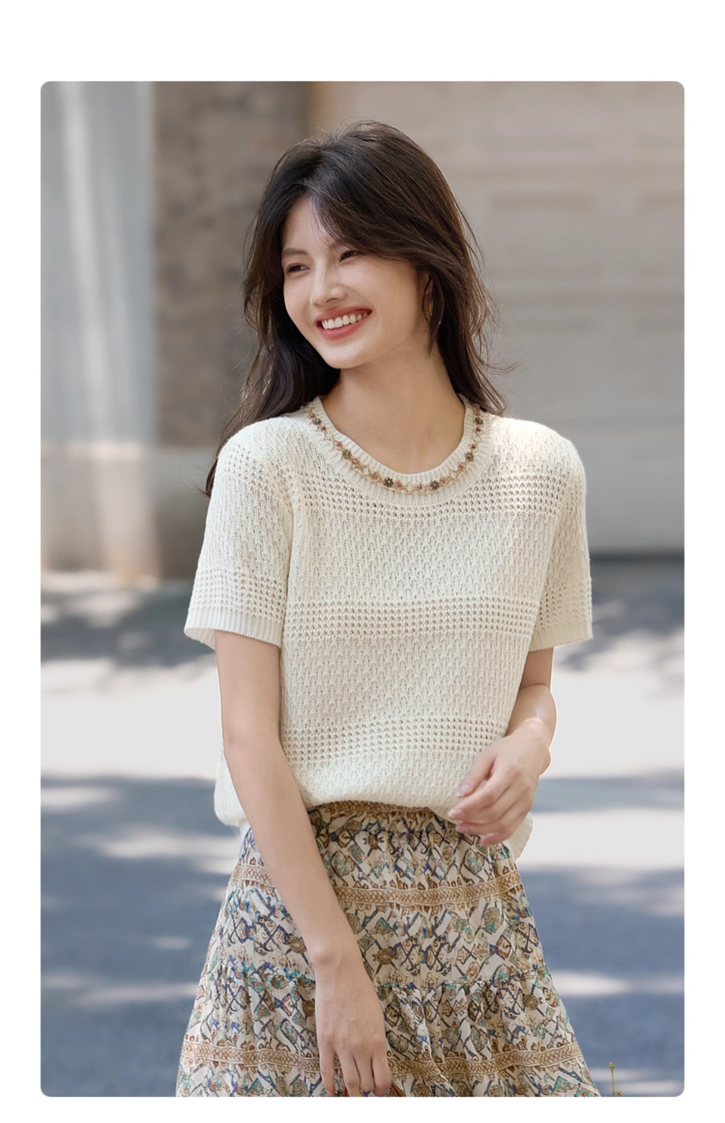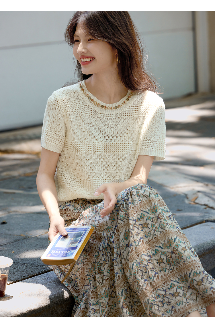 【08/06新品】熙世界波西米亚风镂空针织衫女短袖夏季钉珠织带圆领休闲独特上衣