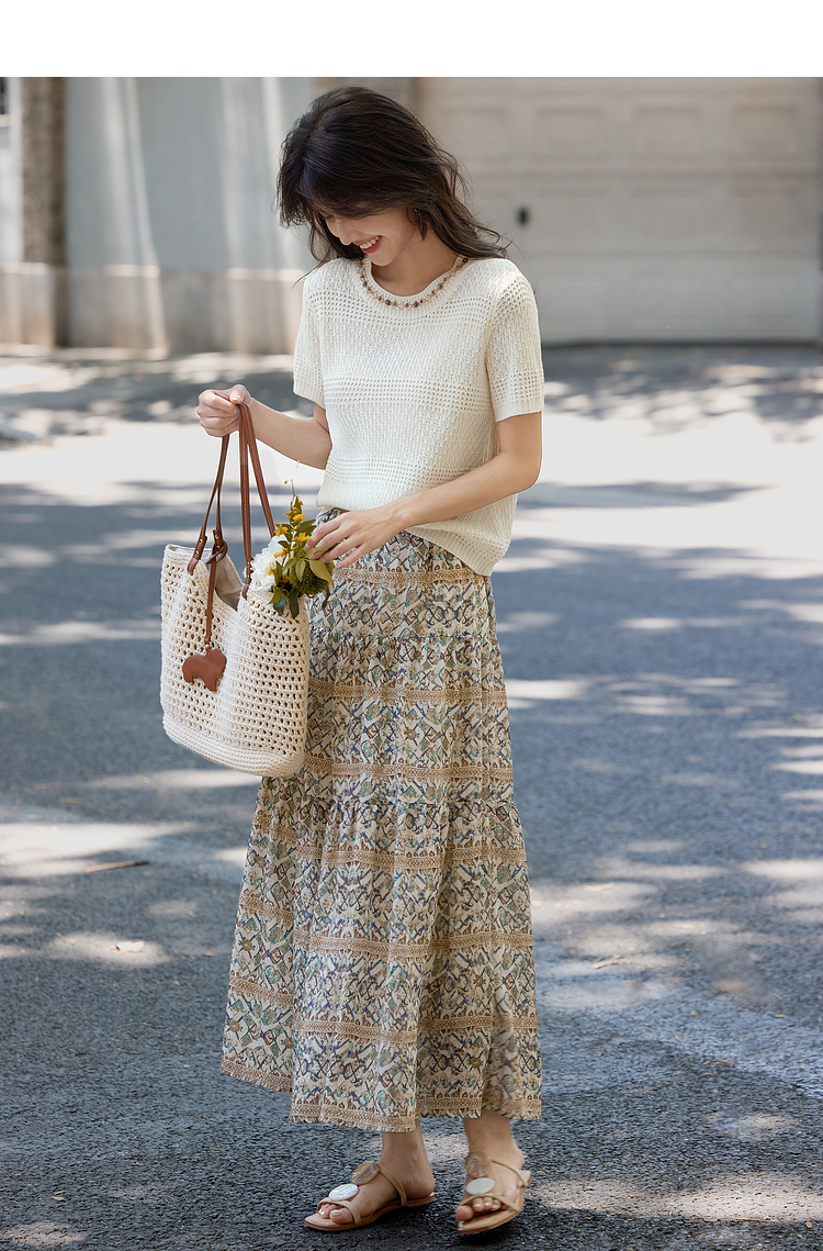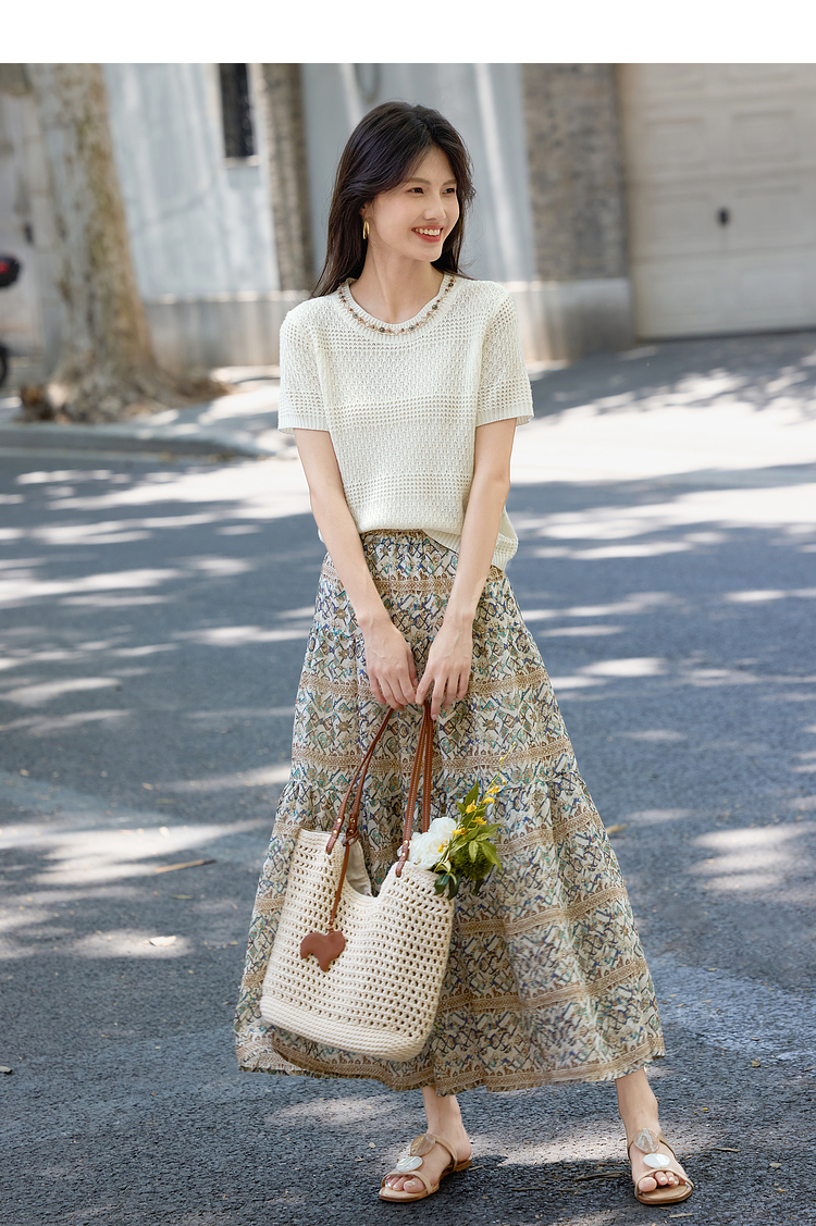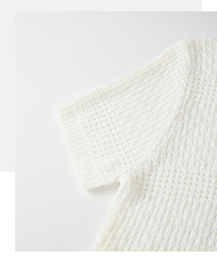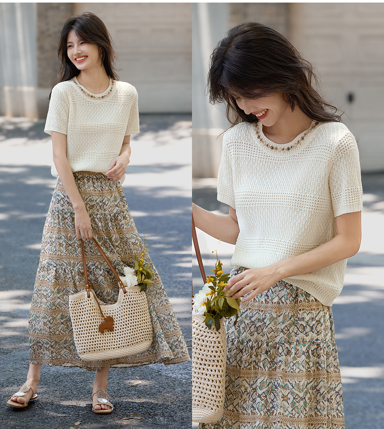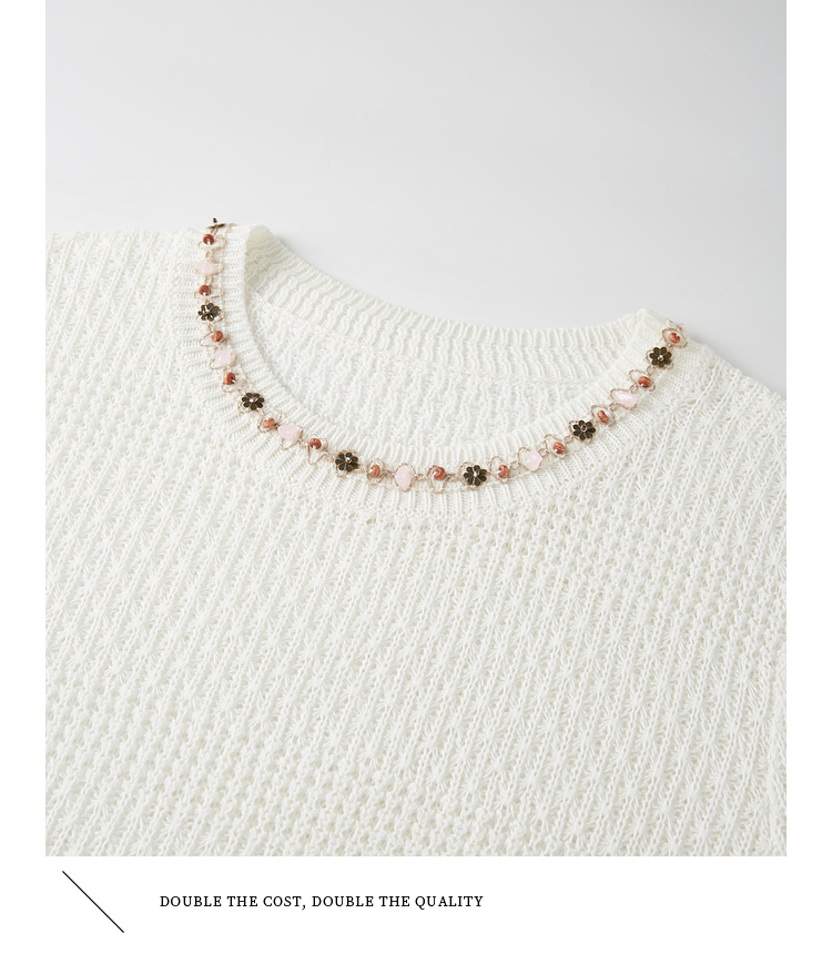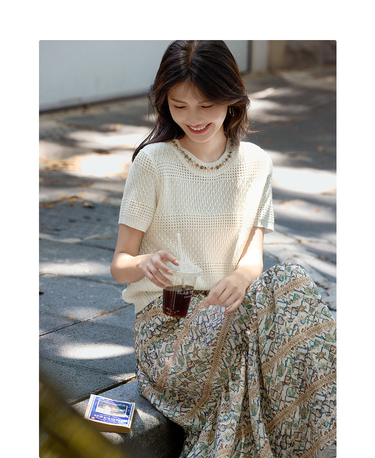 【08/06新品】熙世界波西米亚风镂空针织衫女短袖夏季钉珠织带圆领休闲独特上衣