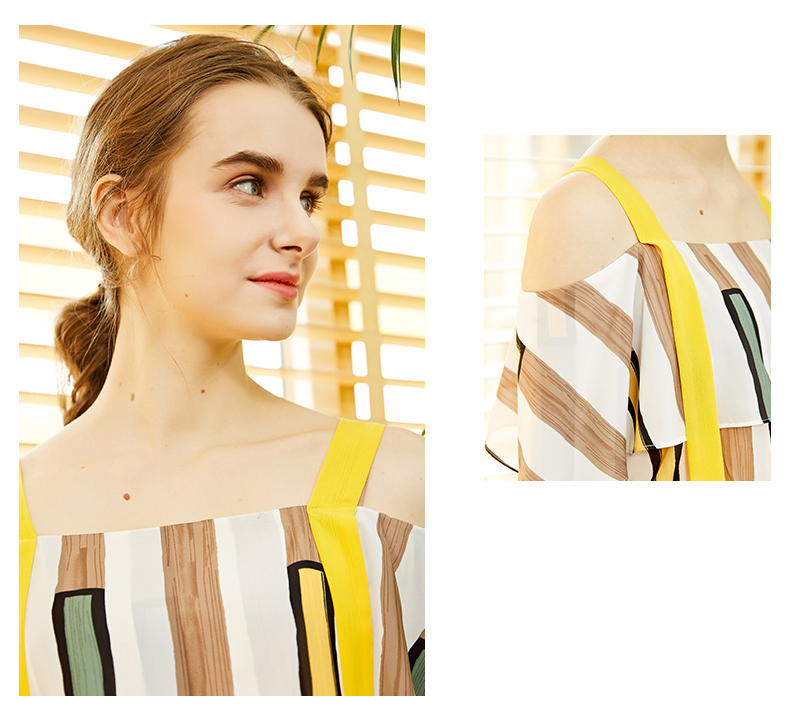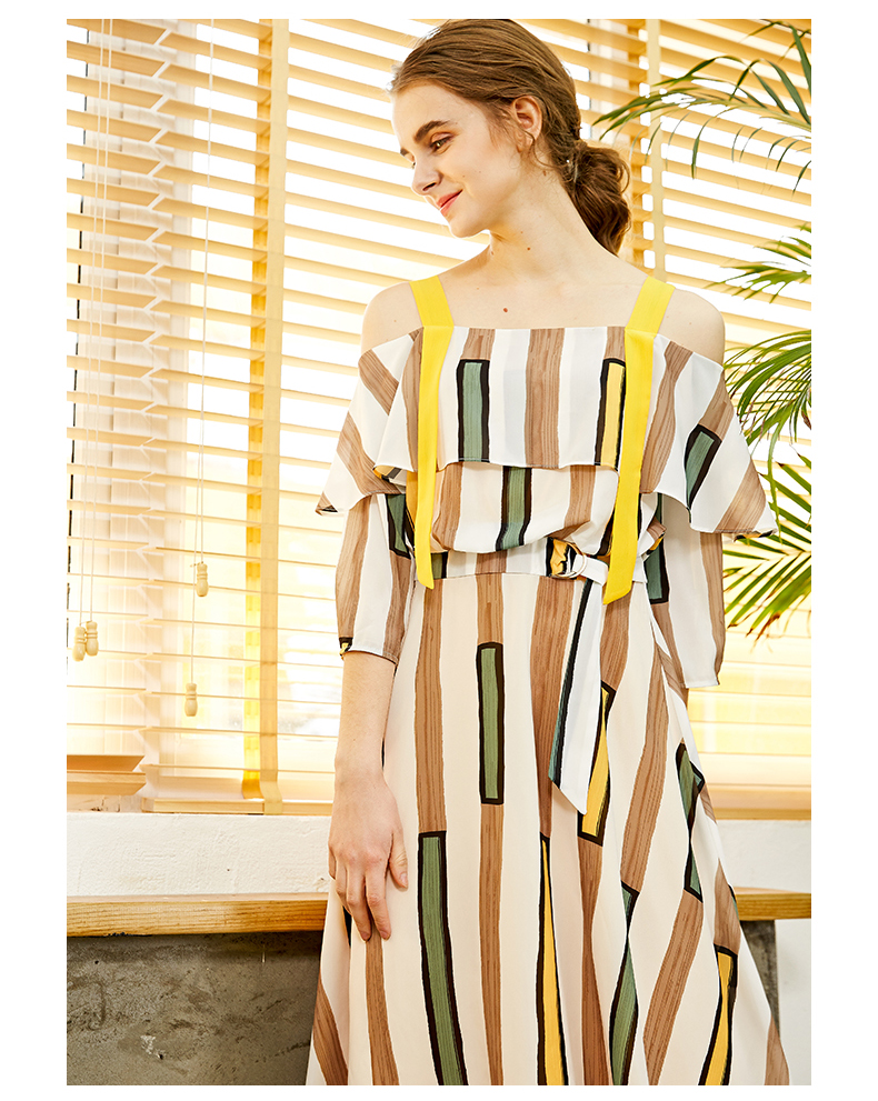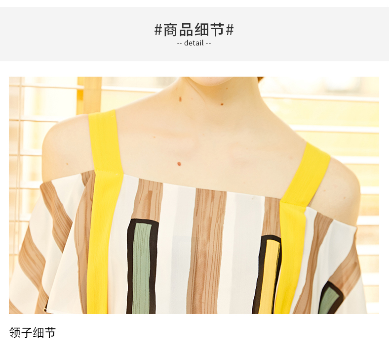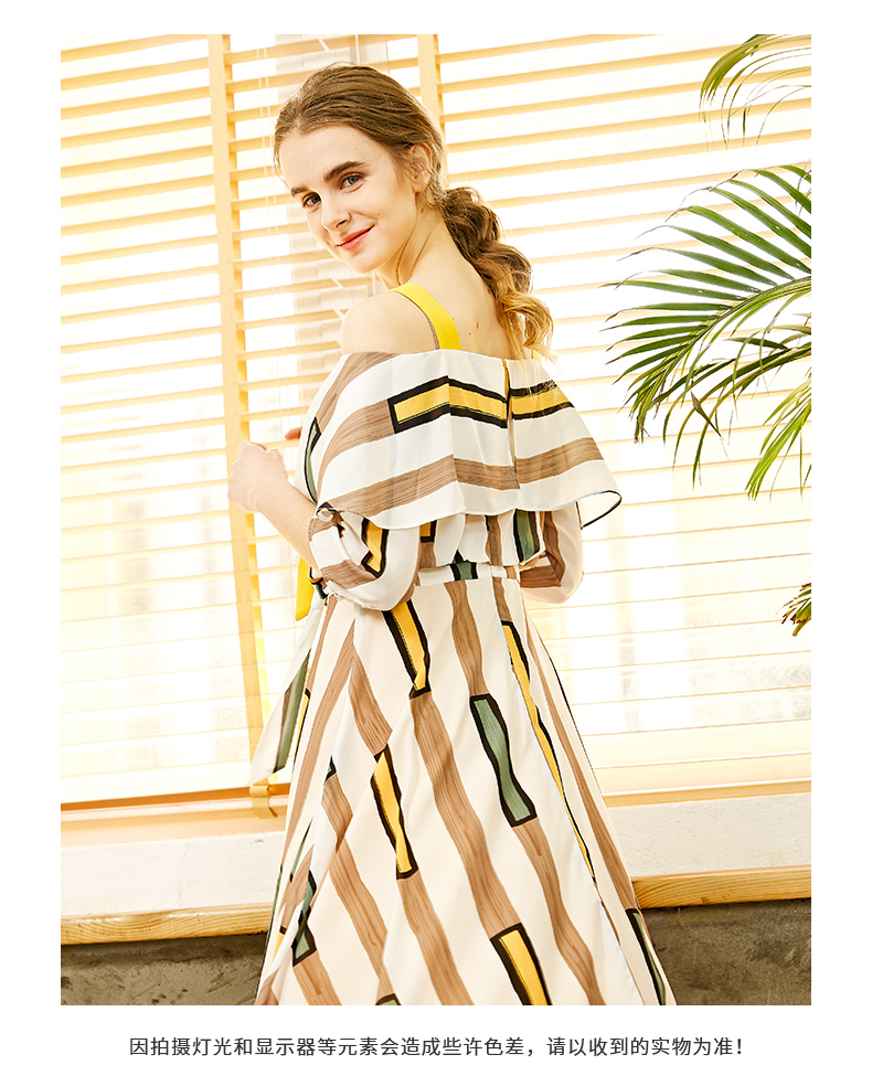 oldcolour欧珂荷叶边宽松收腰露肩一字肩吊带连衣裙雪纺中长款