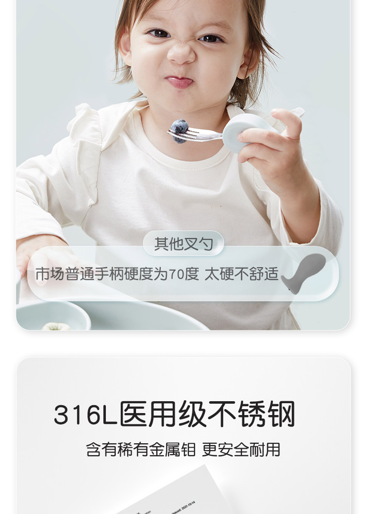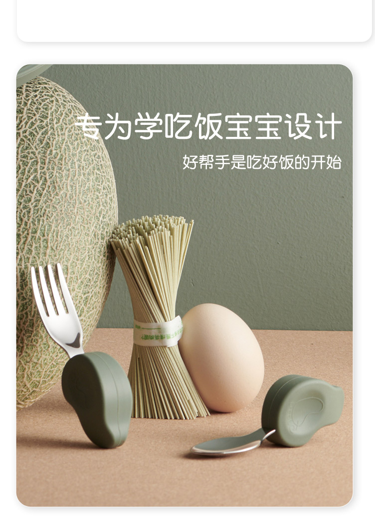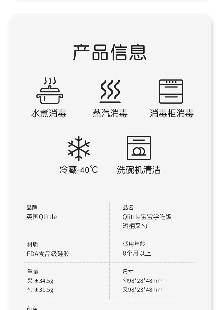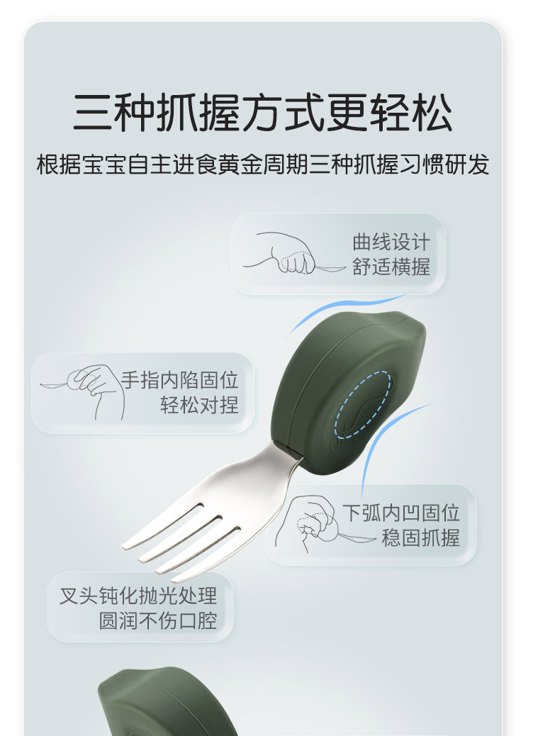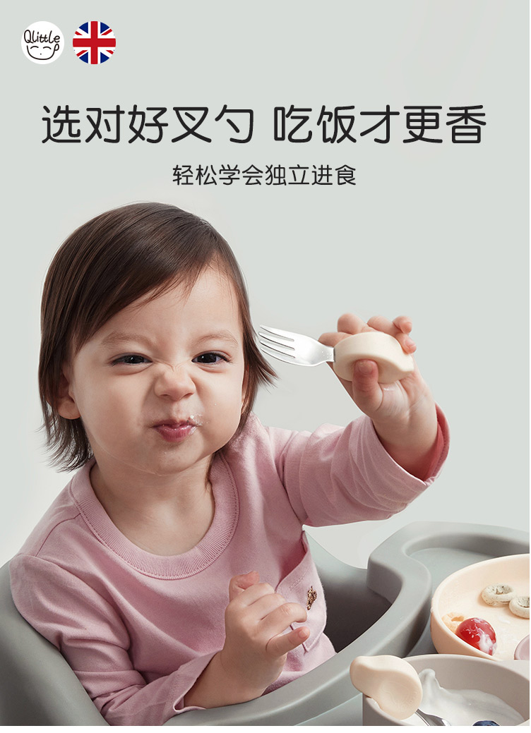 Qlittle宝宝学吃饭短柄叉勺婴儿训练勺叉不锈钢儿童餐具 6m+