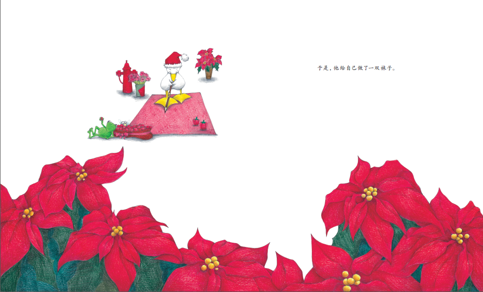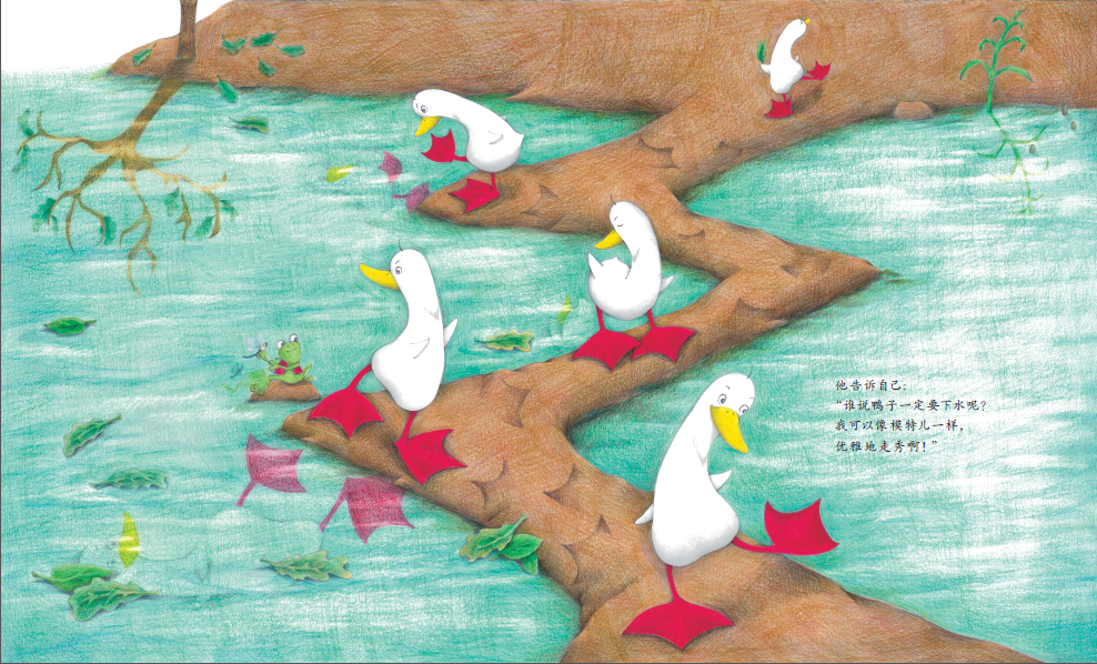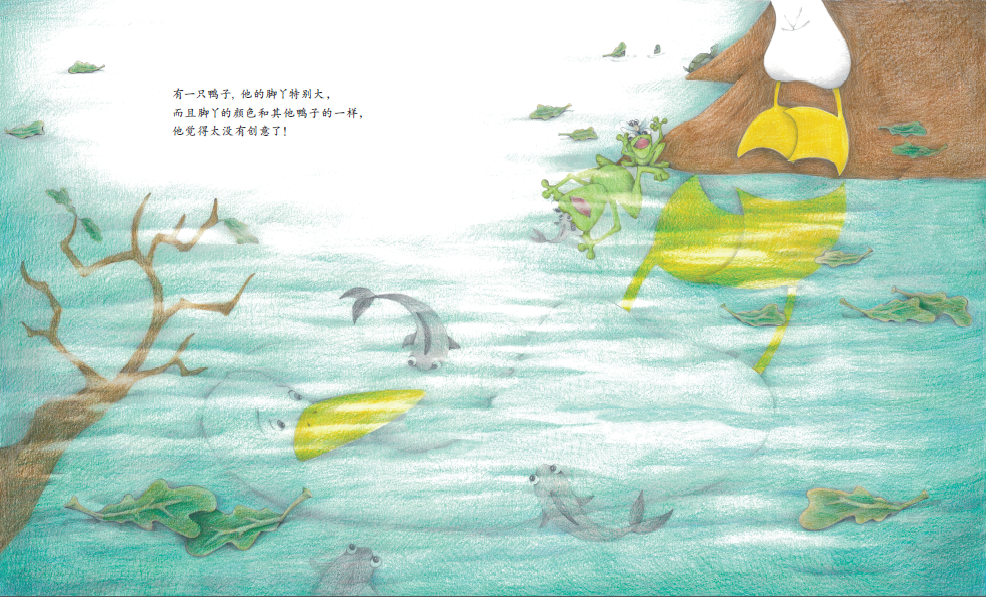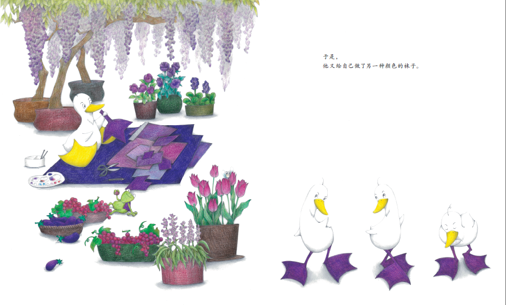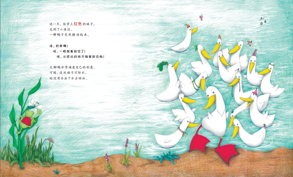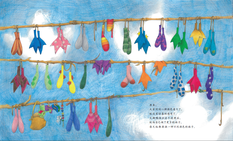《鸭子要穿袜子吗》题材新颖,讨论的话题能够引导孩子独立思考,培养他们的创新能力。彩铅的绘画风格让画面充满清新感,进一步凸显了文本中反复出现的色彩元素。从整体上看,该作运用了图画书常见的反复的叙事结构,又自然地融入了富有现代感的主题,是一部带有思辨色彩的佳作。