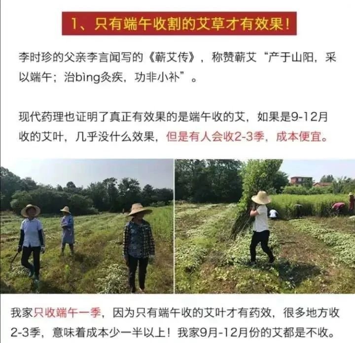 现代药理也证明了真正有效果的是端午收的艾,如果是9-12月收的艾叶,几乎没什么效果,但是很多商家会收2-3季,成本便宜。