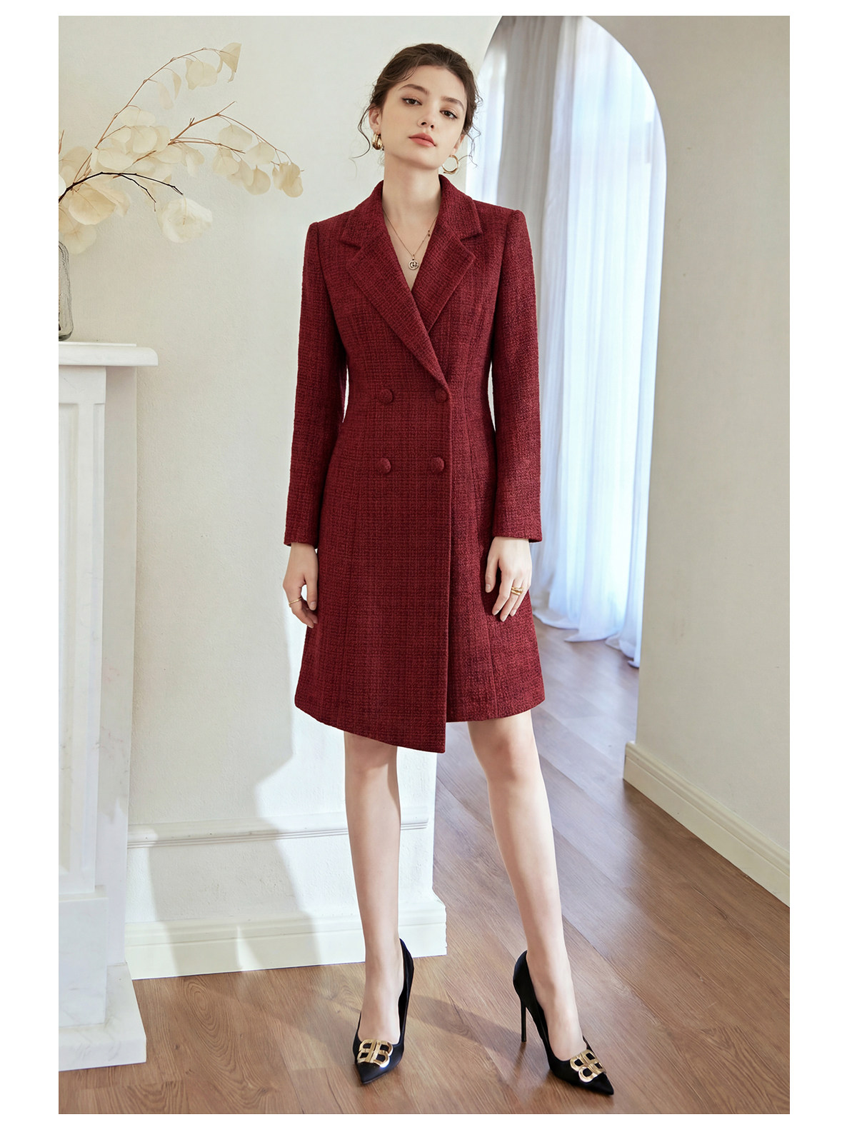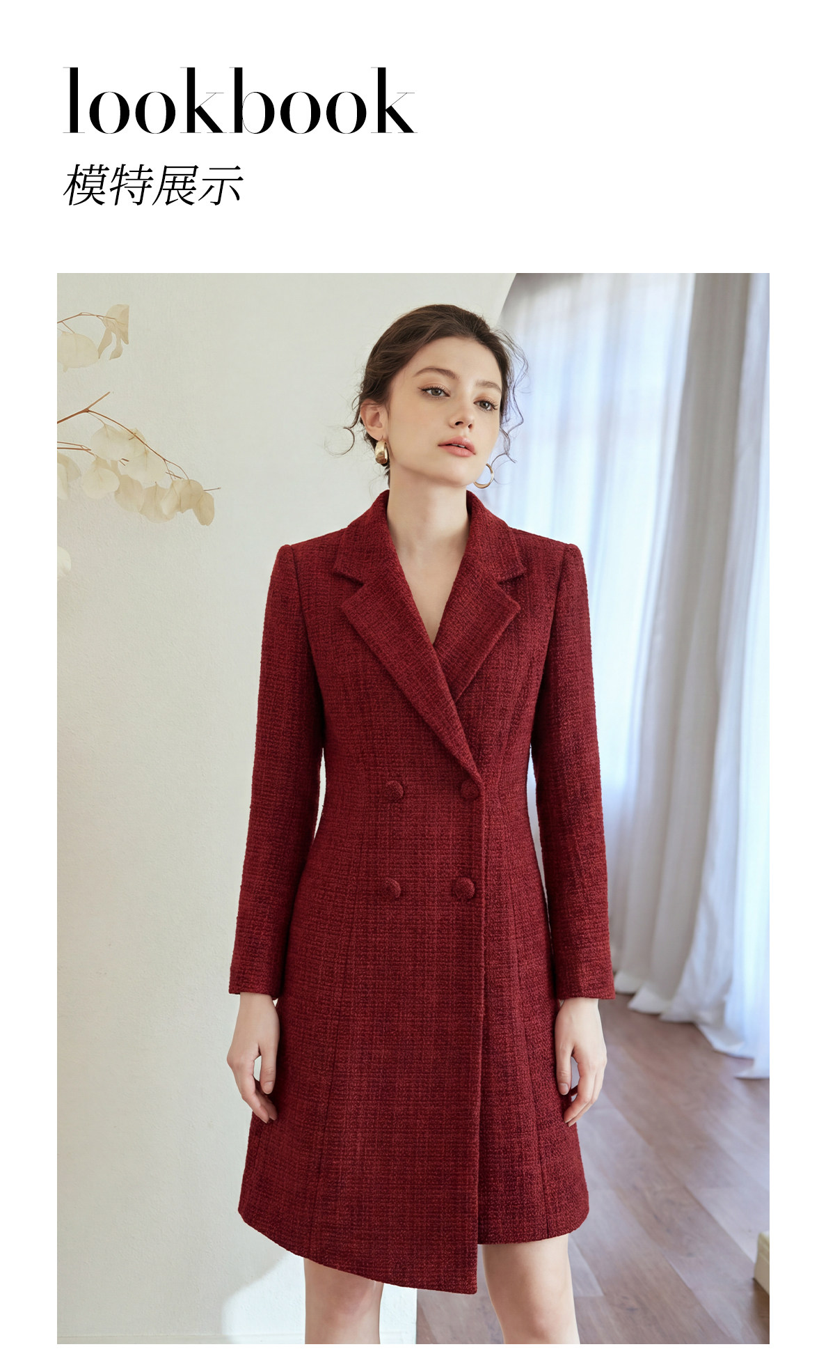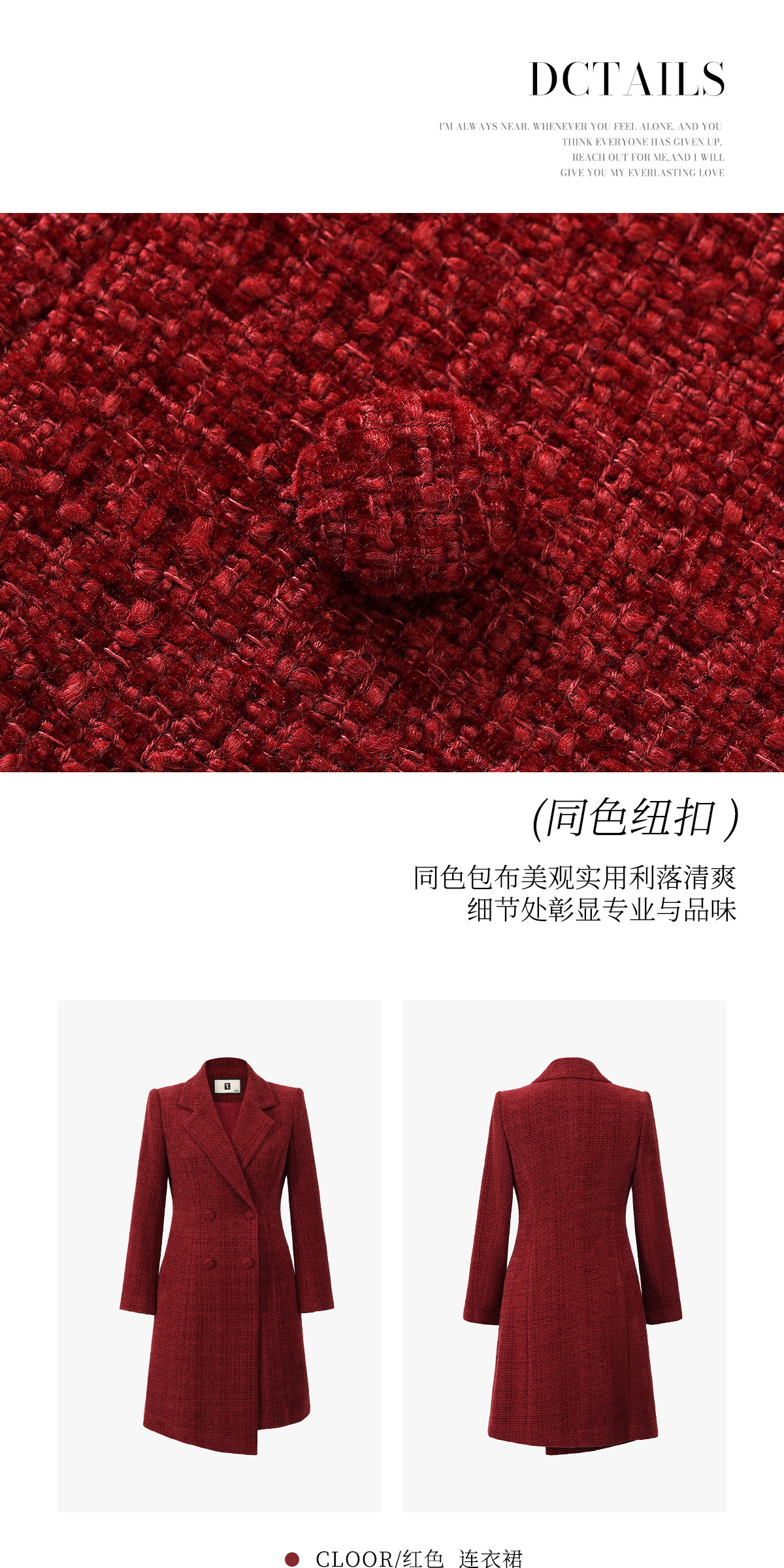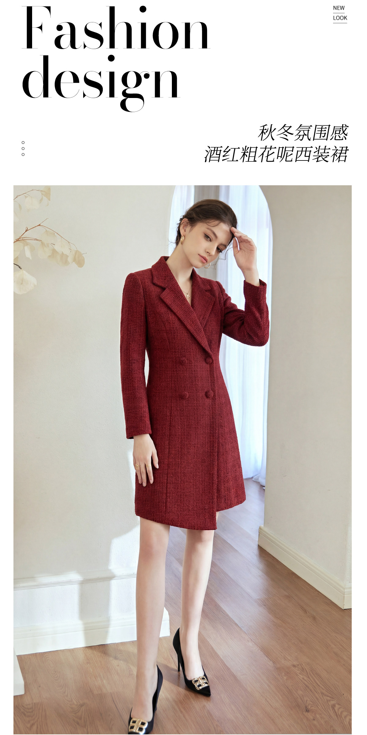 IWY/酒红色高级感羊毛西装领连衣裙女双排扣收腰显瘦宴会礼服裙WQ090-