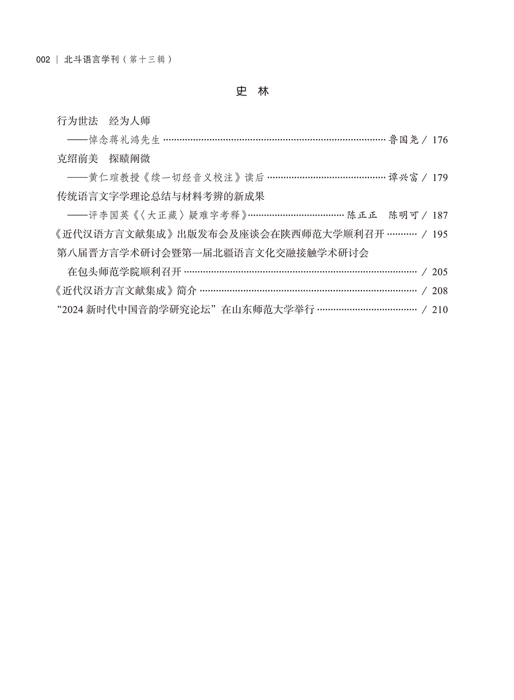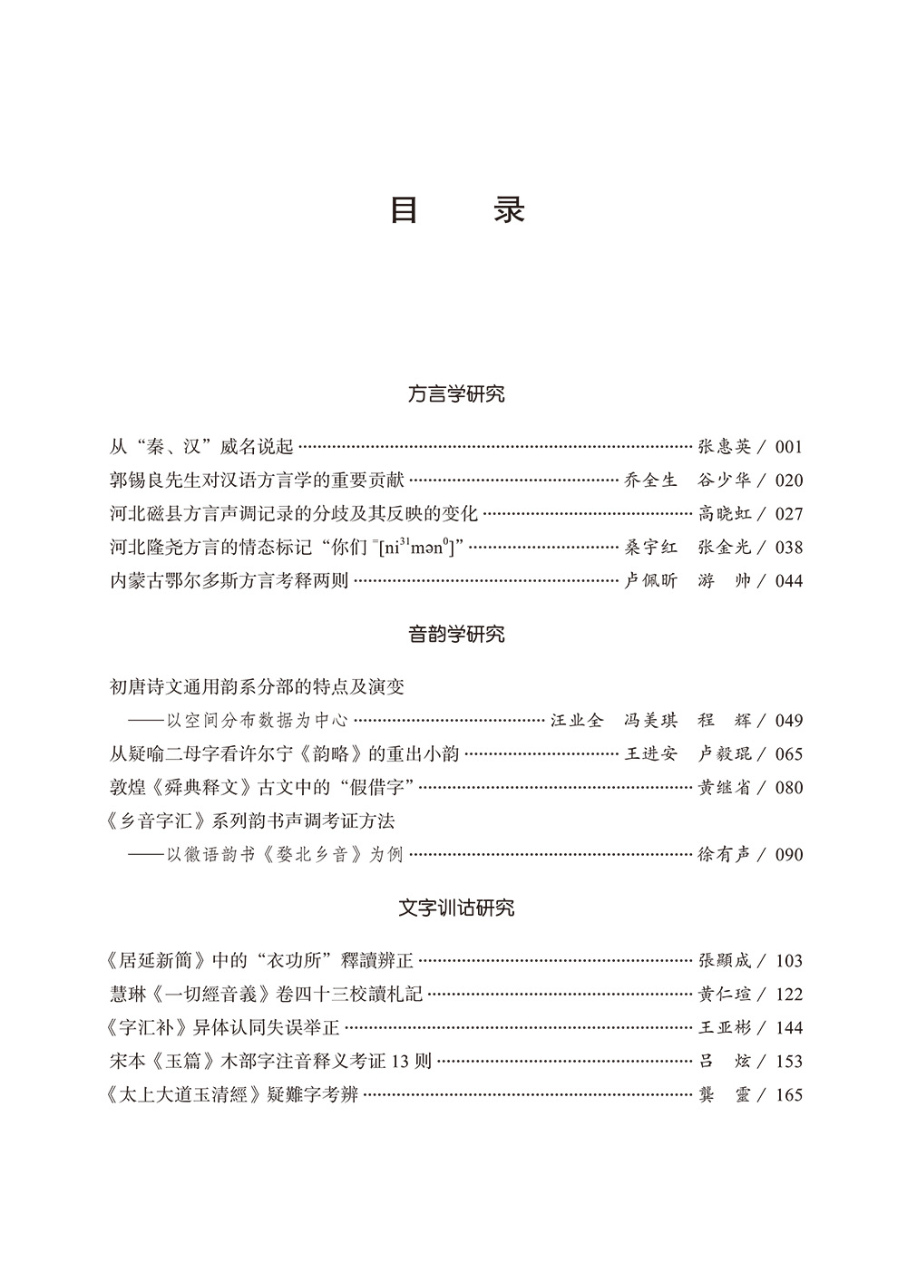 本辑分4个专栏“方言学研究”“音韵学研究”“文字训诂研究”“史林”,主要刊登了张惠英《从“秦、汉”威名说起》、汪业全《初唐诗文通用韵系分部的特点及演变——以空间分布数据为中心》、张显成《<居延新简>中的“衣功所”释读辨正》、鲁国尧《行为世法 经为人师——悼念蒋礼鸿先生》等21篇论文。