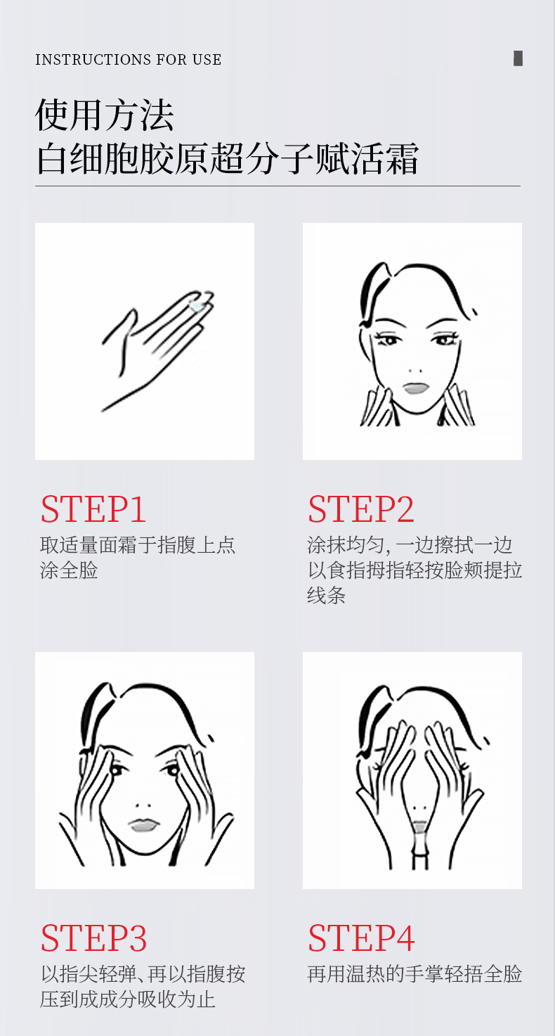 【使用方法】:洁面爽肤后,取适量产品于掌心,轻轻涂抹于面部肌肤,轻柔按摩直至完全吸收。