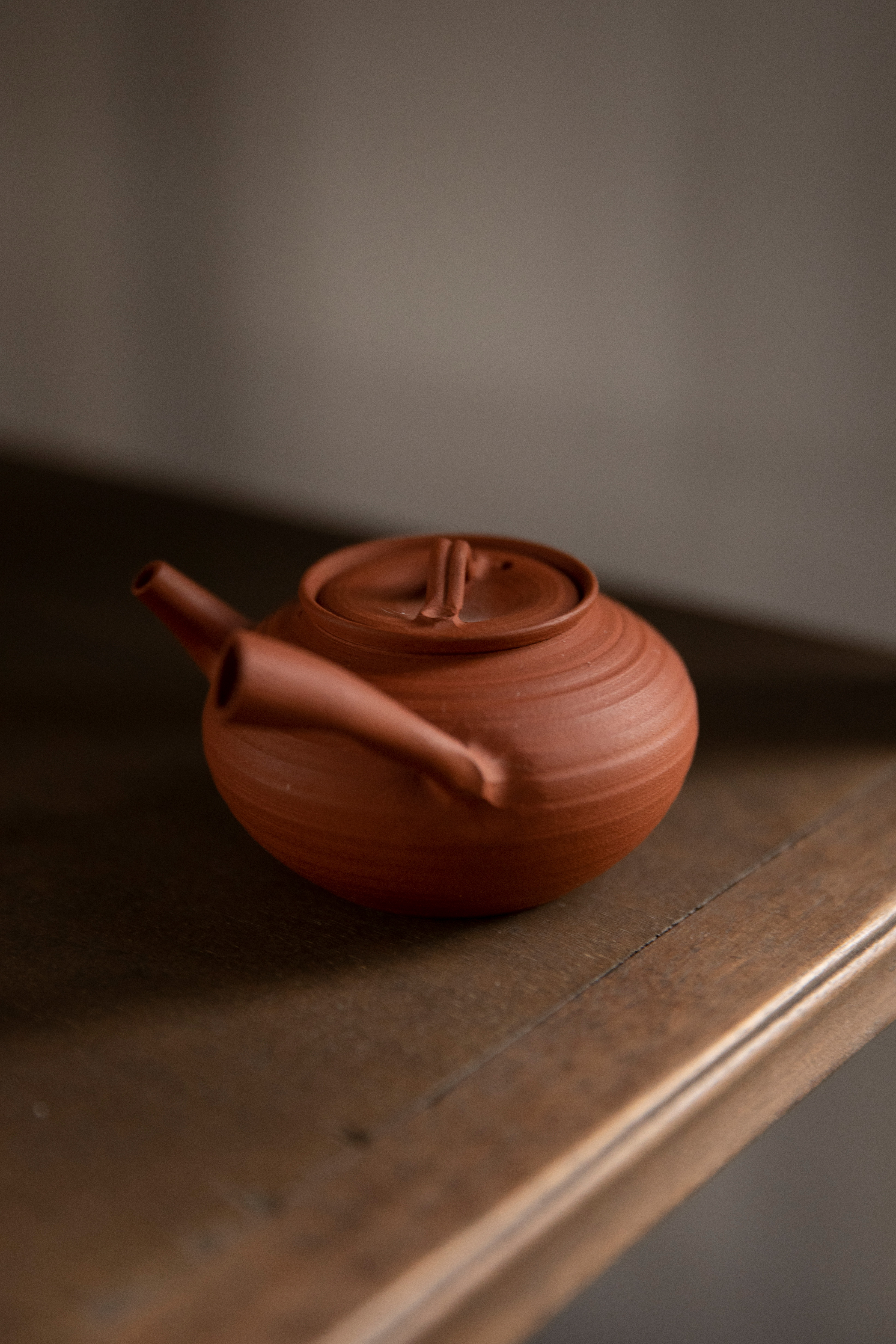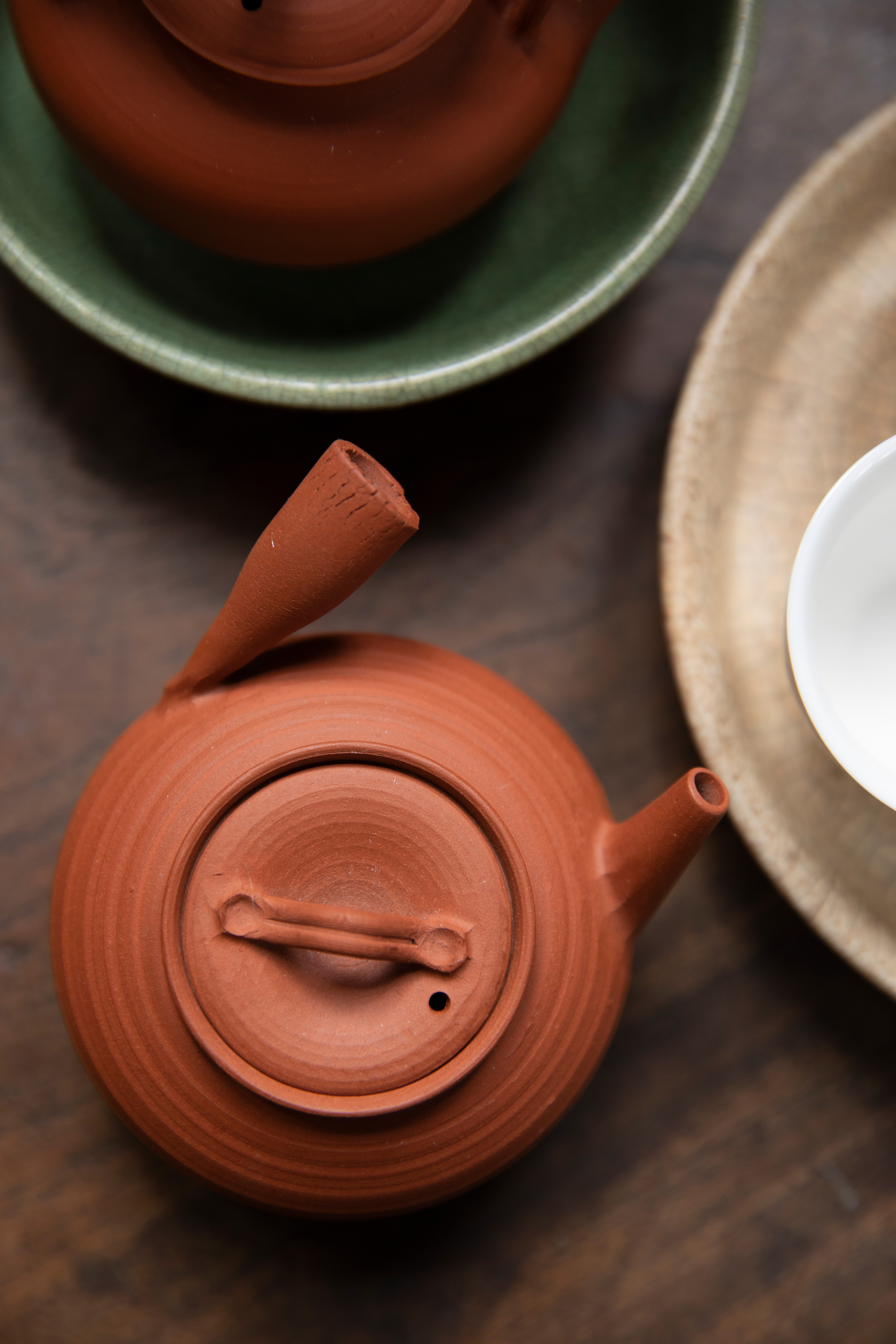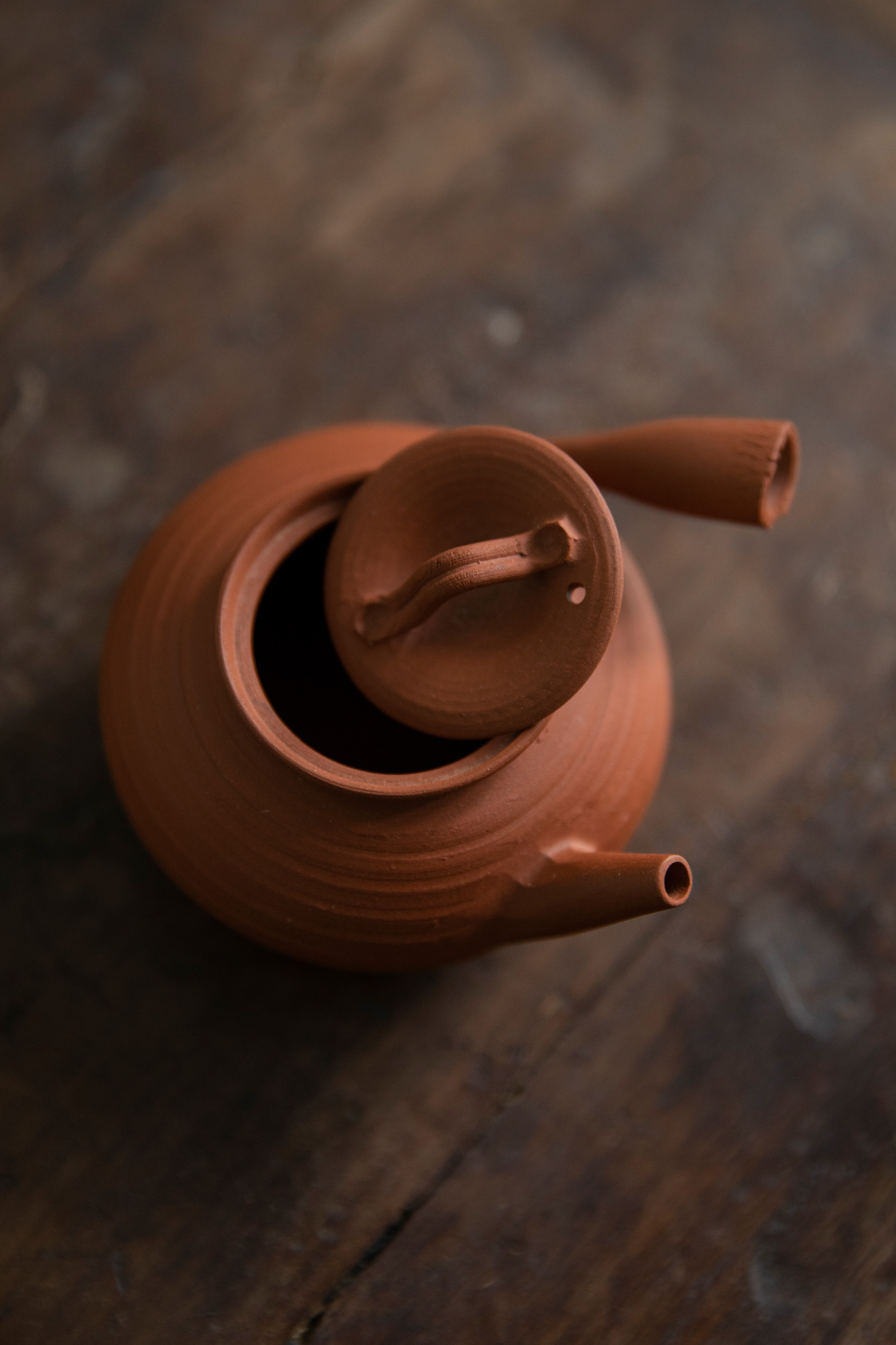 此件茶壶就是一件潮汕红泥刷浆手拉急须壶。急须壶,又称侧把壶,其来源是唐代煎茶器。其壶型姿态优美,采用左侧把的形式,壶身壶嘴比例协调,小巧精致,是烹制潮州工夫茶的绝佳器具。