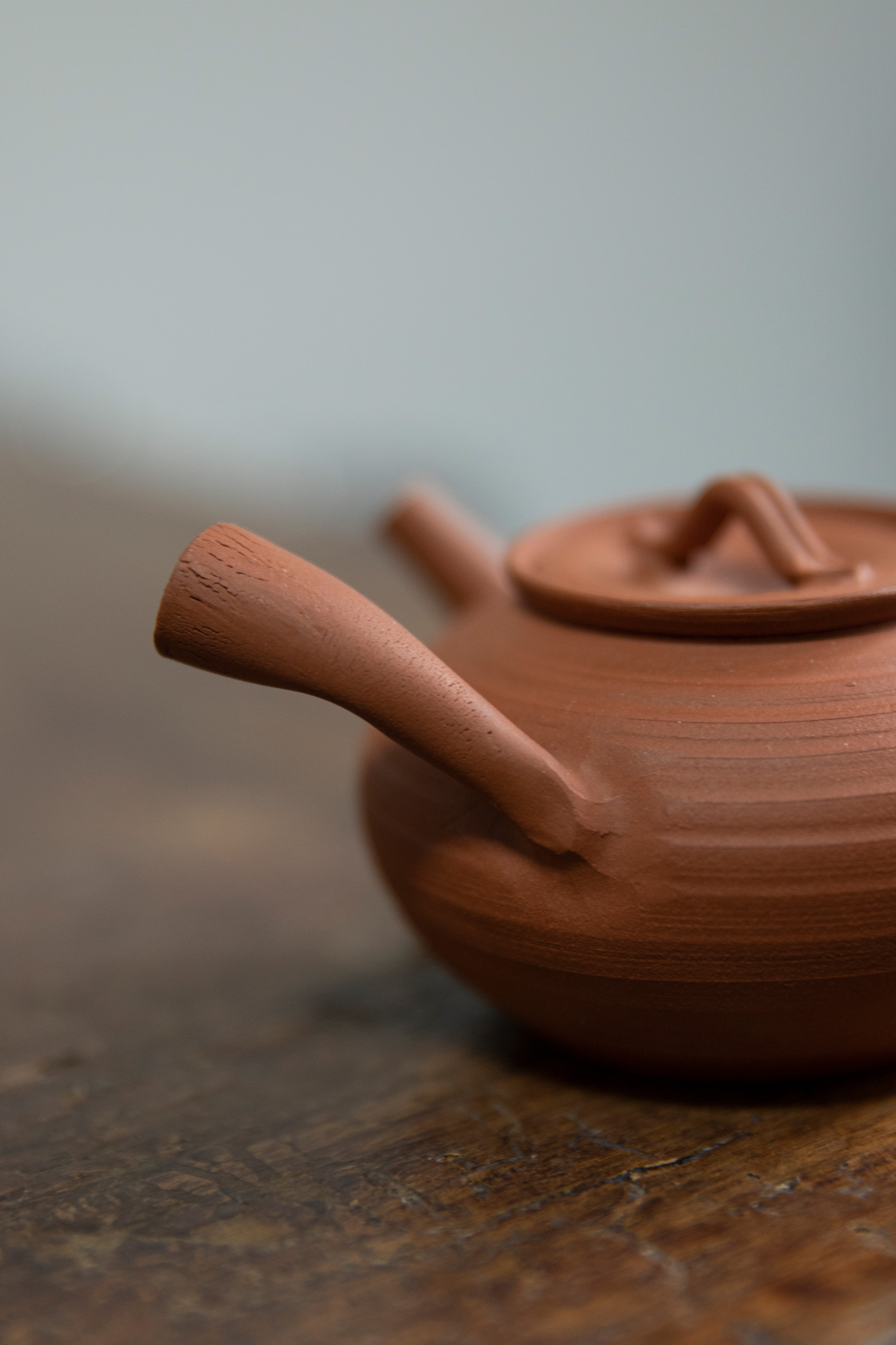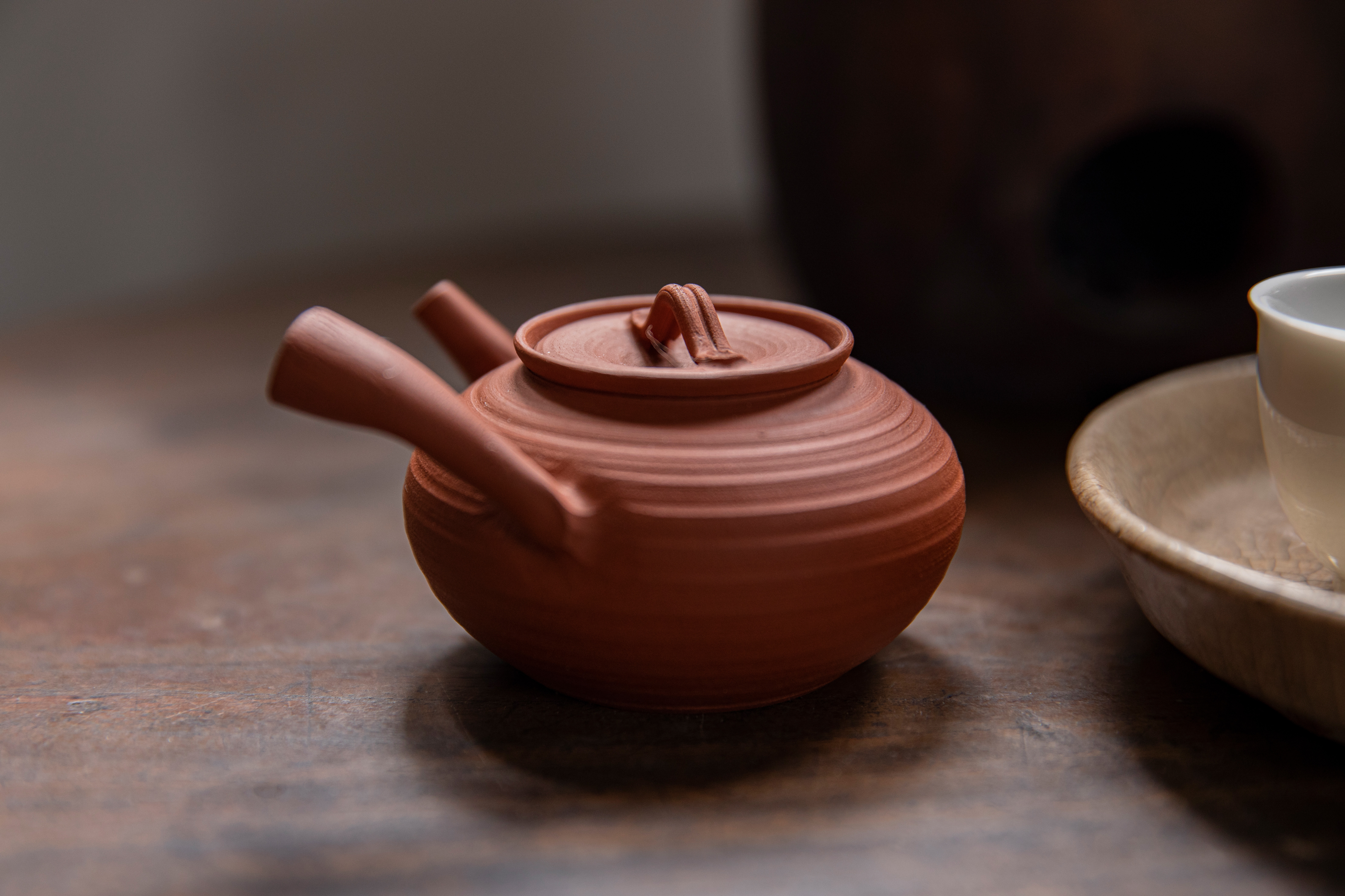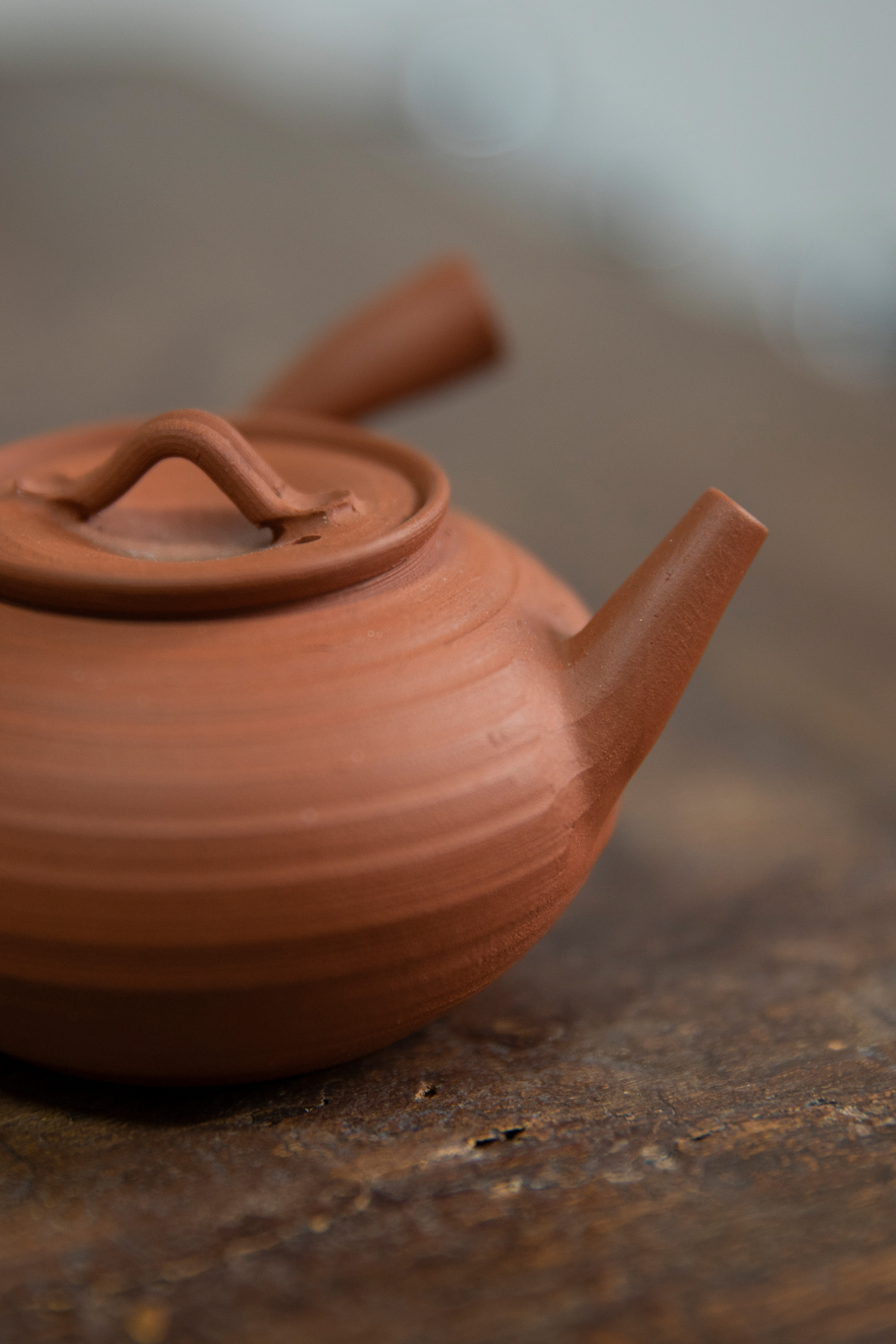 此件茶壶就是一件潮汕红泥刷浆手拉急须壶。急须壶,又称侧把壶,其来源是唐代煎茶器。其壶型姿态优美,采用左侧把的形式,壶身壶嘴比例协调,小巧精致,是烹制潮州工夫茶的绝佳器具。