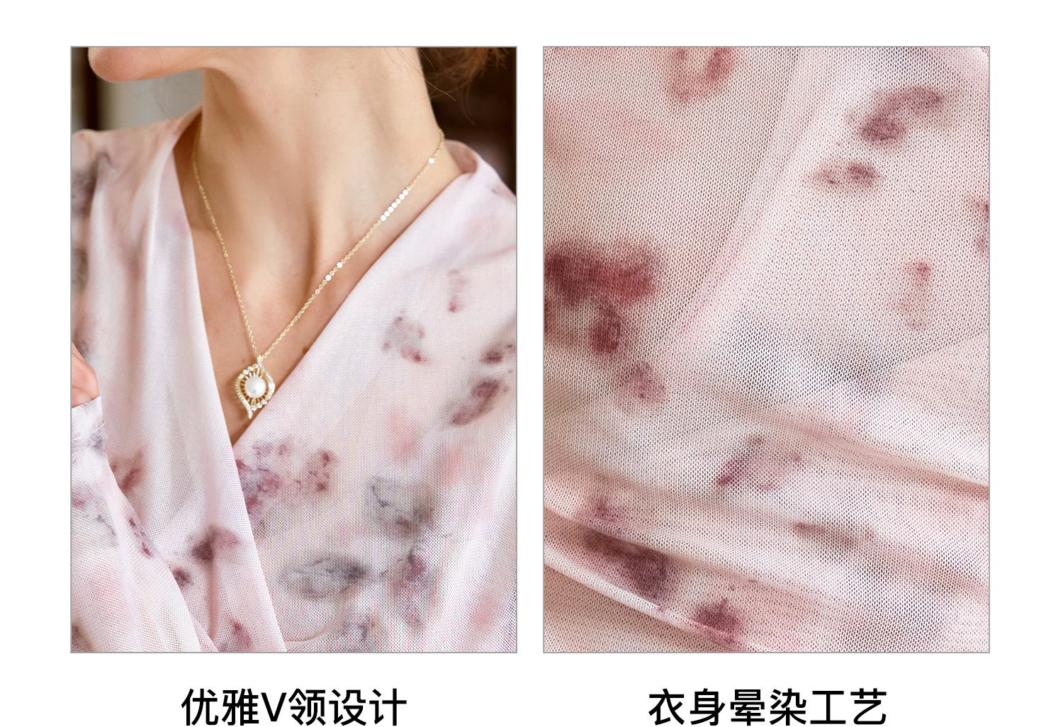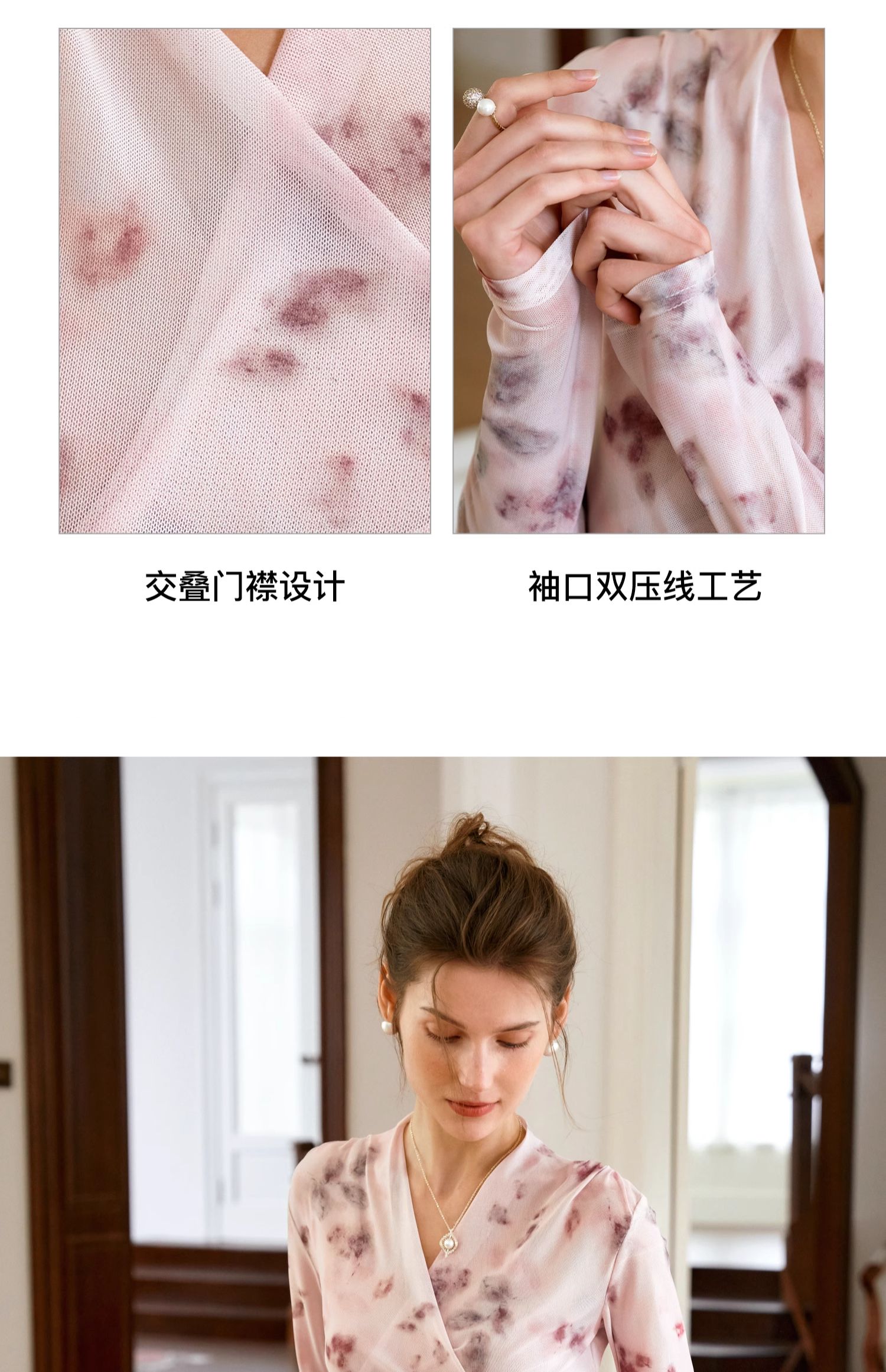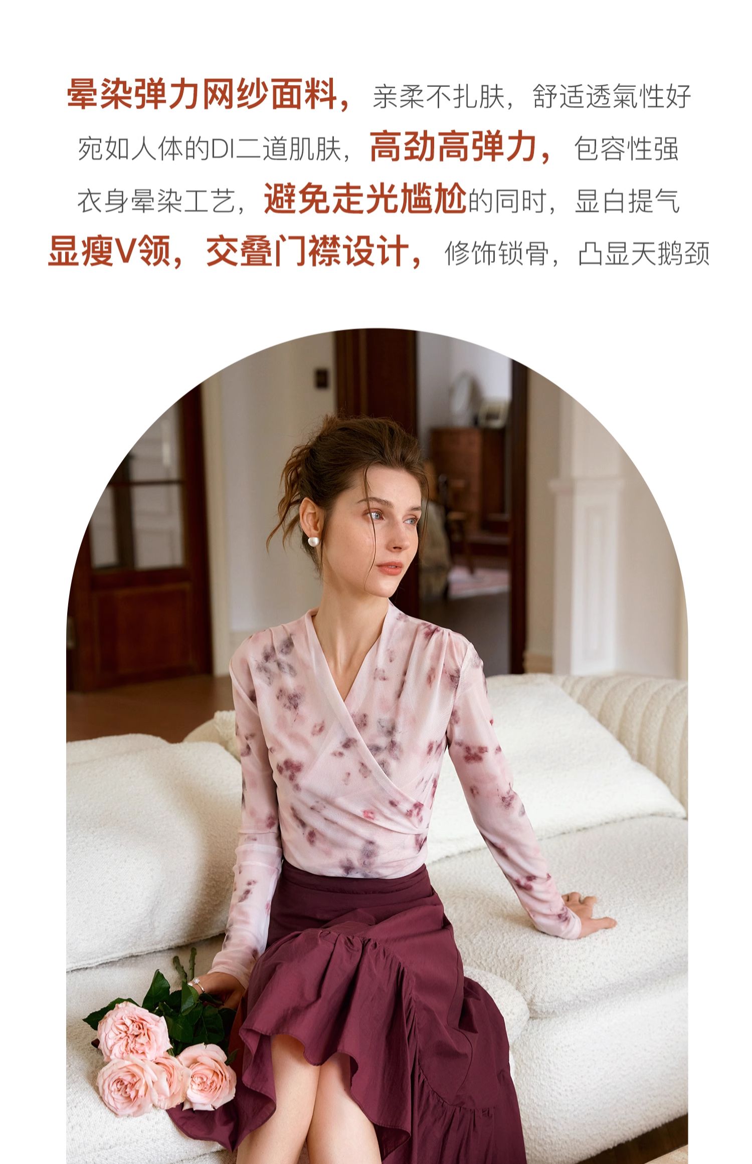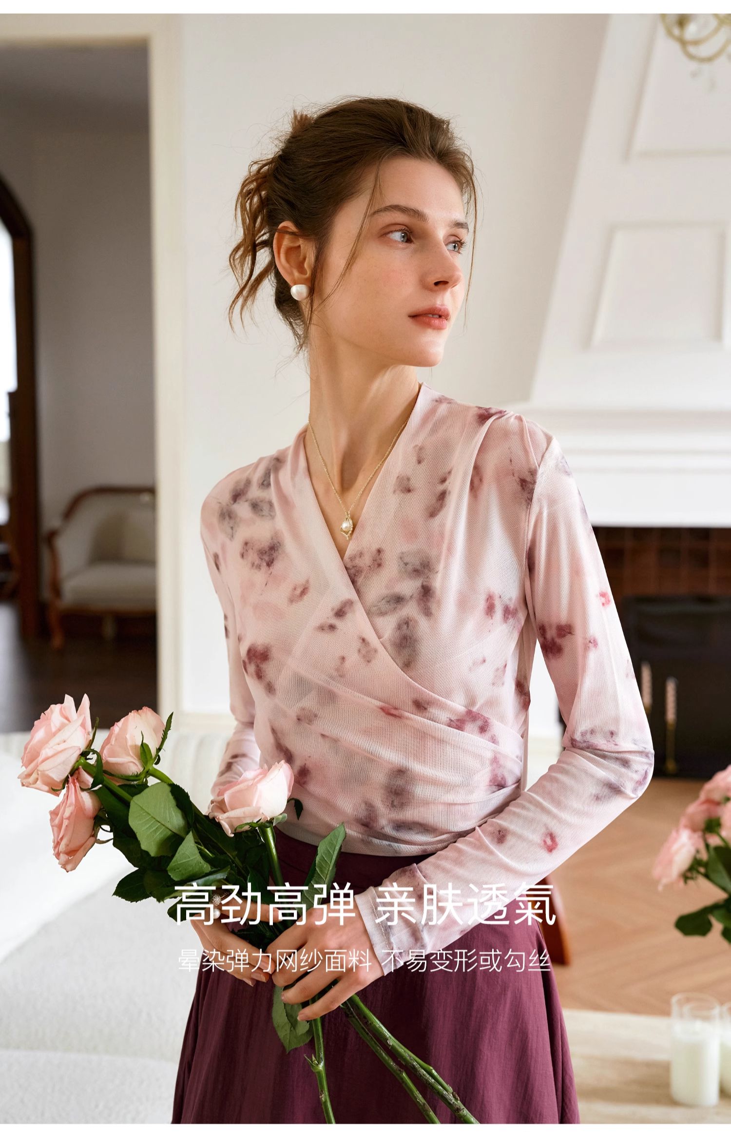 欧芮儿2024夏秋季新款V领修身短款长袖T恤扎染网纱粉色打底衫女