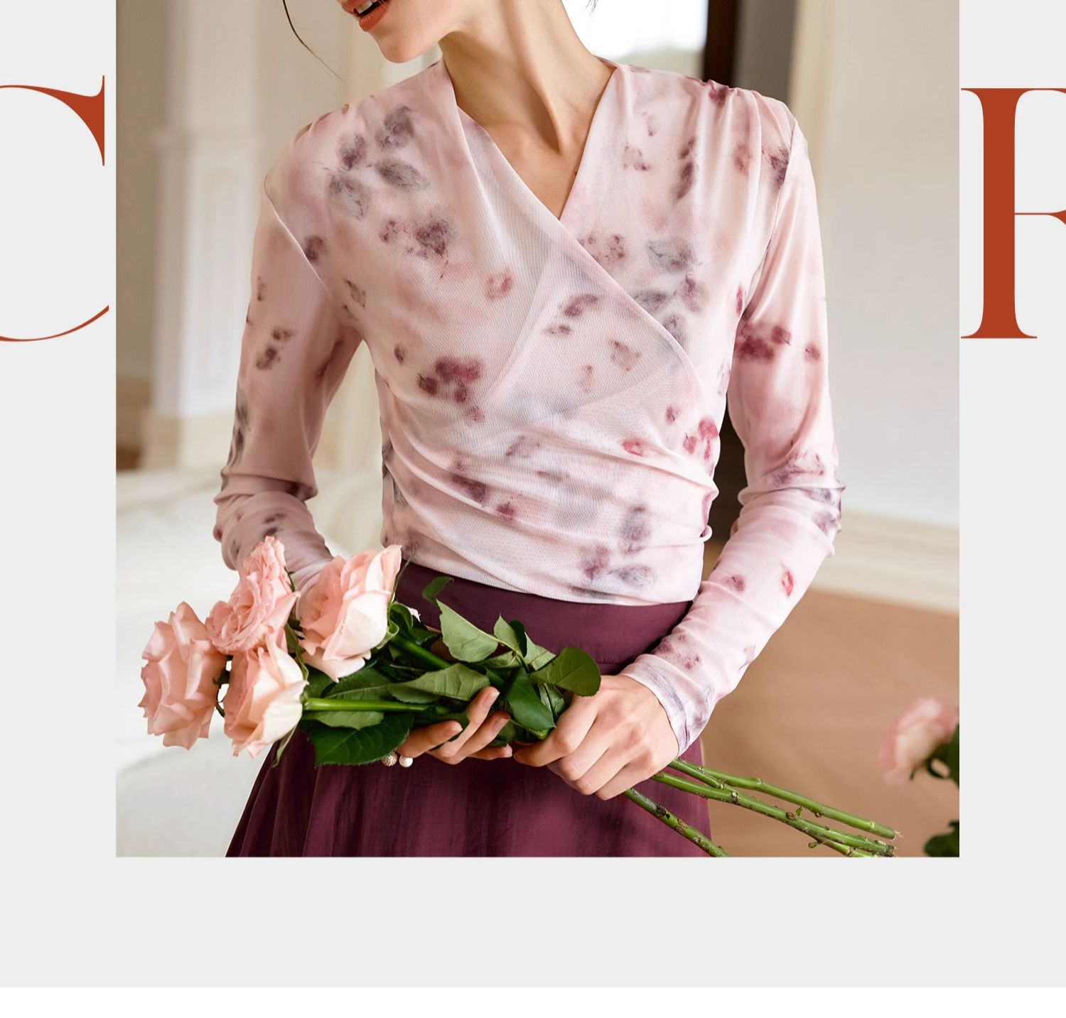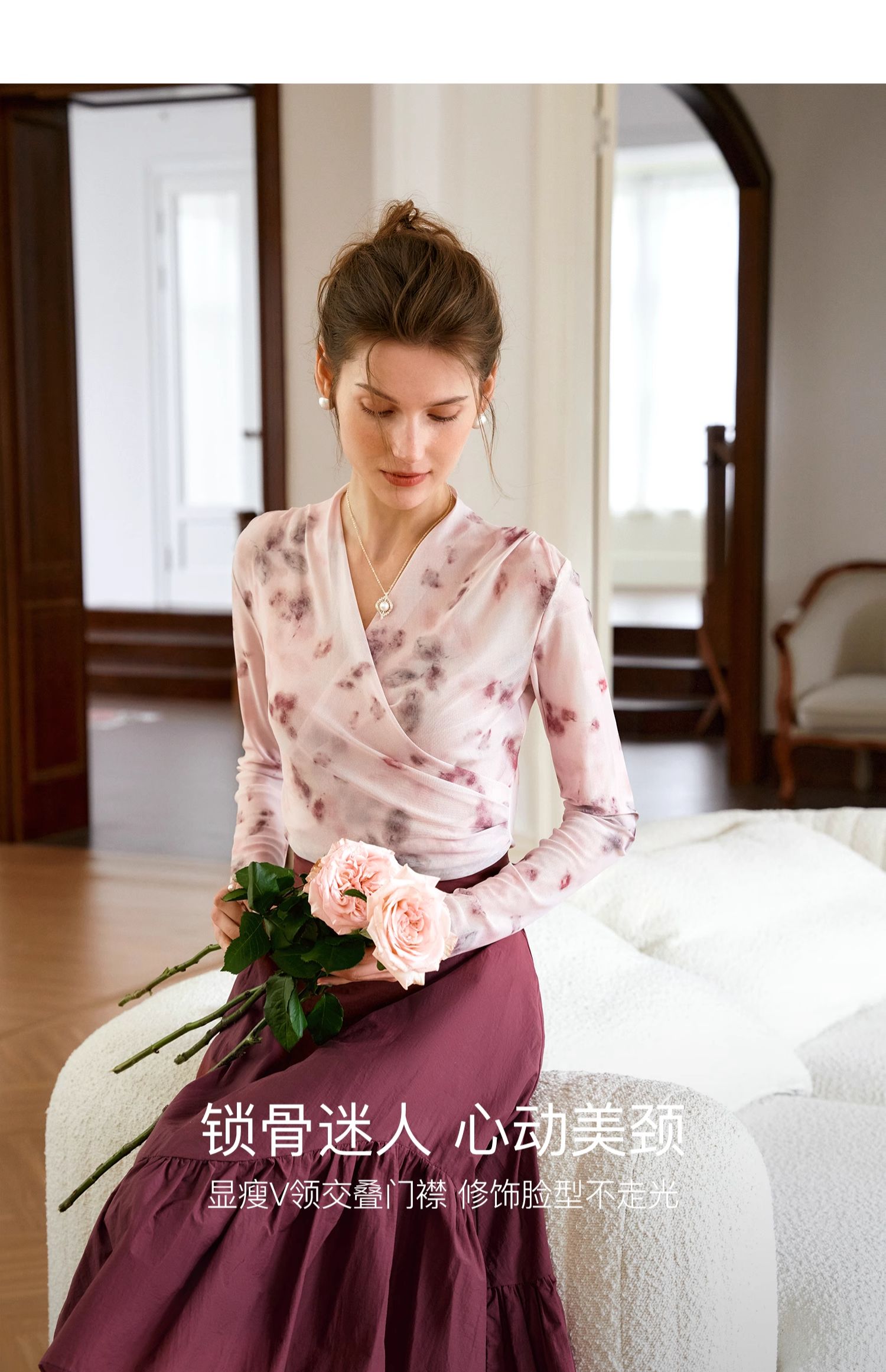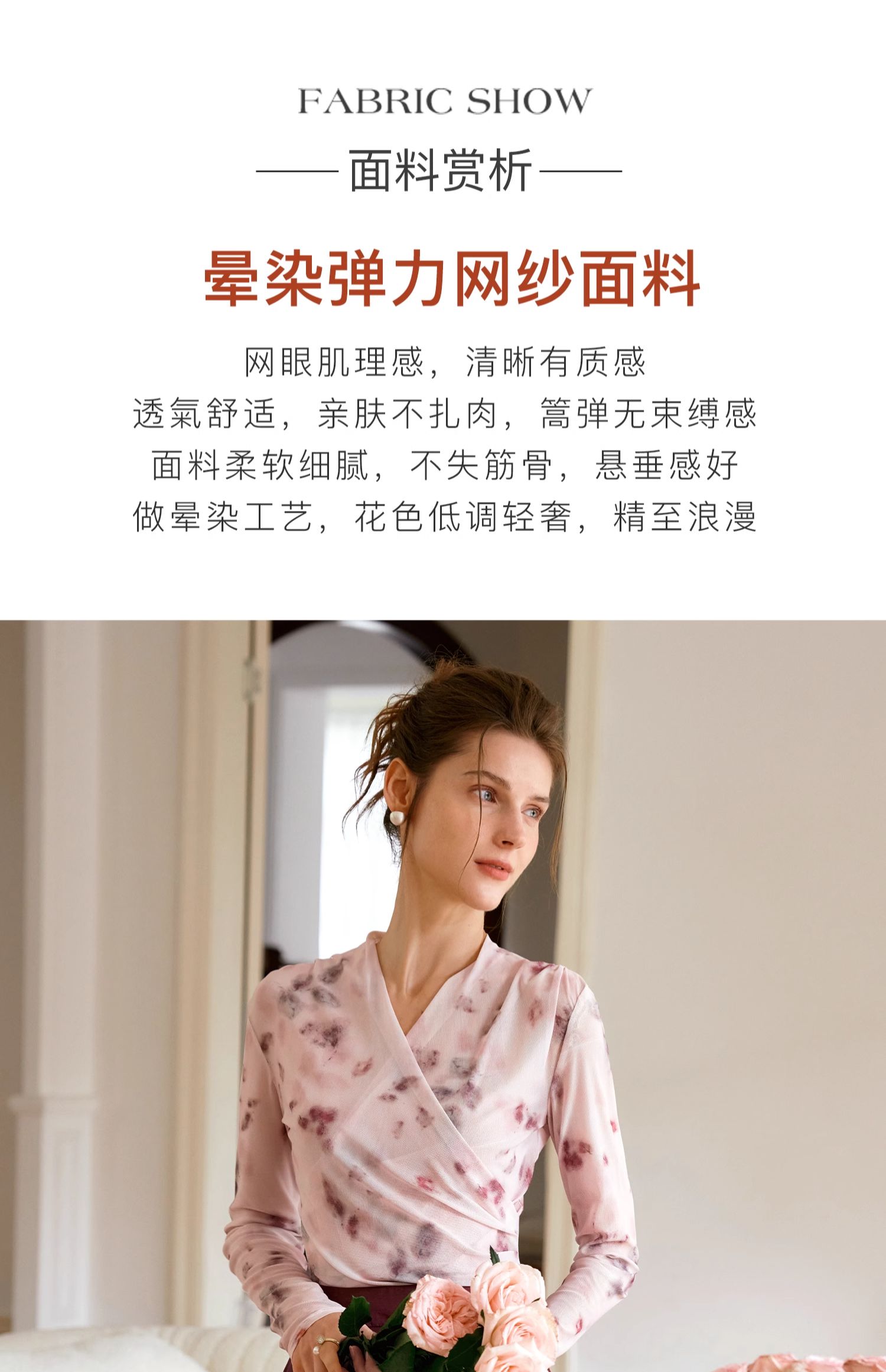 欧芮儿2024夏秋季新款V领修身短款长袖T恤扎染网纱粉色打底衫女