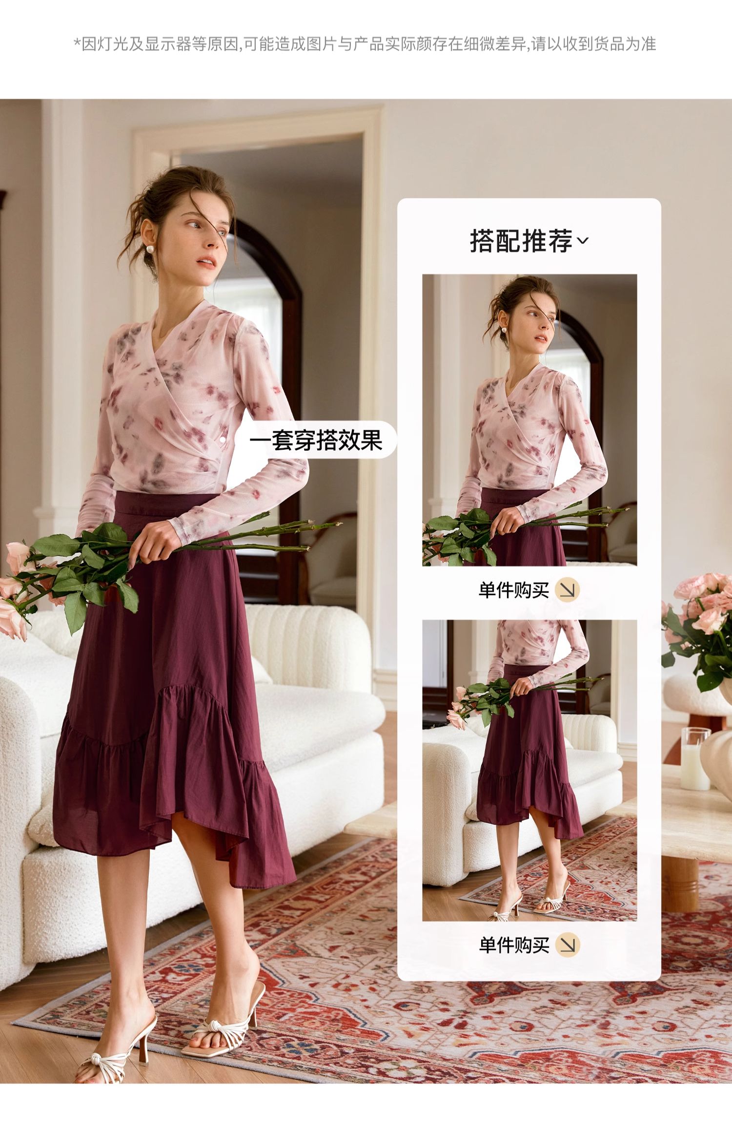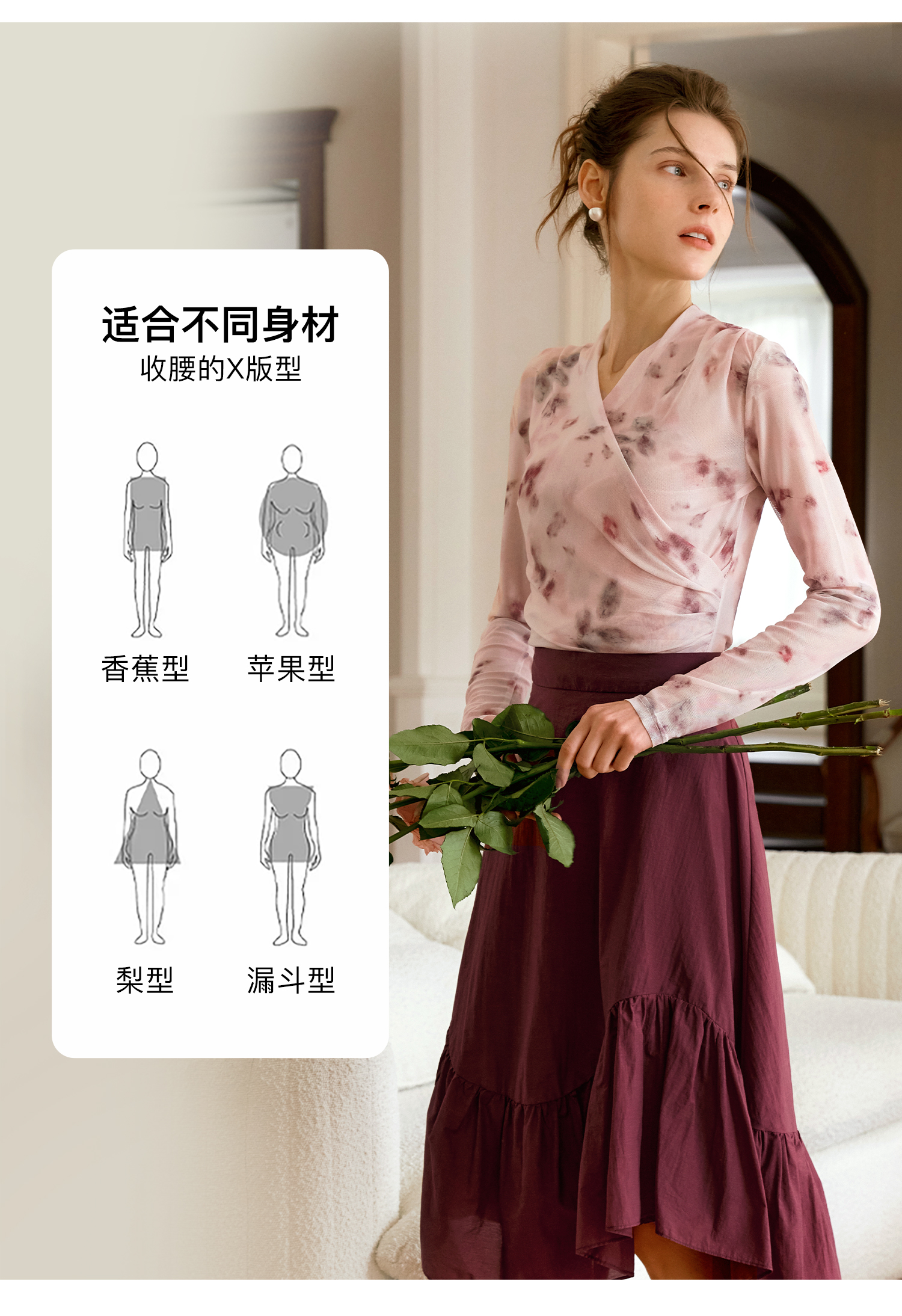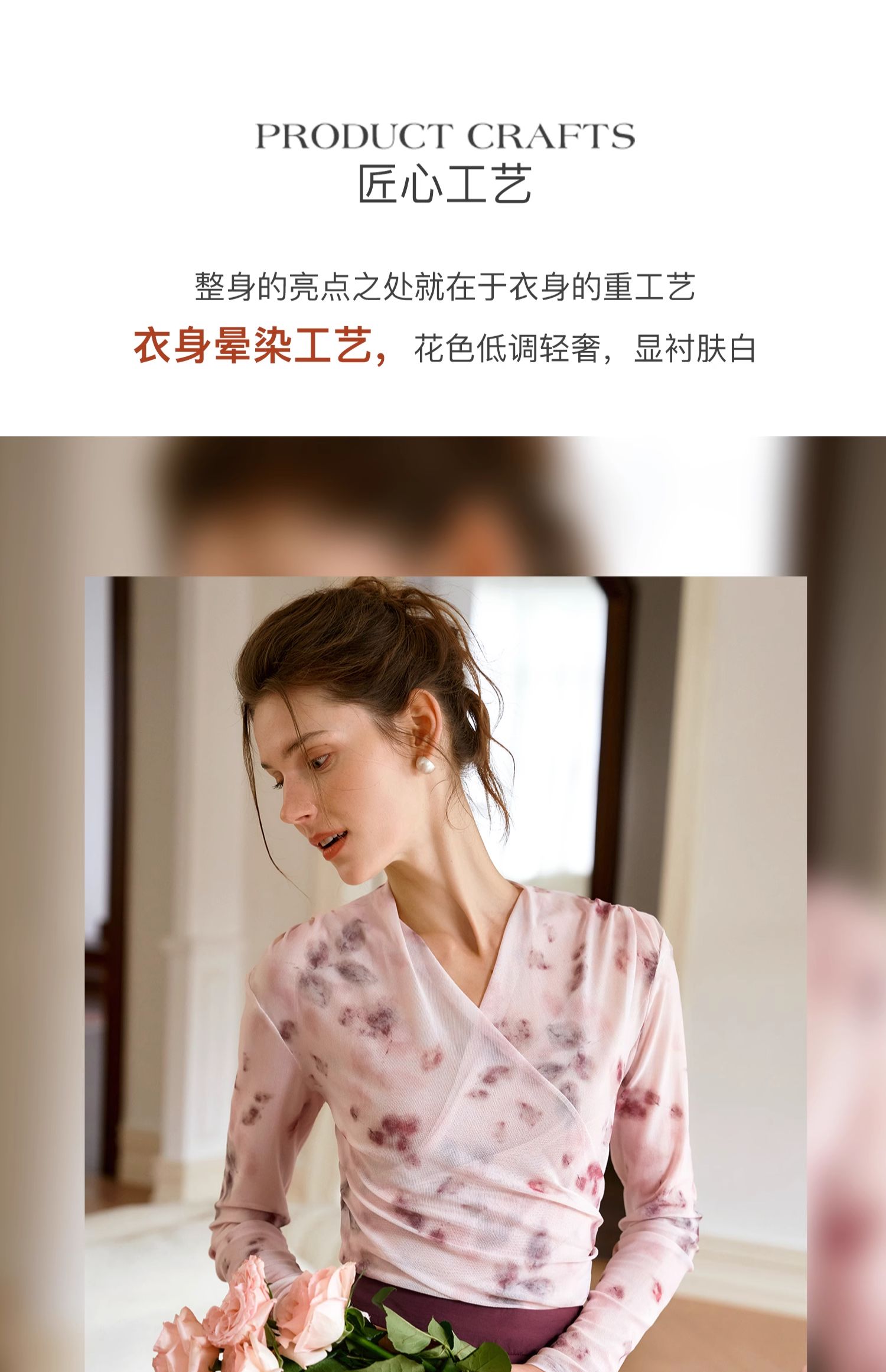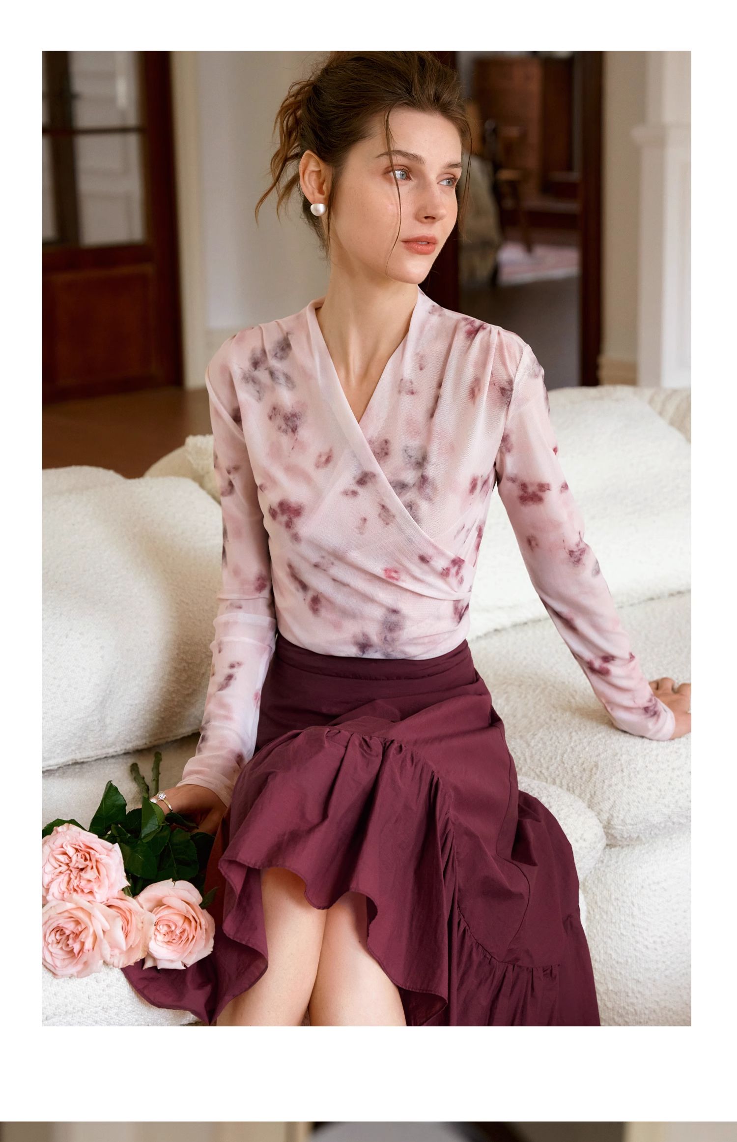 欧芮儿2024夏秋季新款V领修身短款长袖T恤扎染网纱粉色打底衫女