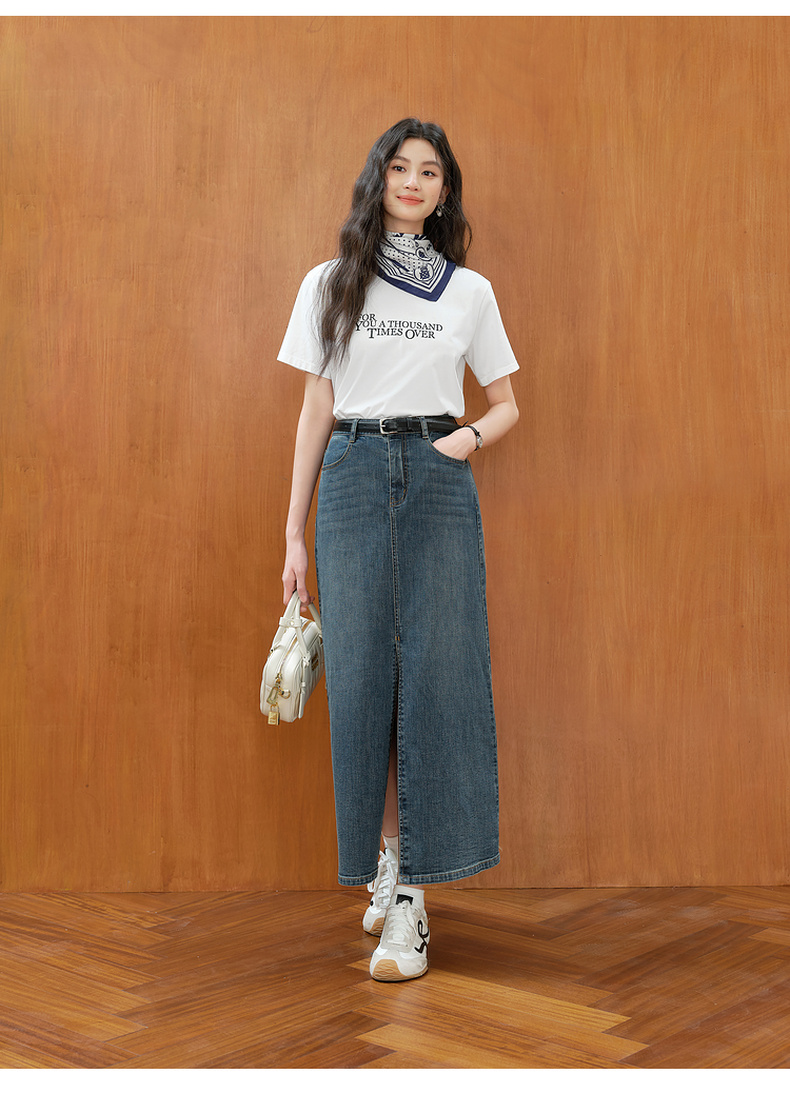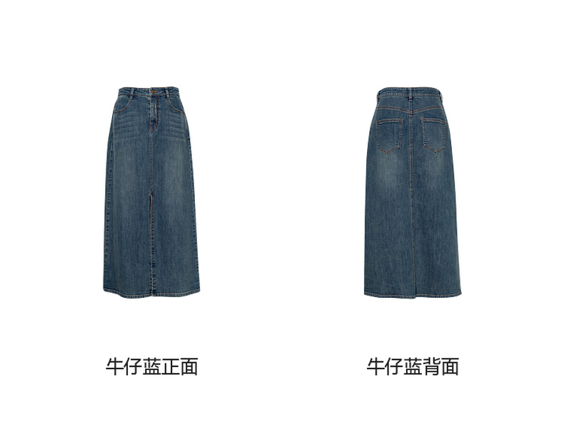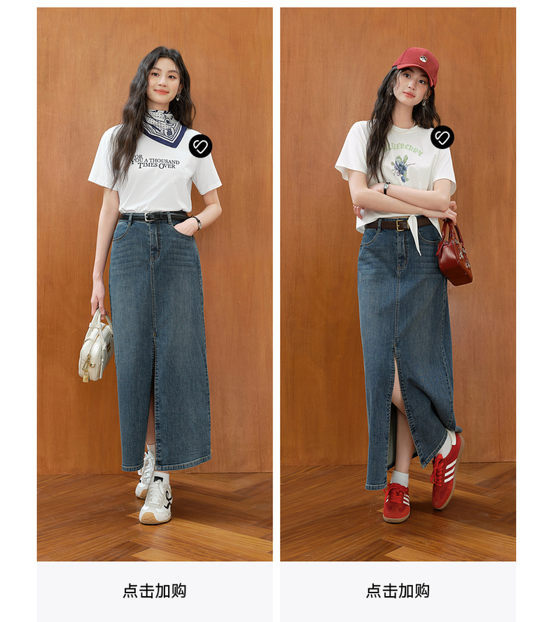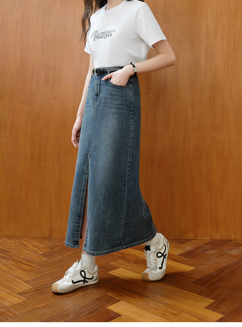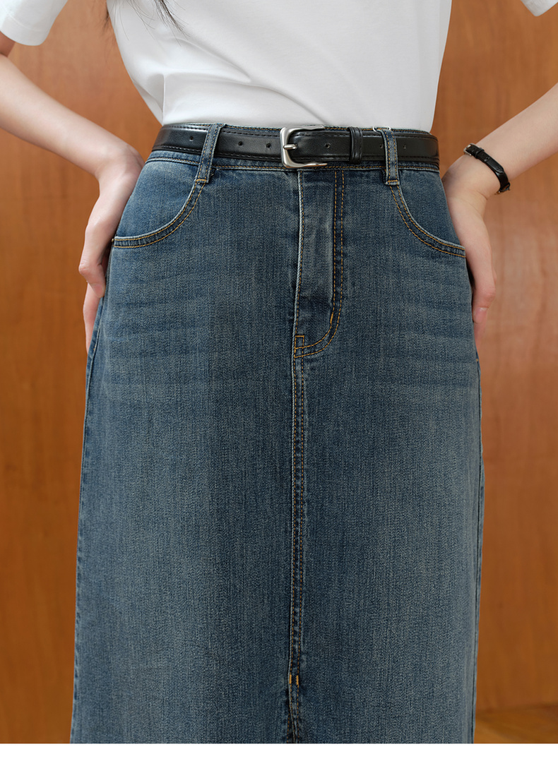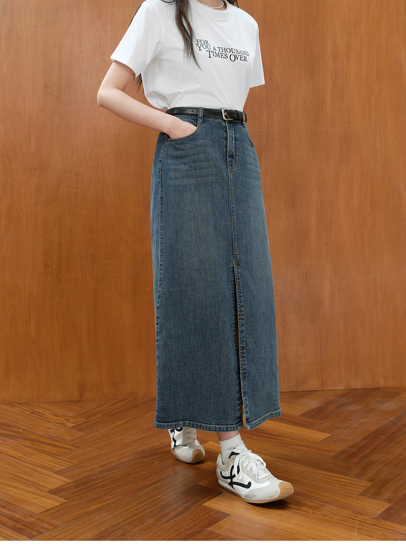 【严选】诗凡黎醋酸棉复古牛仔半身裙2025秋新款开叉A字百搭显瘦中长裙女7G7340511