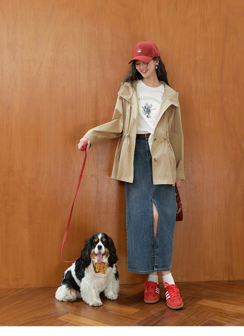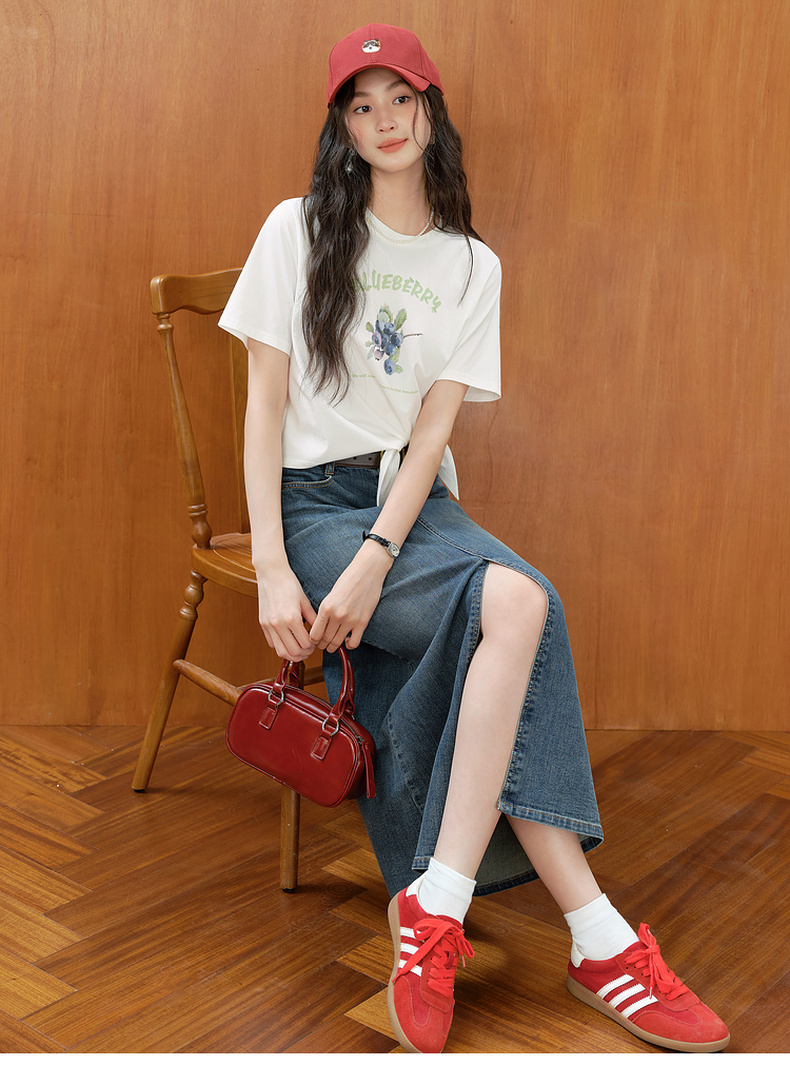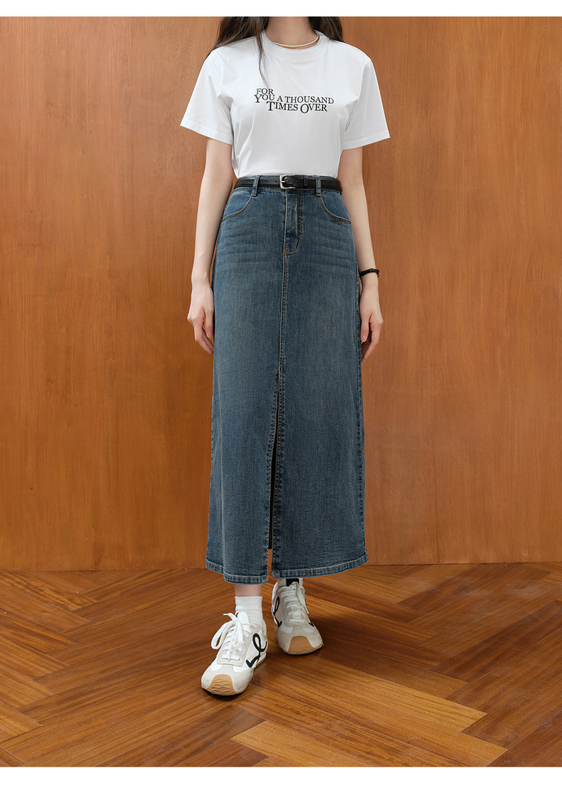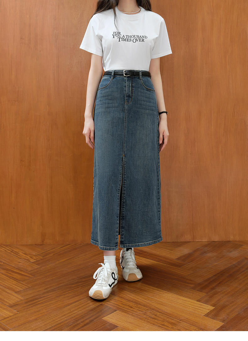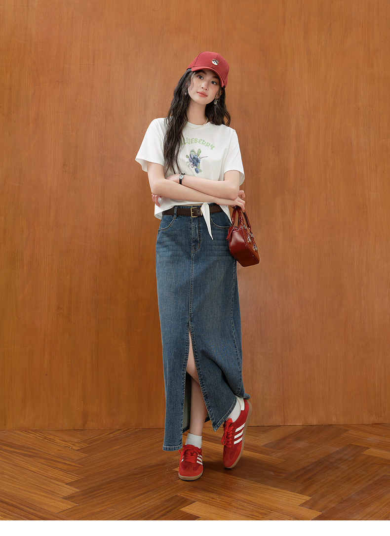 【严选】诗凡黎醋酸棉复古牛仔半身裙2025秋新款开叉A字百搭显瘦中长裙女7G7340511