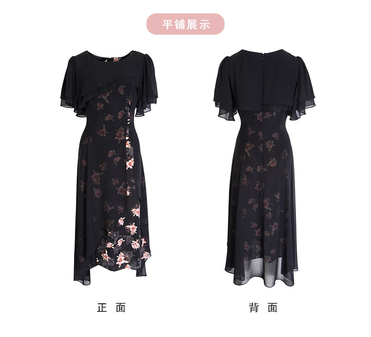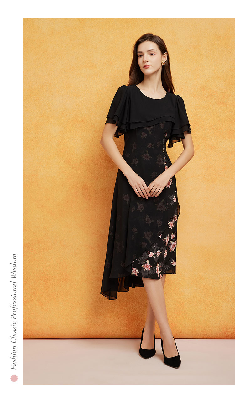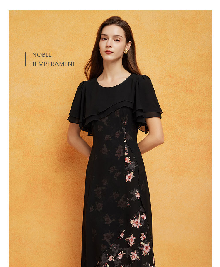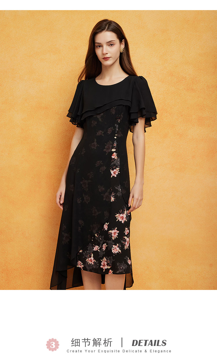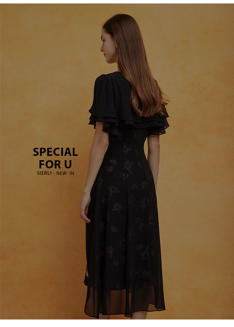 PF8D5斯尔丽24新款法式浪漫不规则荷叶飘逸雪纺朦胧复古印花收腰连衣裙