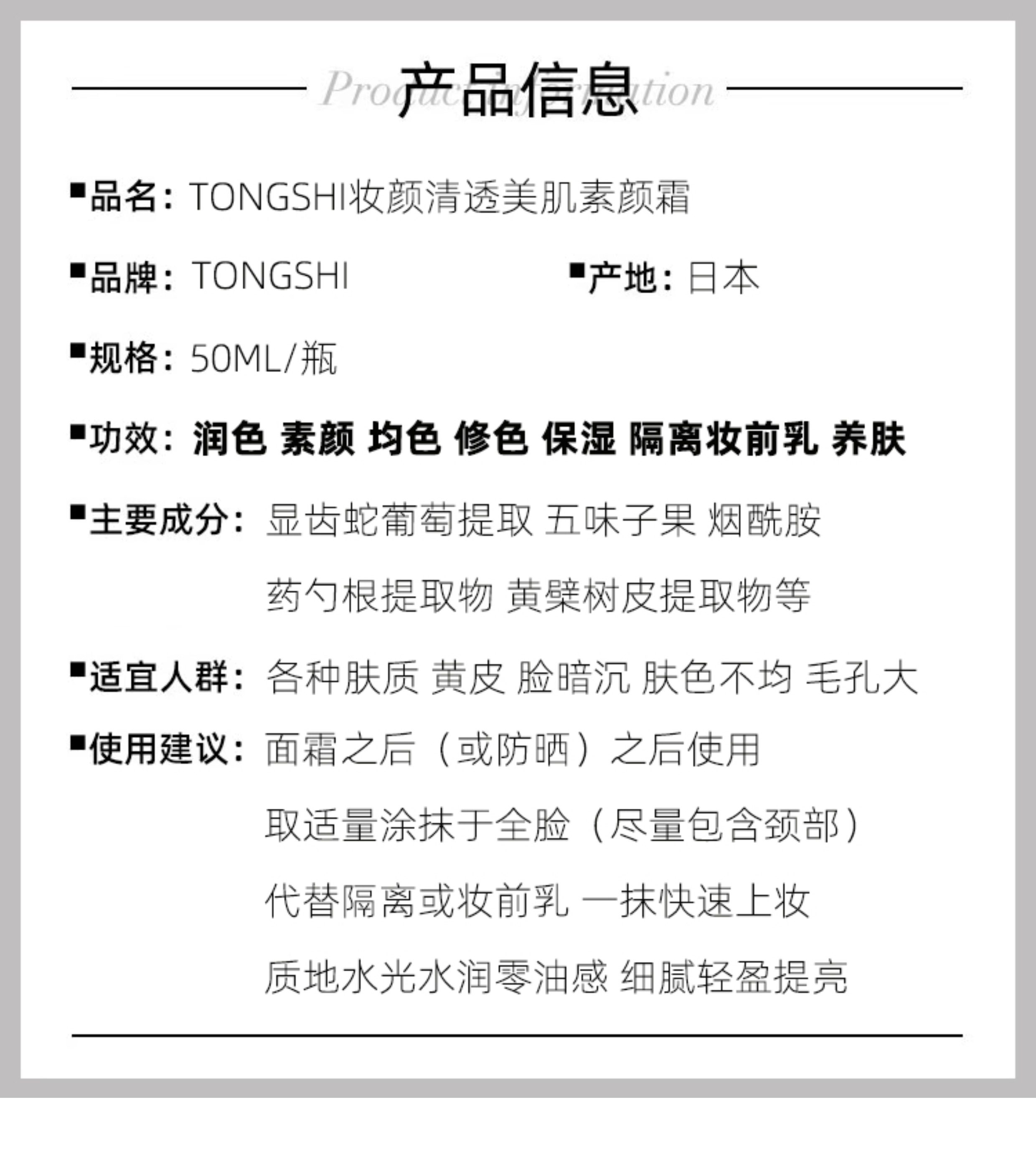 妈生好皮!日本TONGSHI素颜霜 妆前乳隔离养肤贵妇脸部懒人霜50ML