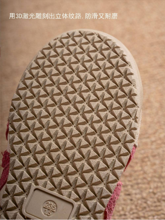 品牌定制橡胶大底: 选用运动鞋级别大底 用3d激光雕刻出立体防滑纹纹路 舒适、美观且防滑三位一体,带来走路新体验