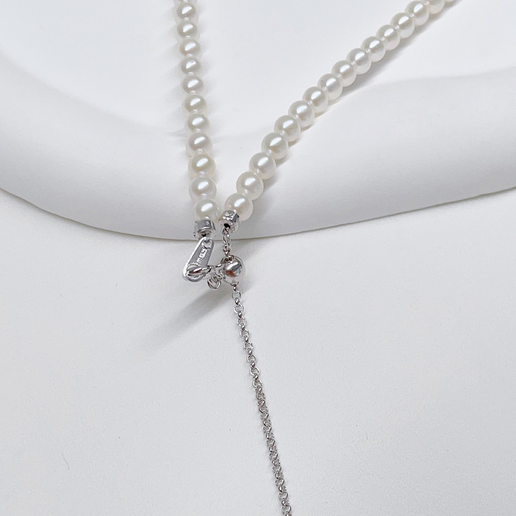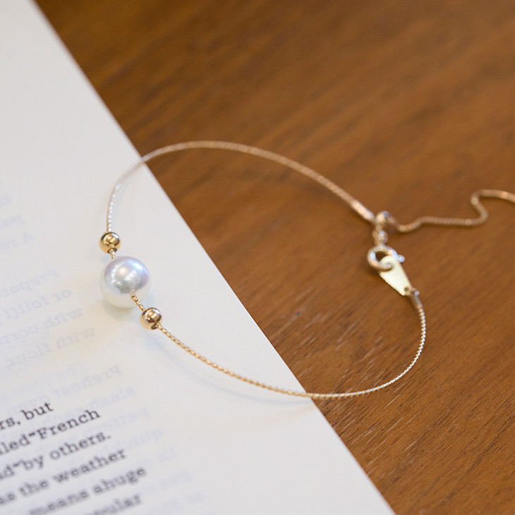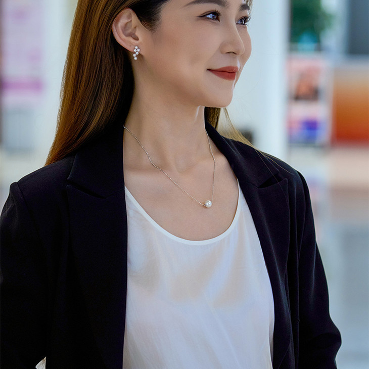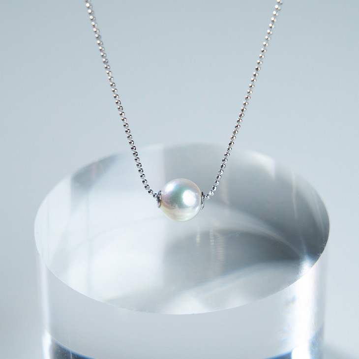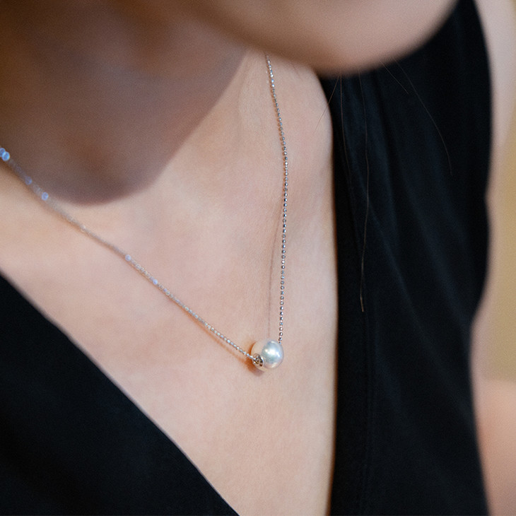 一颗直径8-9mm的Akoya珍珠由纤细O形链串起,戴上长度恰到锁骨处。