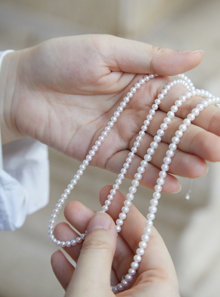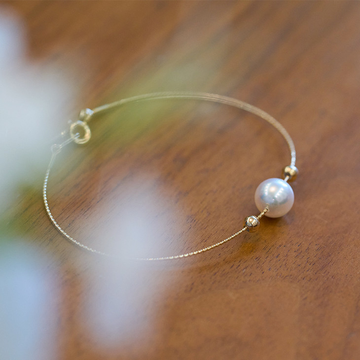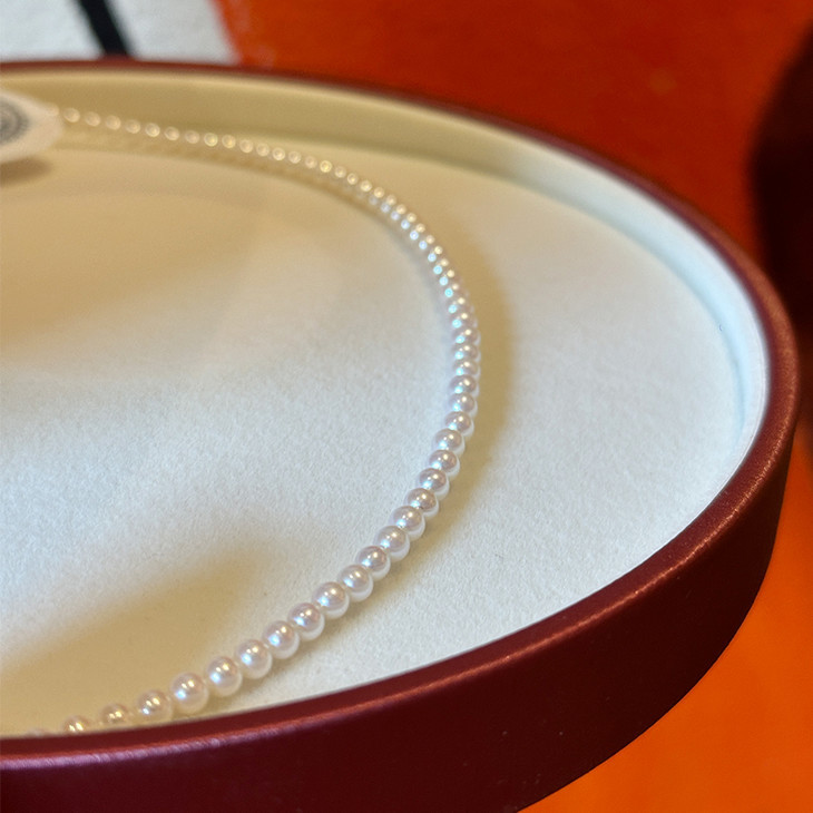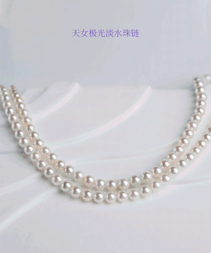 和传统的珍珠项链不同,8-8.5mm珍珠+搭配几乎隐身的细鱼线,远看像极了落在颈间的人鱼泪,充分突出了Akoya珍珠的光泽美感,好美好美~