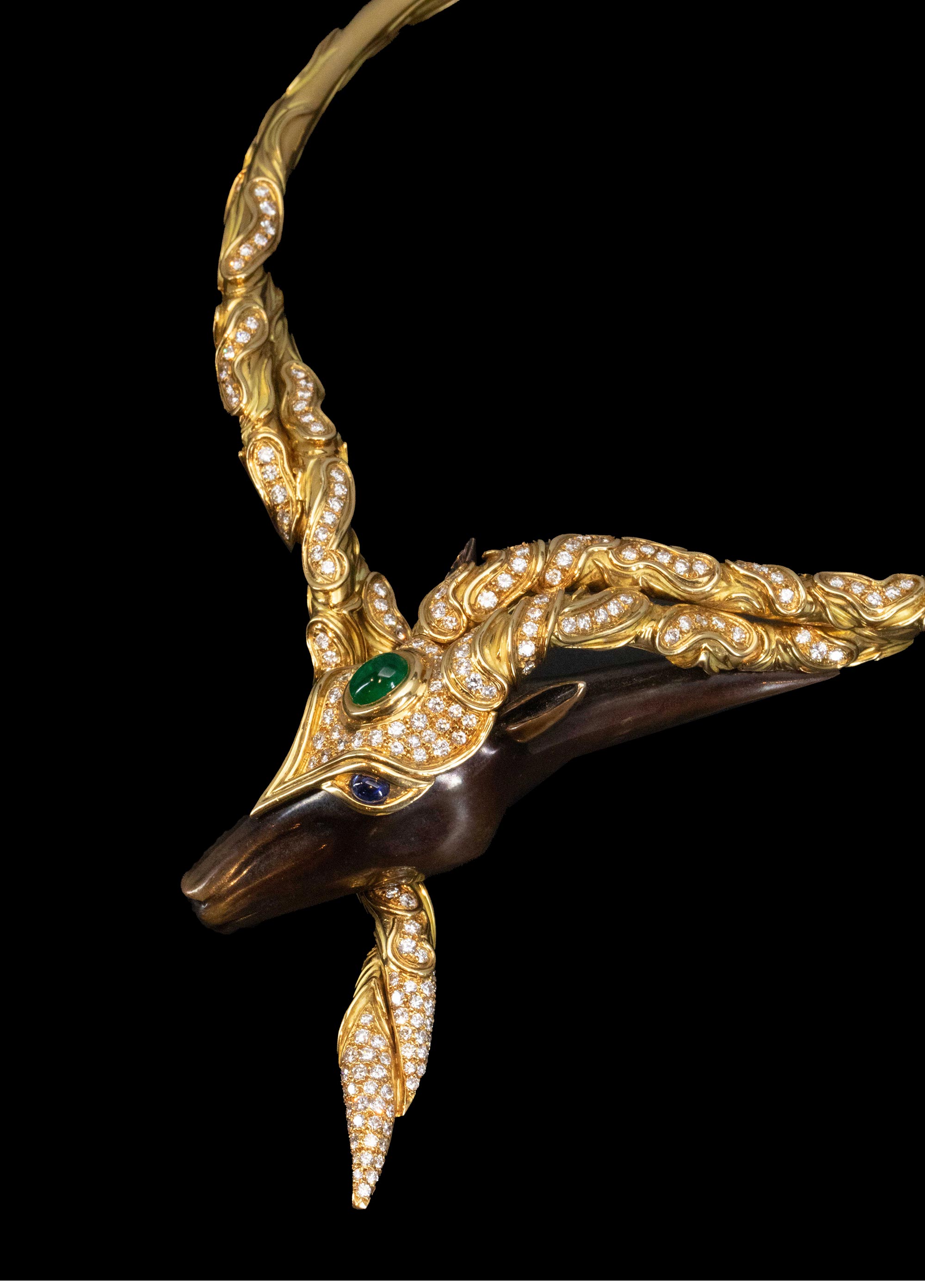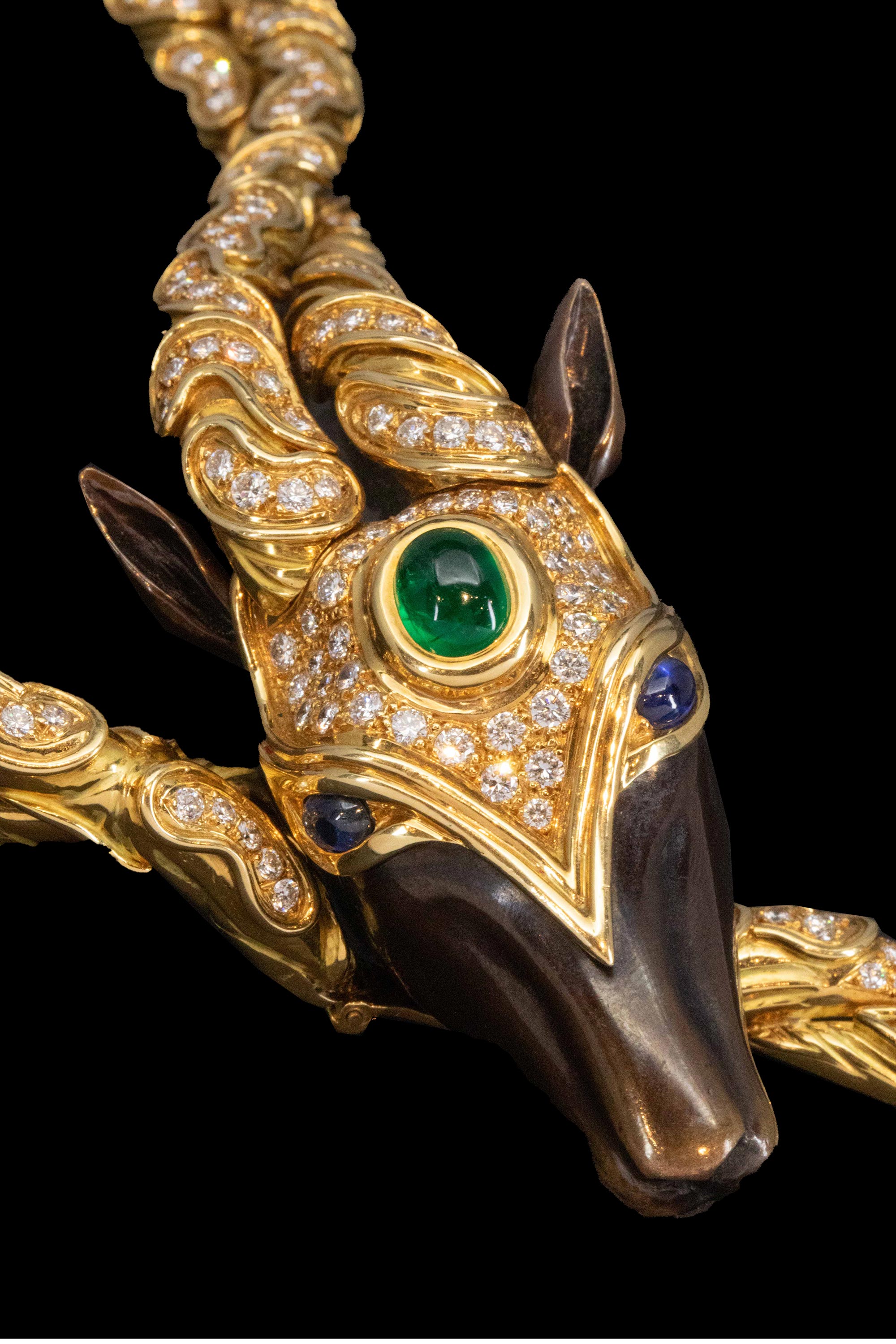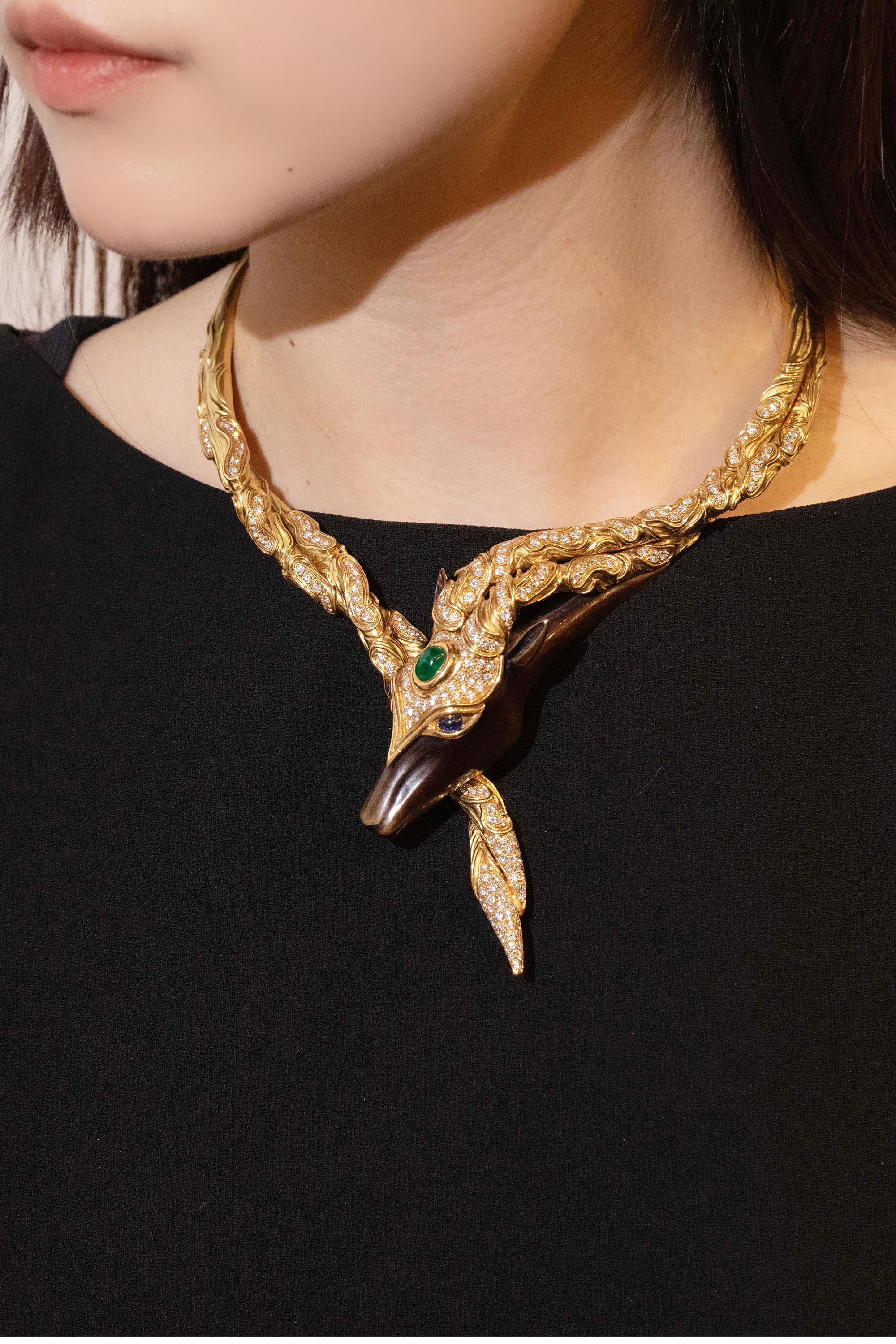 1970年代法国顶级珠宝品牌尚美Chaumet出品骏马造型18K黄金装饰青铜镶嵌钻石祖母绿及蓝宝石项链 带原盒