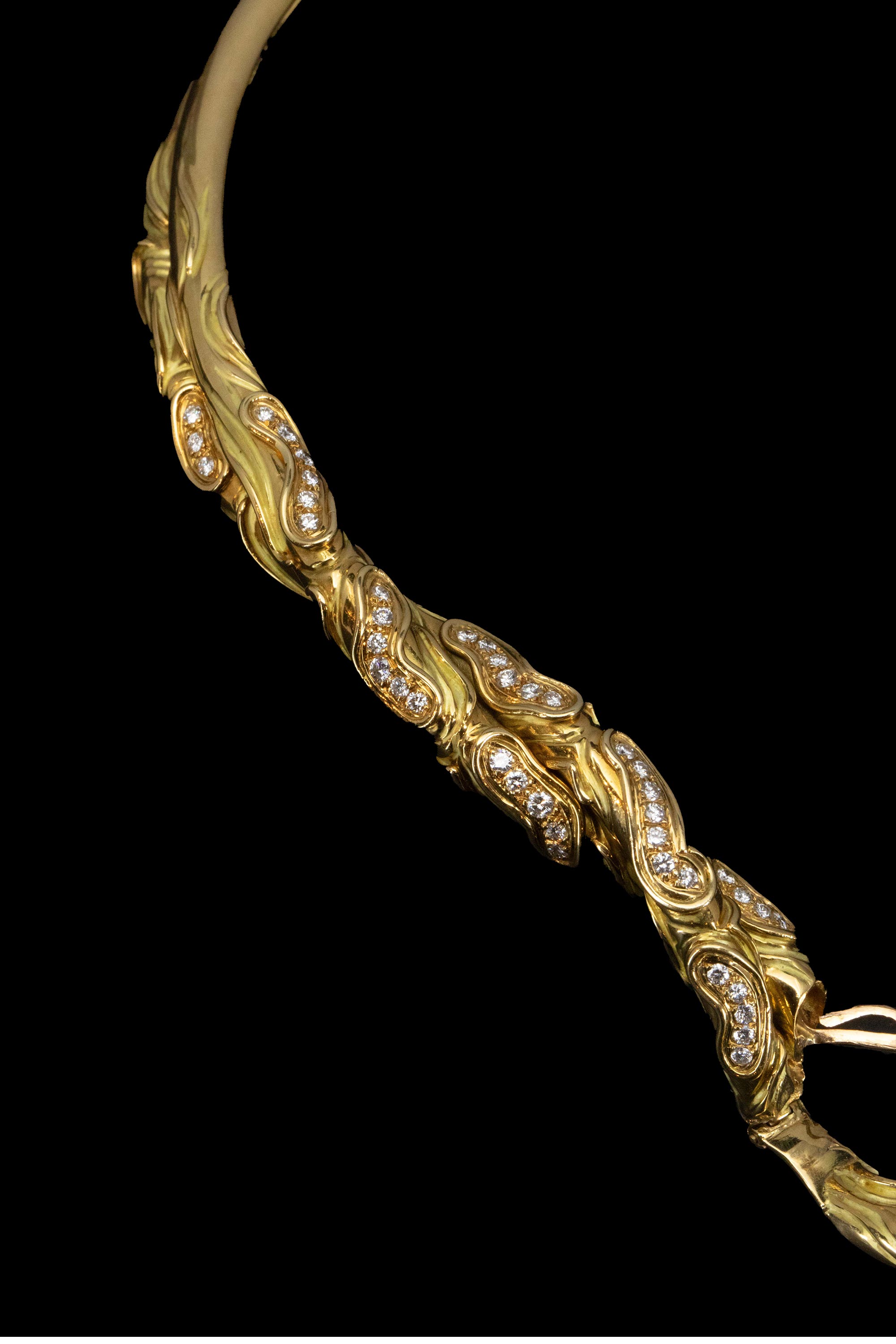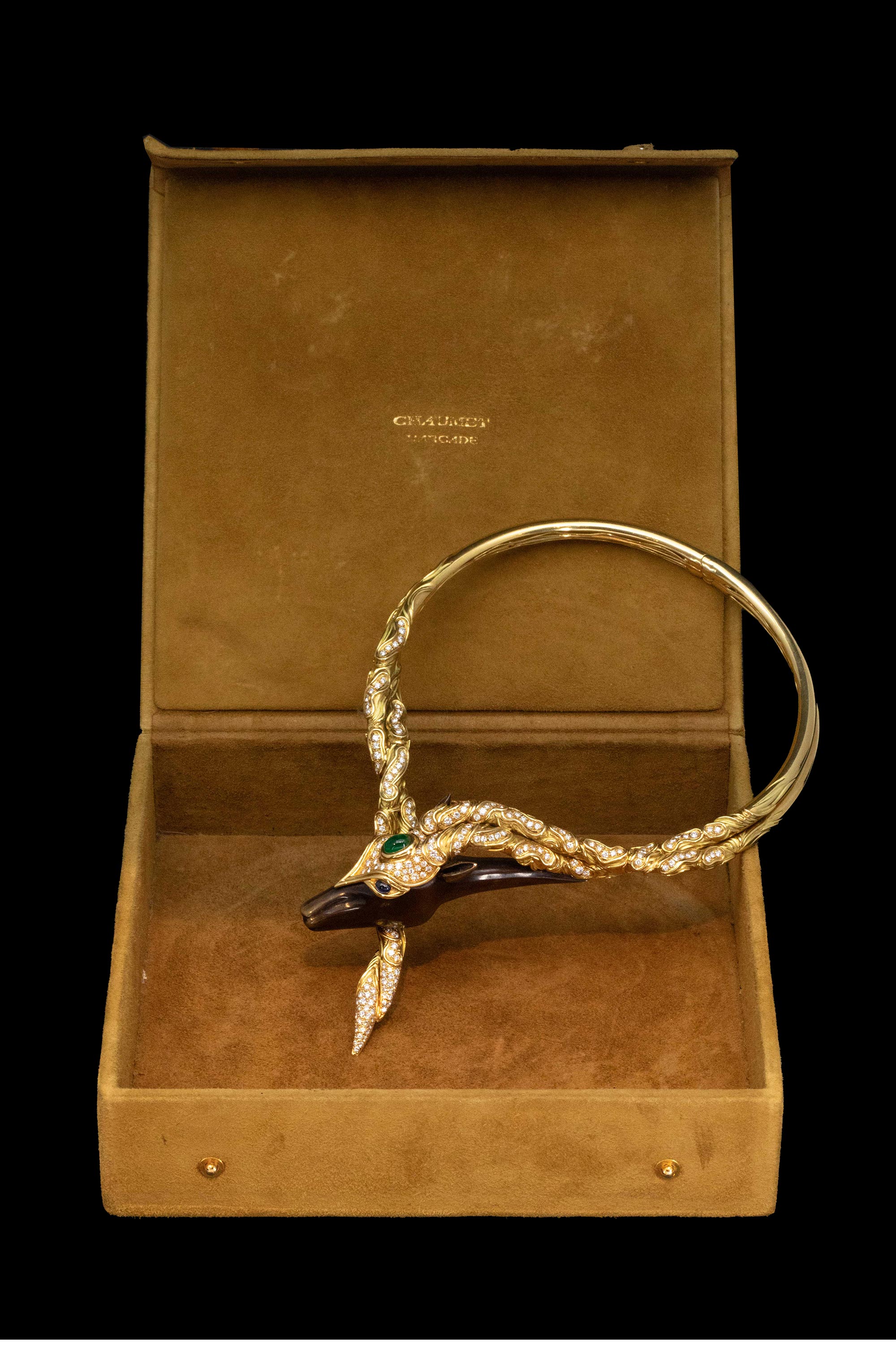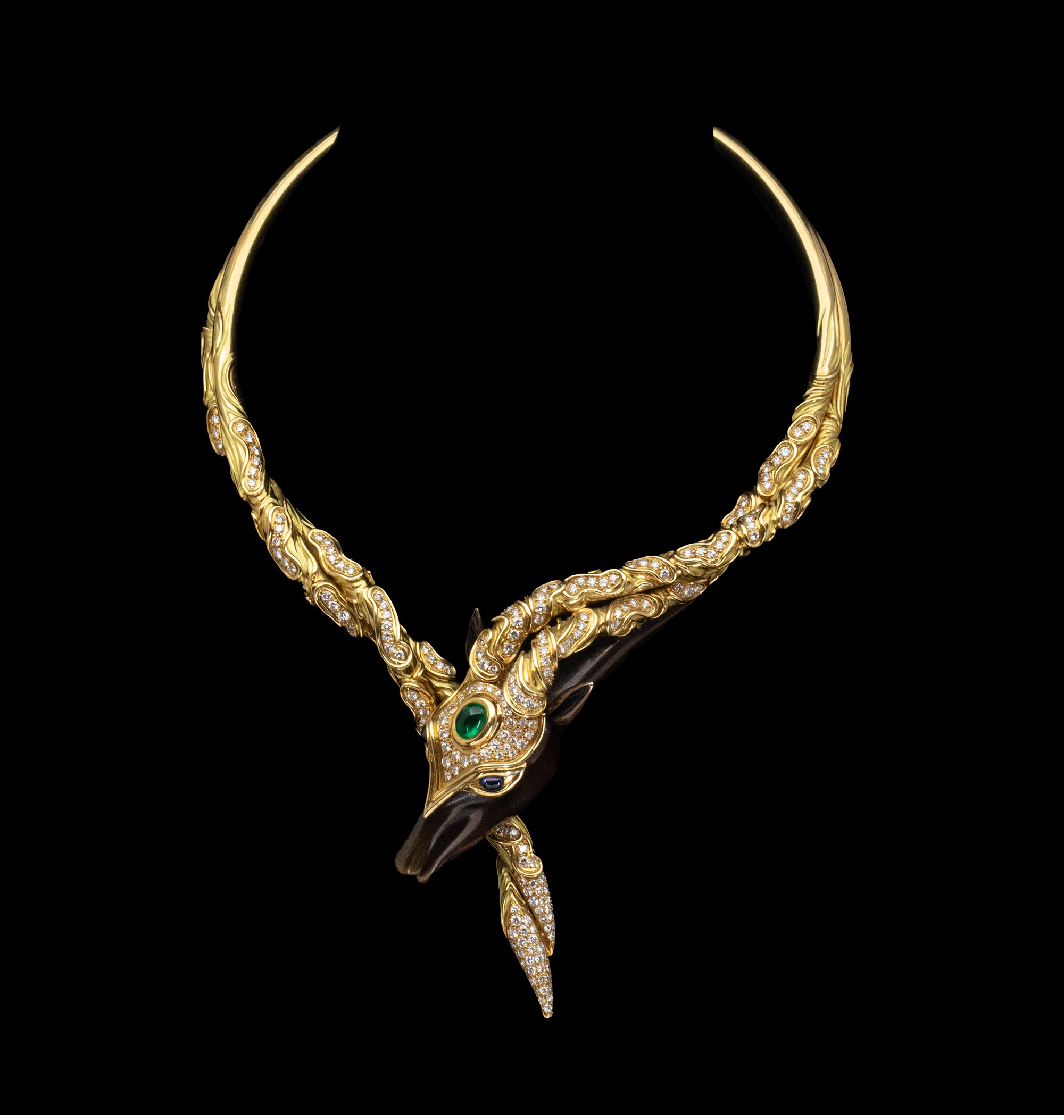 1970年代法国顶级珠宝品牌尚美Chaumet出品骏马造型18K黄金装饰青铜镶嵌钻石祖母绿及蓝宝石项链 带原盒