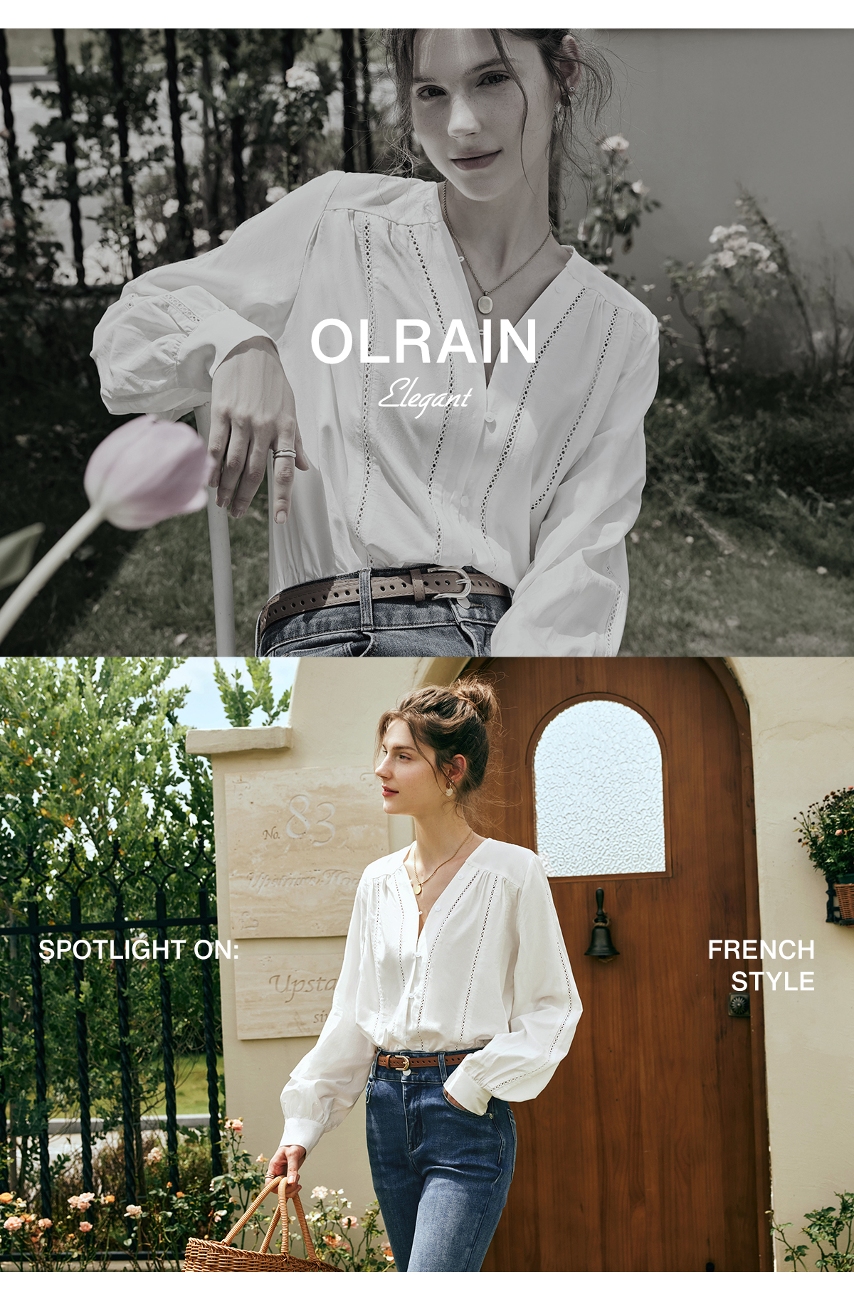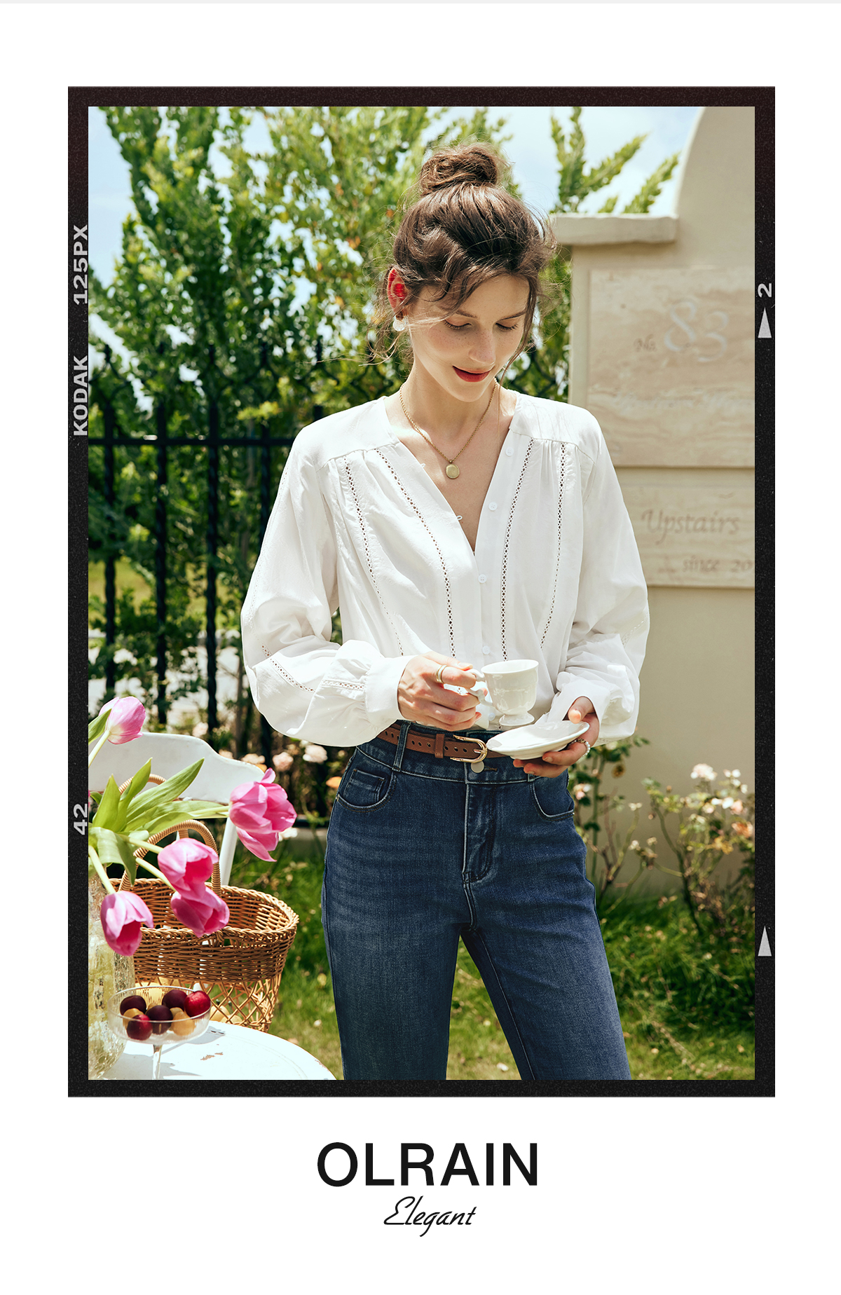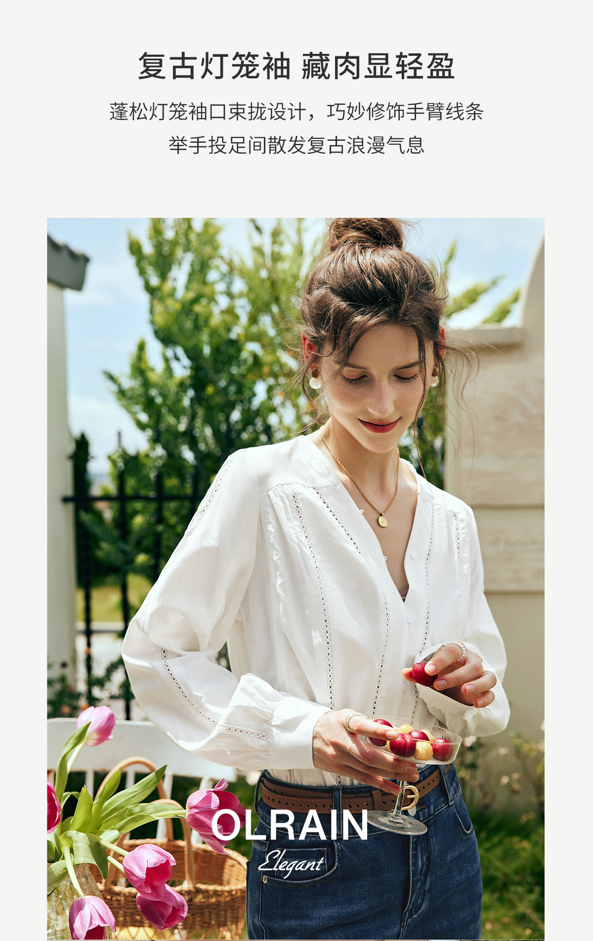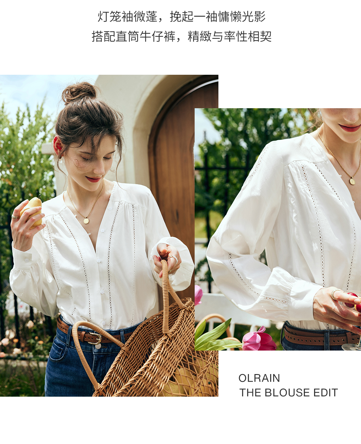 OLrain欧芮儿法式白色蕾丝镂空V领2025秋新款灯笼长袖衬衫女上衣