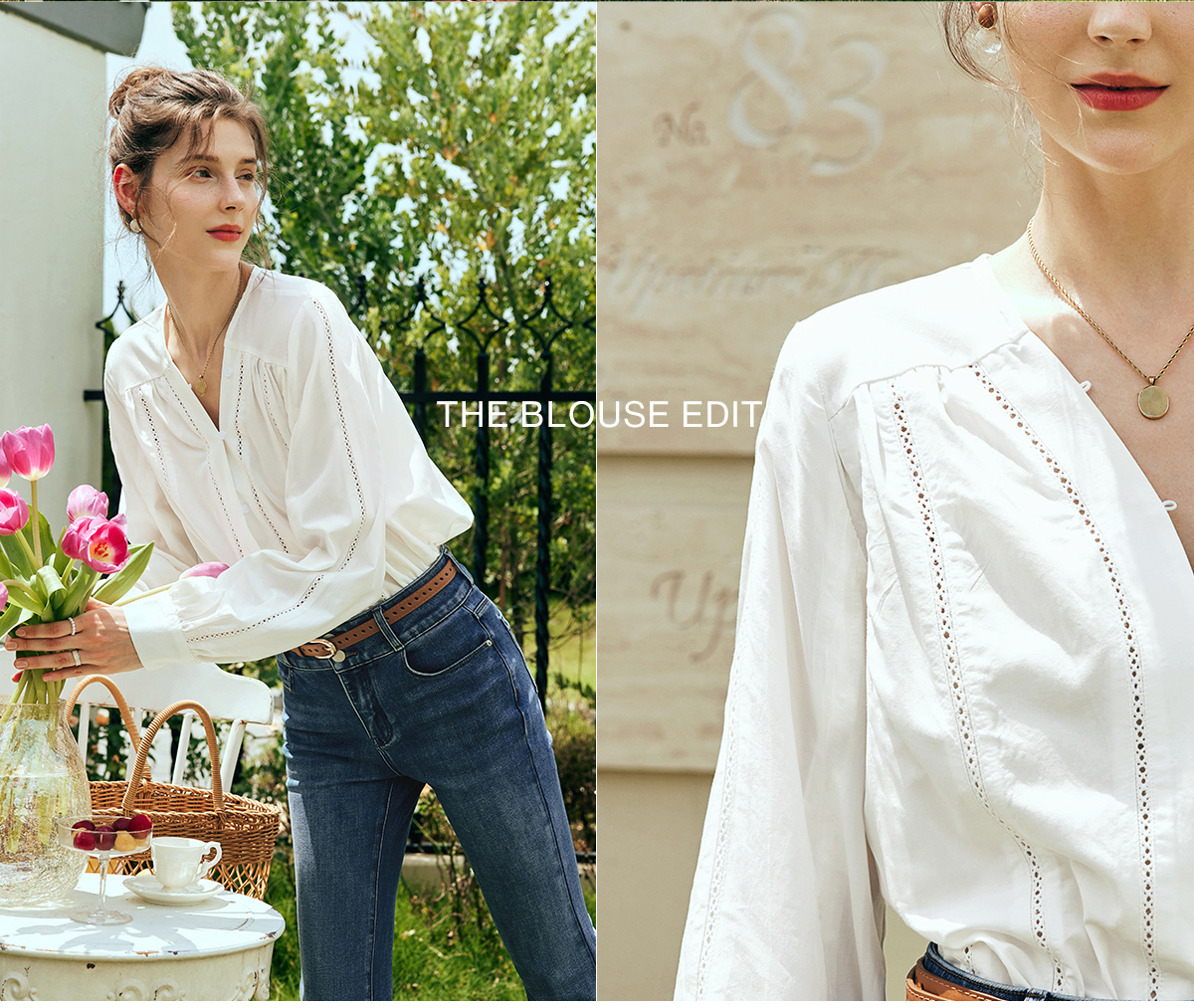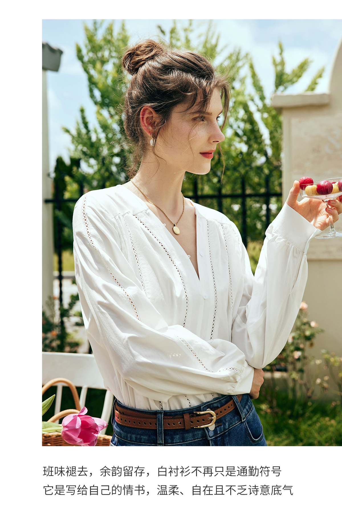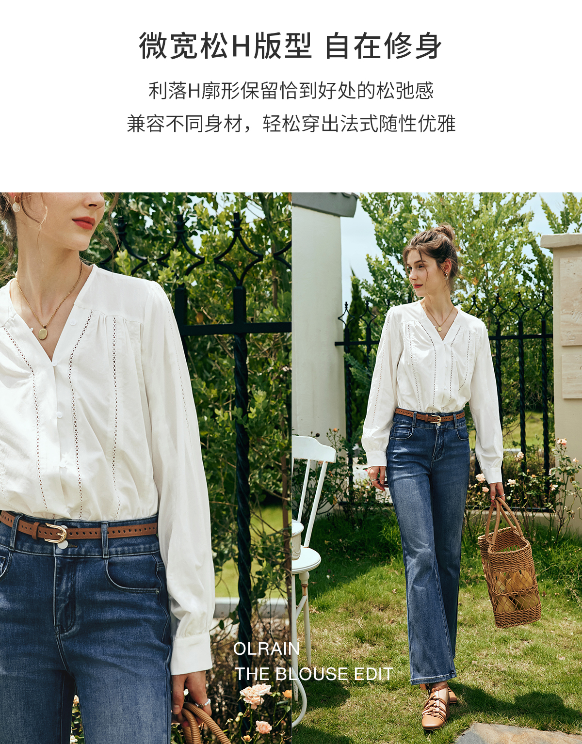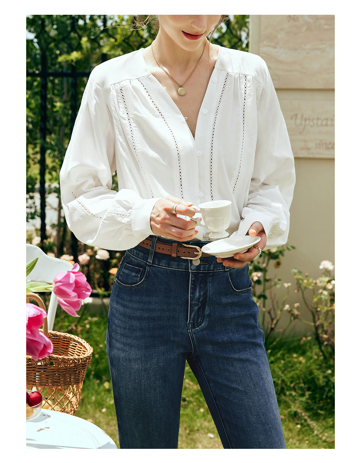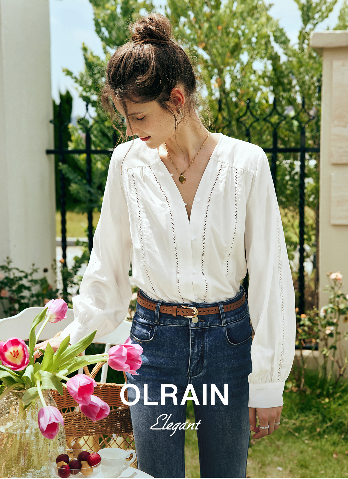 OLrain欧芮儿法式白色蕾丝镂空V领2025秋新款灯笼长袖衬衫女上衣