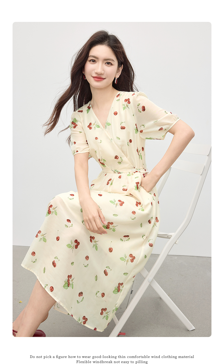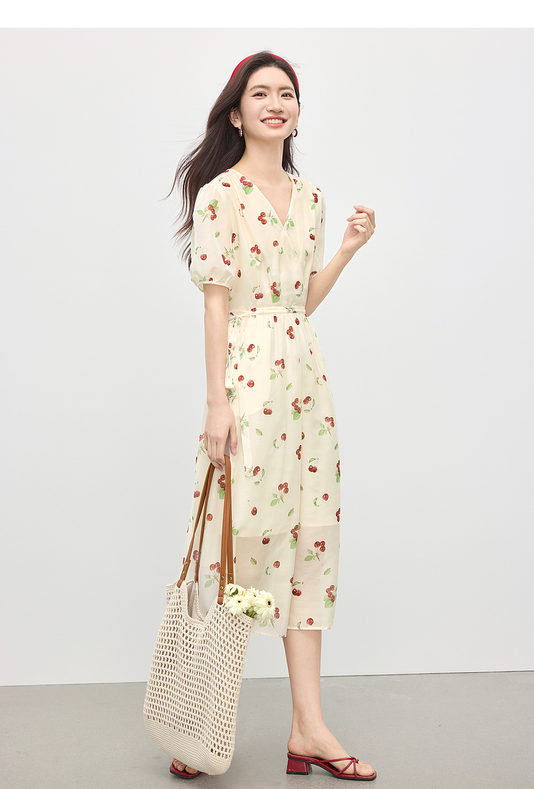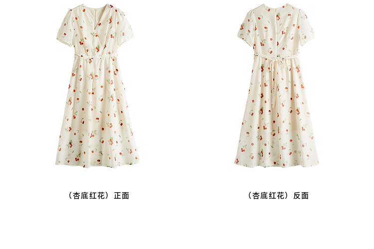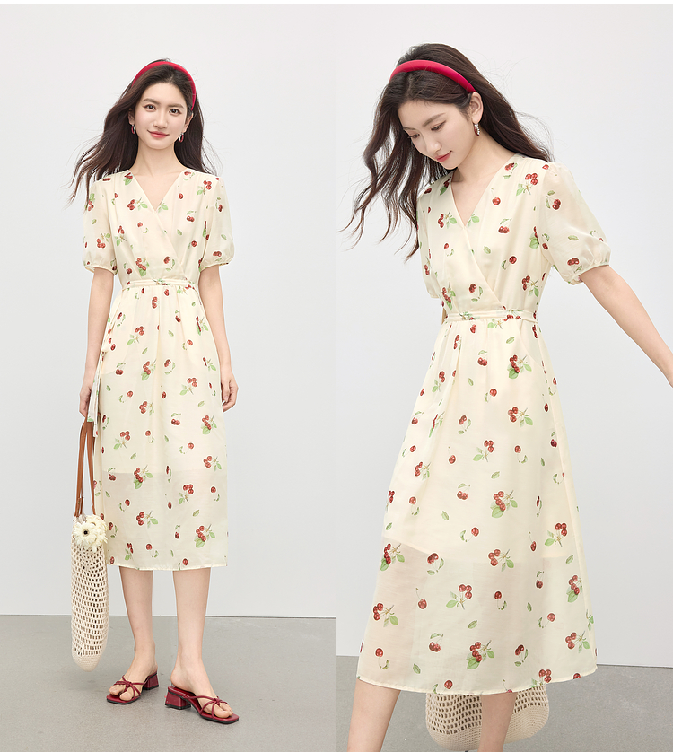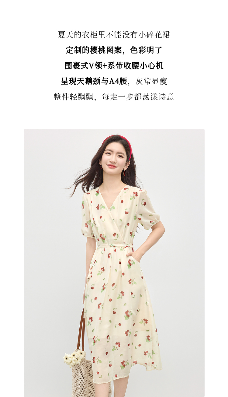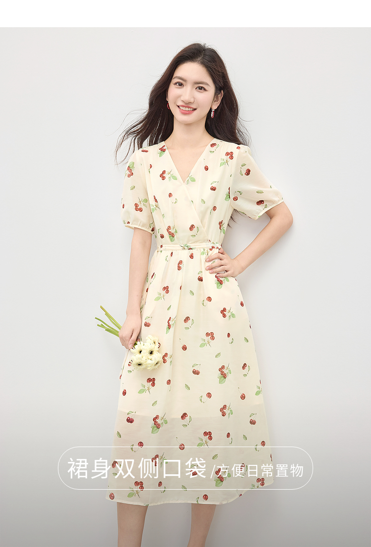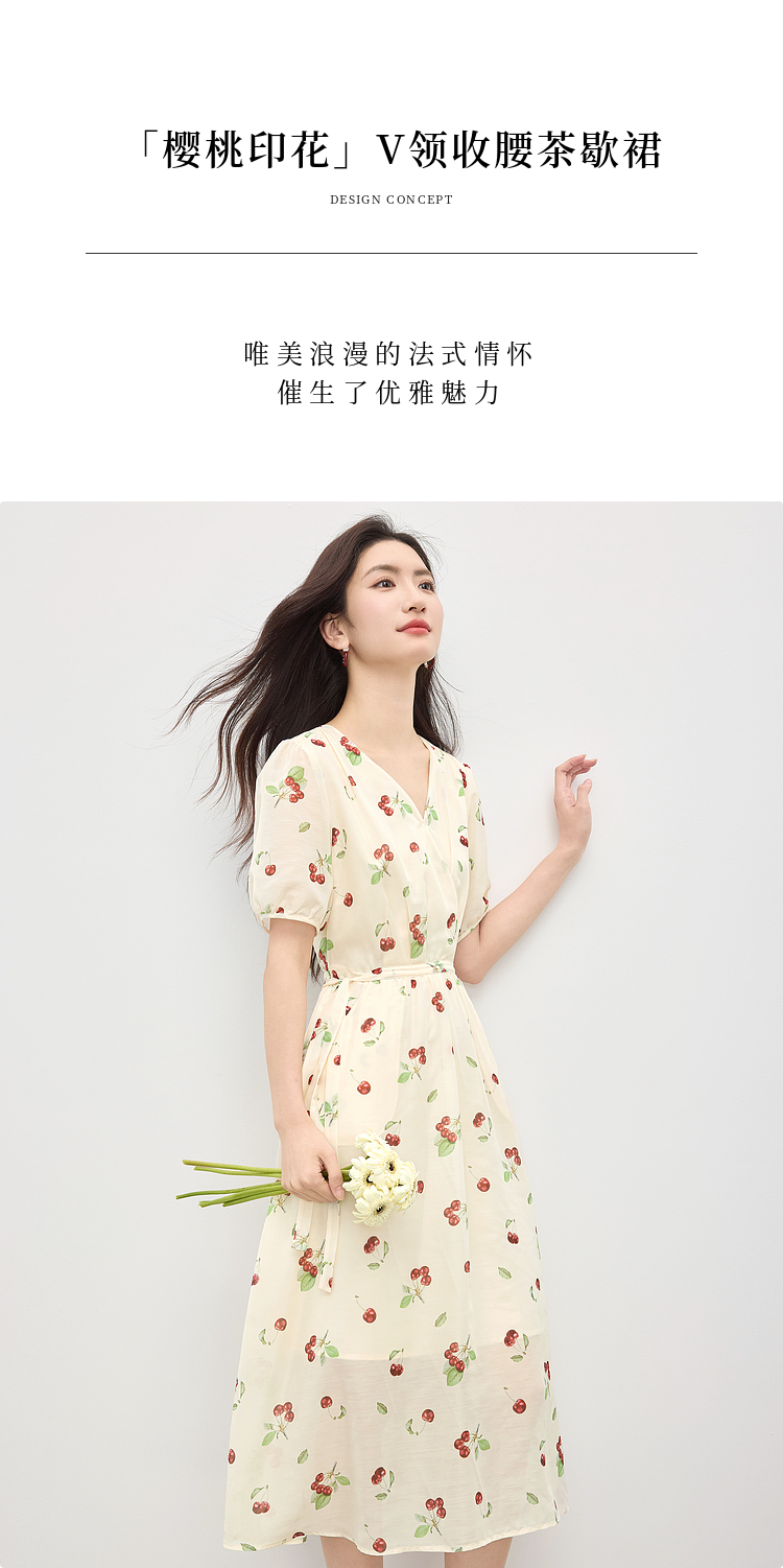 【专属特价】熙世界法式泡泡袖樱桃碎花连衣裙女夏季新款收腰显瘦V领茶歇裙子
