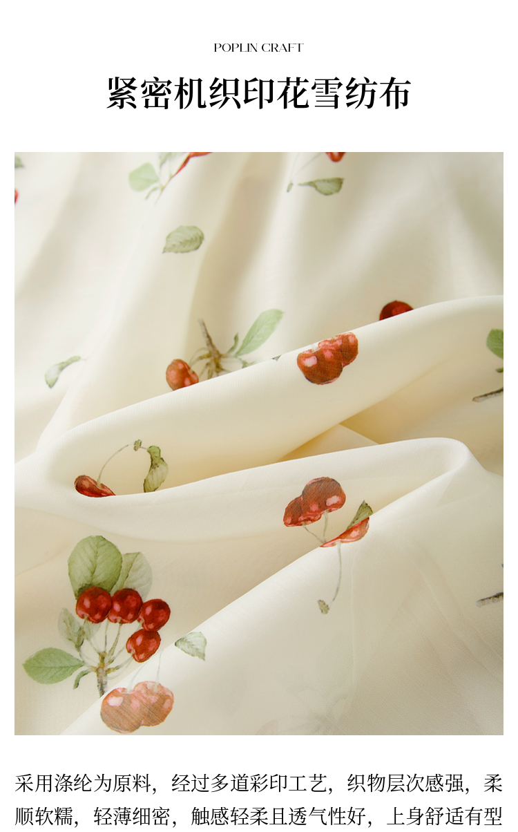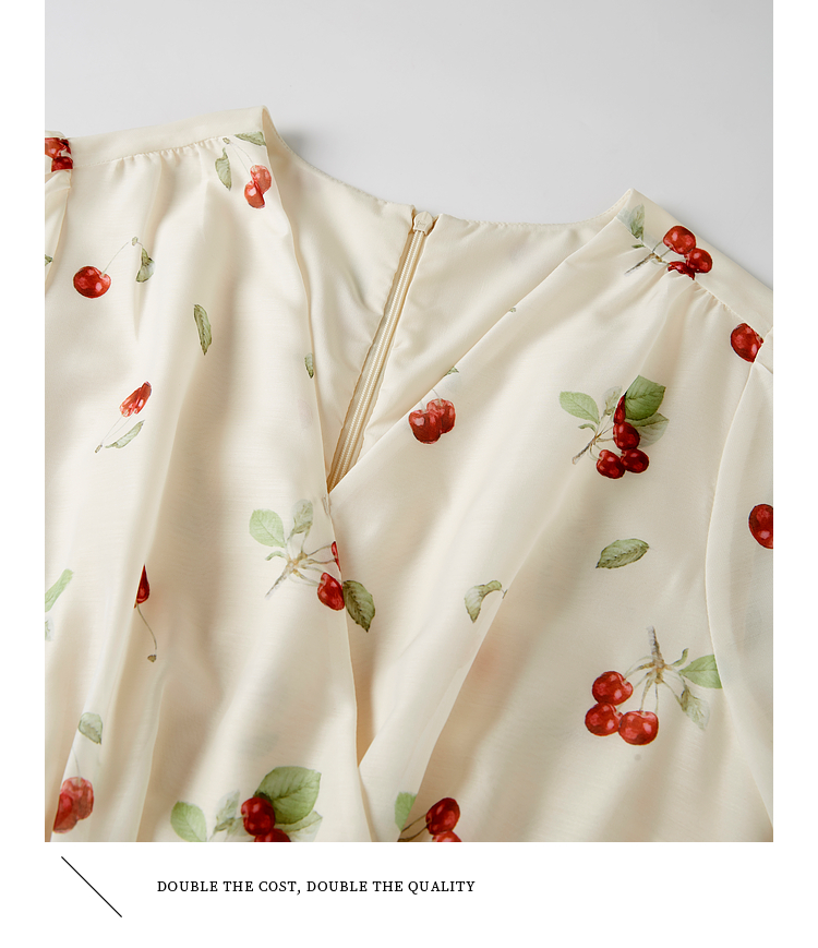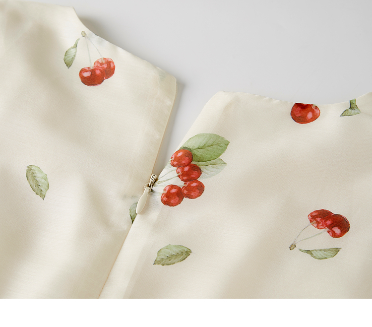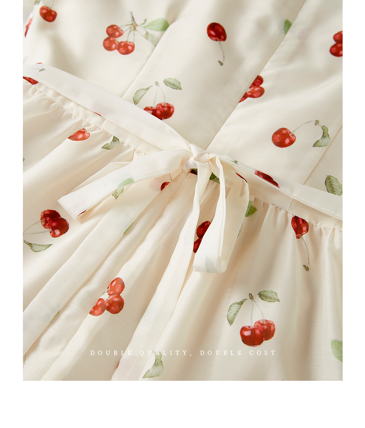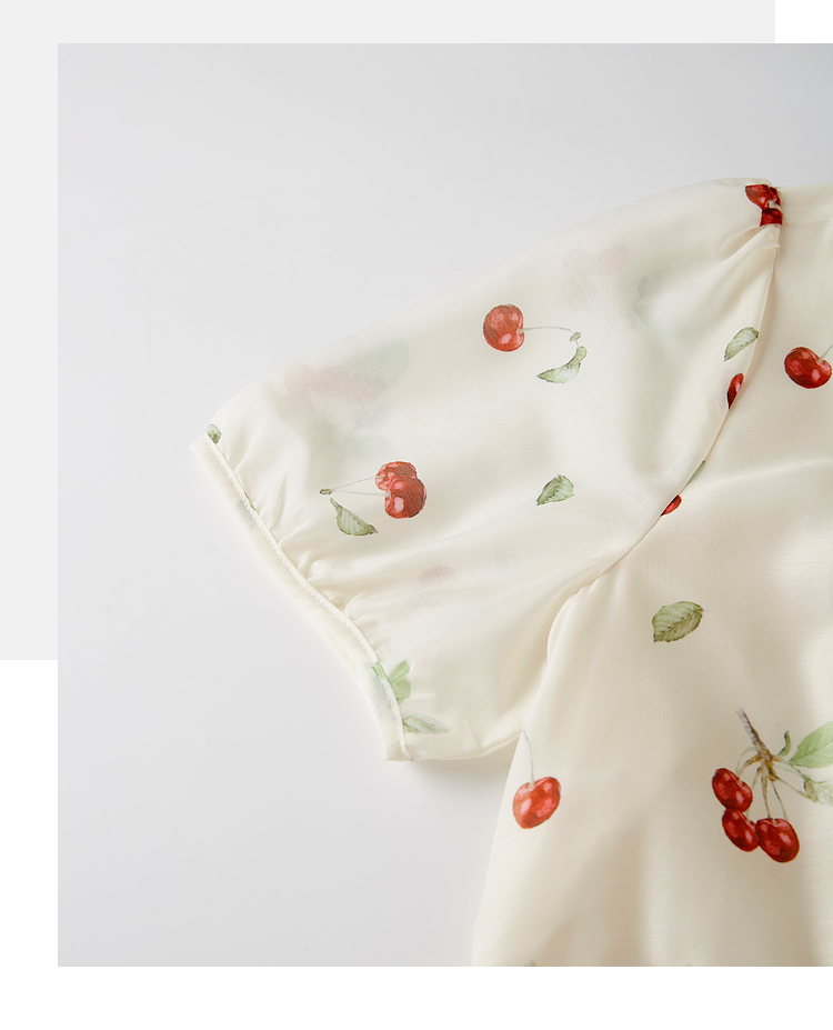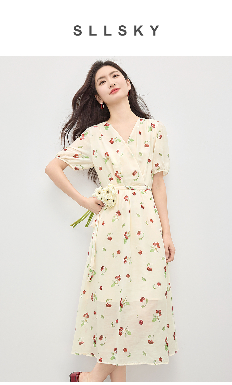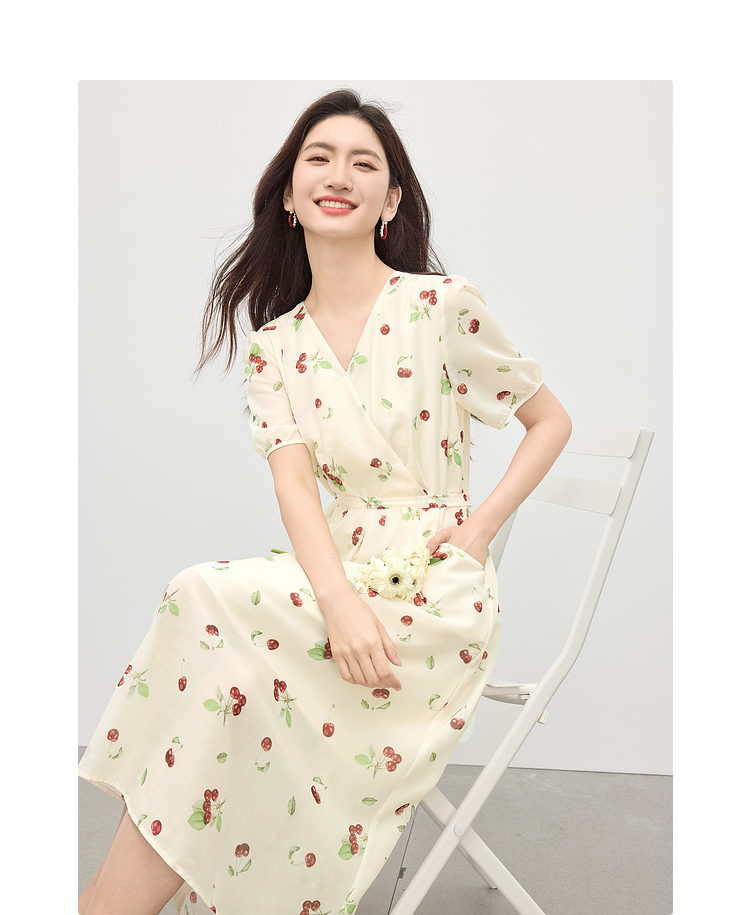 【专属特价】熙世界法式泡泡袖樱桃碎花连衣裙女夏季新款收腰显瘦V领茶歇裙子