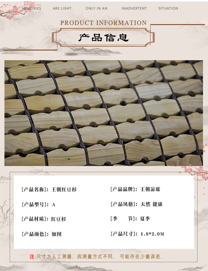 王朝红豆杉凉席精制而成,不仅让您受到夏日的夏爽,更能呵护您的健康