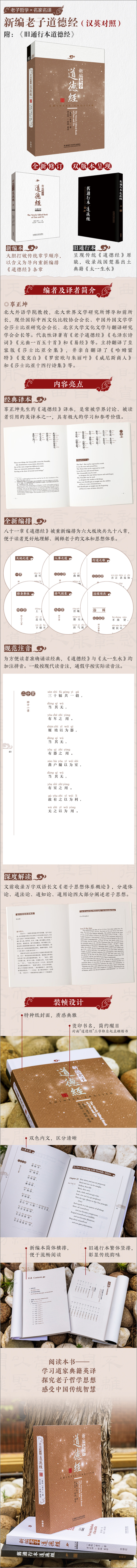 本书除文前收录万字长文《老子思想体系概论》外,还附有一册《旧通行本道德经(汉英对照)》,内含《郭店楚简〈老子〉简介》和郭店楚简《太一生水》。《旧通行本道德经》旨在呈现传统《道德经》(王弼本)原貌,可供读者单独或对照新编本阅读。《太一生水》是中国人关于宇宙成因的现存极其珍贵的文献,对探究道家思想也大有助益。为方便读者诵读经典,《道德经》与《太一生水》均加注拼音。