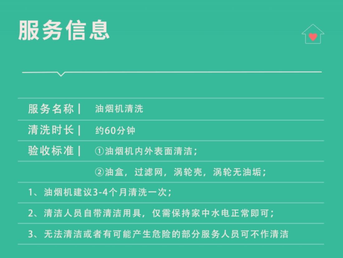 1.油烟机服务,上门服务时间为8:00-12:00,14:00-18:00,超出时间暂无法提供服务,请根据家庭情况预约合适人员上门!如遇服务旺季,请提前预约,以免耽误您的排程;